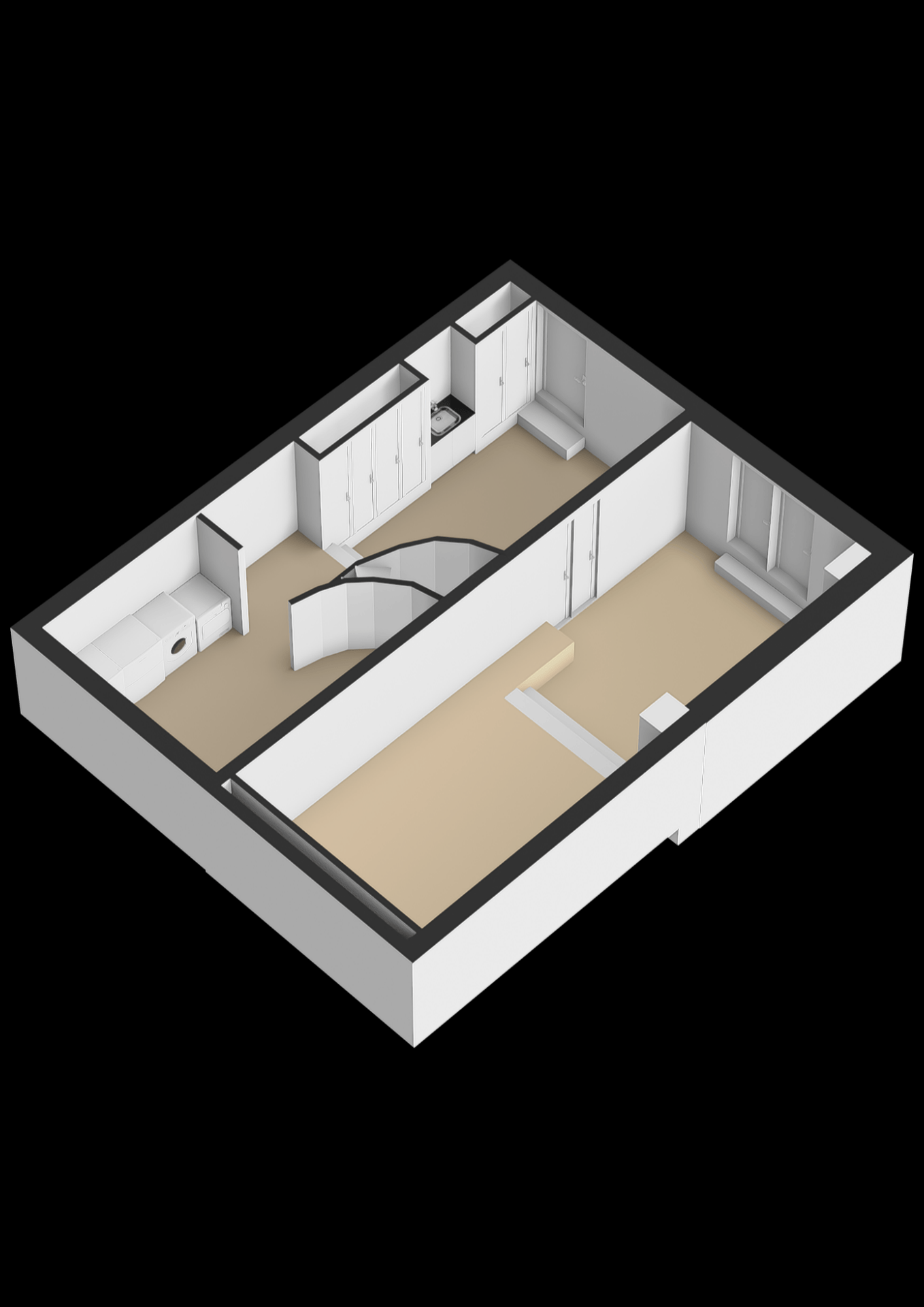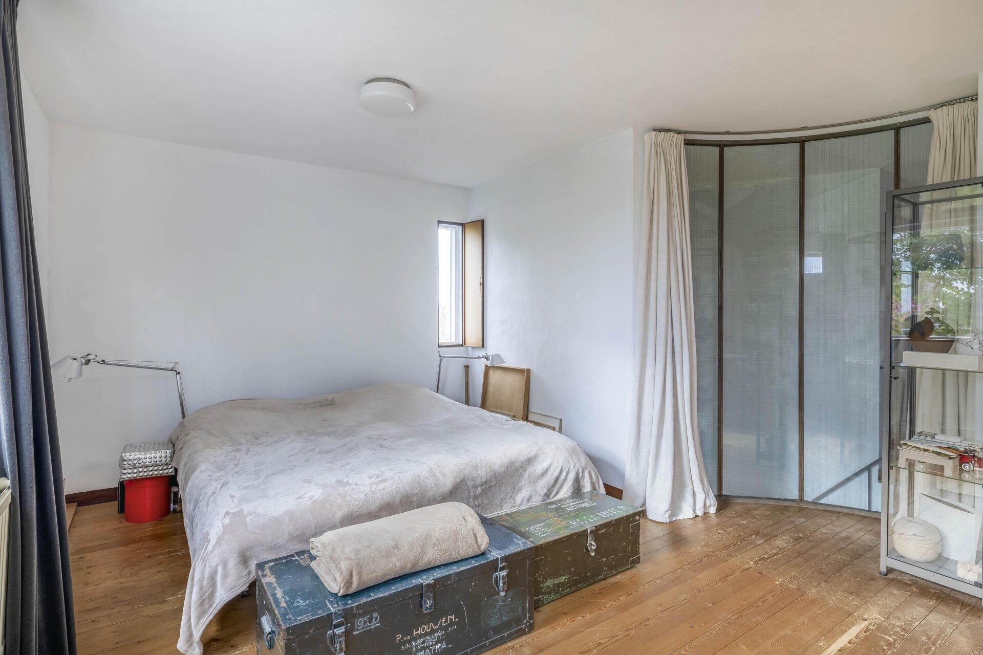 Daarnaast zijn er twee ruime bergingen, ideaal voor opslag, fietsen of gereedschap. In één van de bergingen bevinden zich tevens de aansluitingen voor wasmachine en droger. De hoogteverschillen in het souterrain (tot circa 2,30 m) geven de ruimte een speels karakter en benadrukken het unieke ontwerp van het huis.