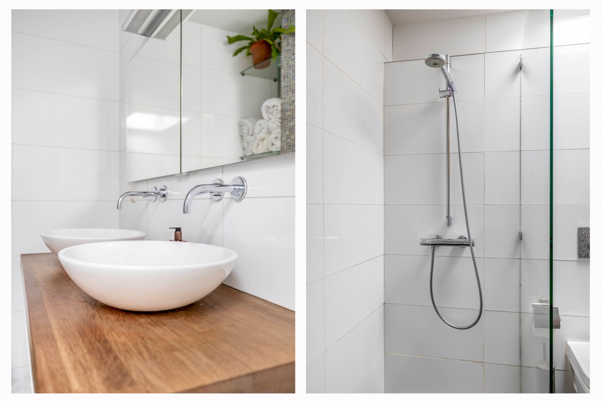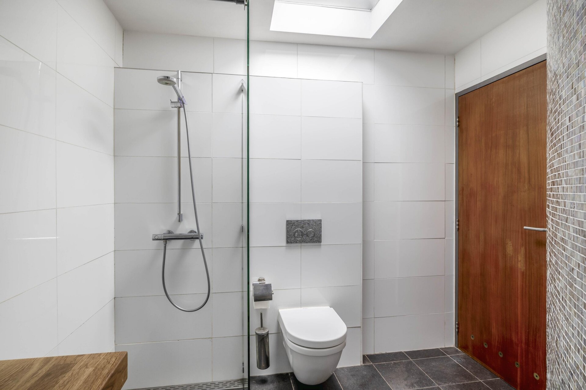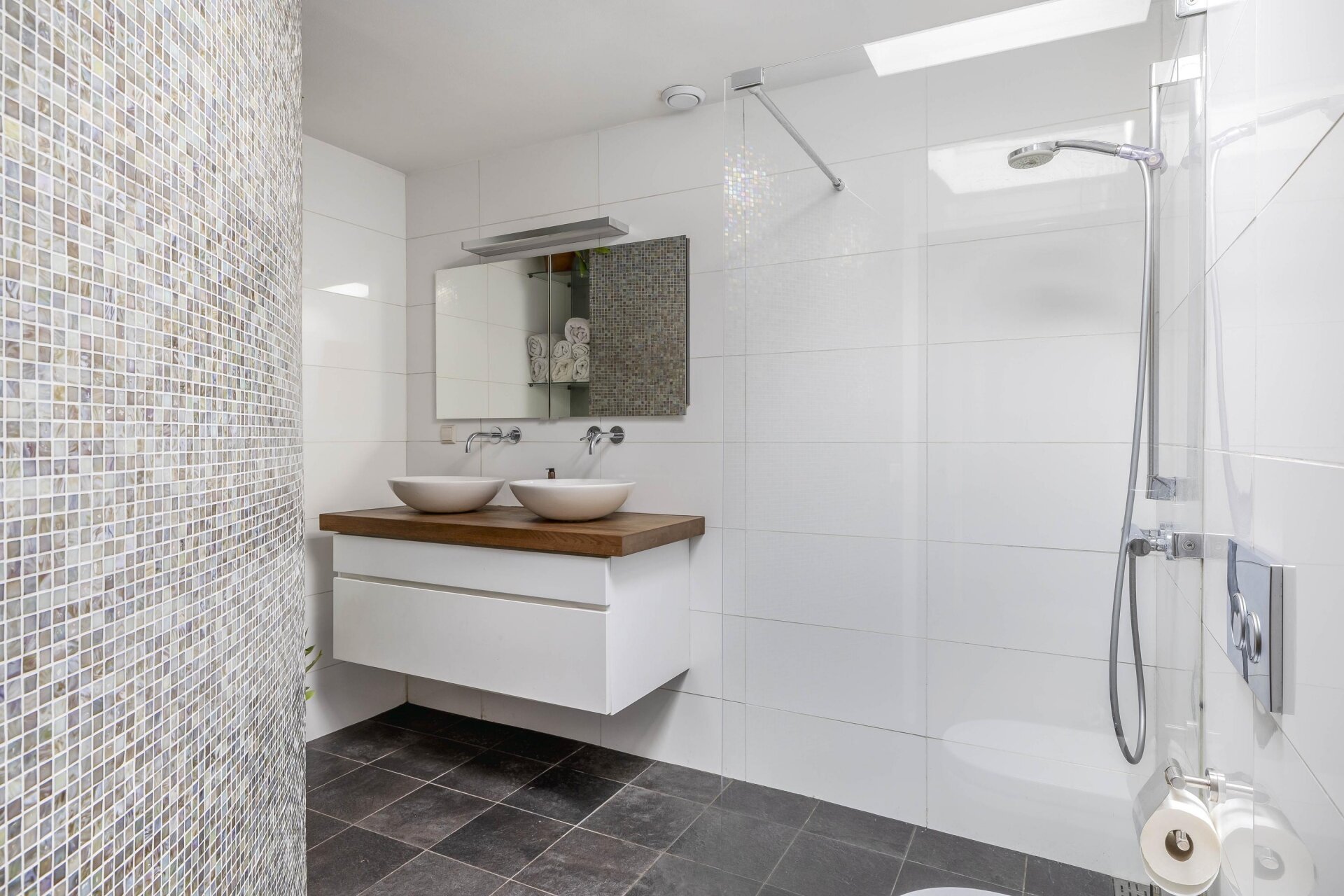 De badkamer is modern uitgevoerd met witte wandtegels, een inloopdouche, een dubbele wastafel met houten blad en een toilet. De afwerking met mozaïektegels zorgt voor een stijlvolle en tijdloze uitstraling.