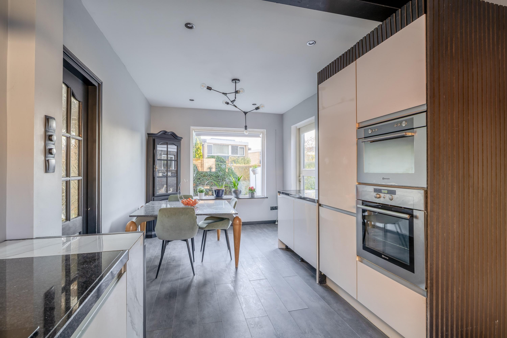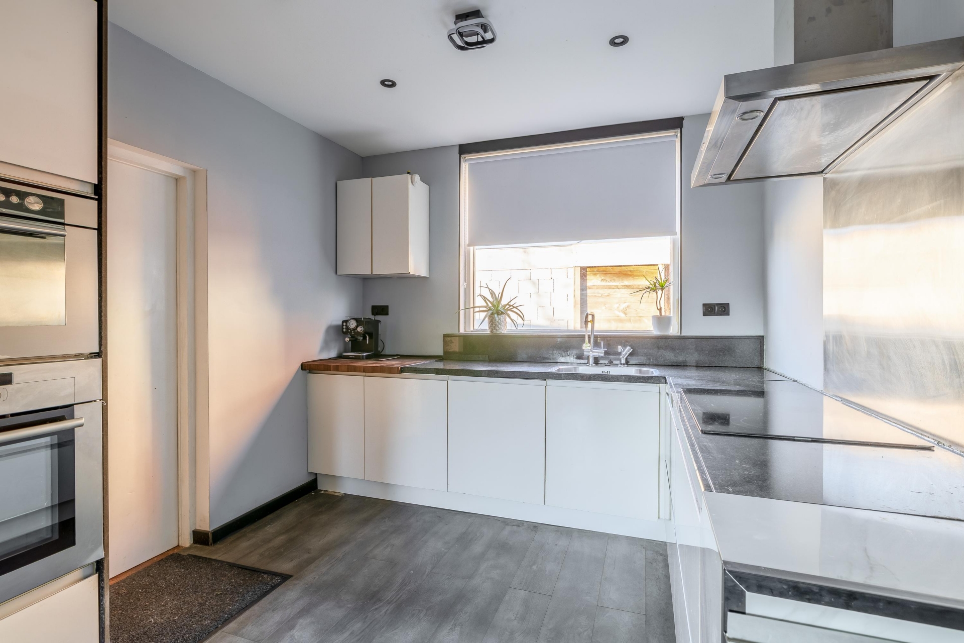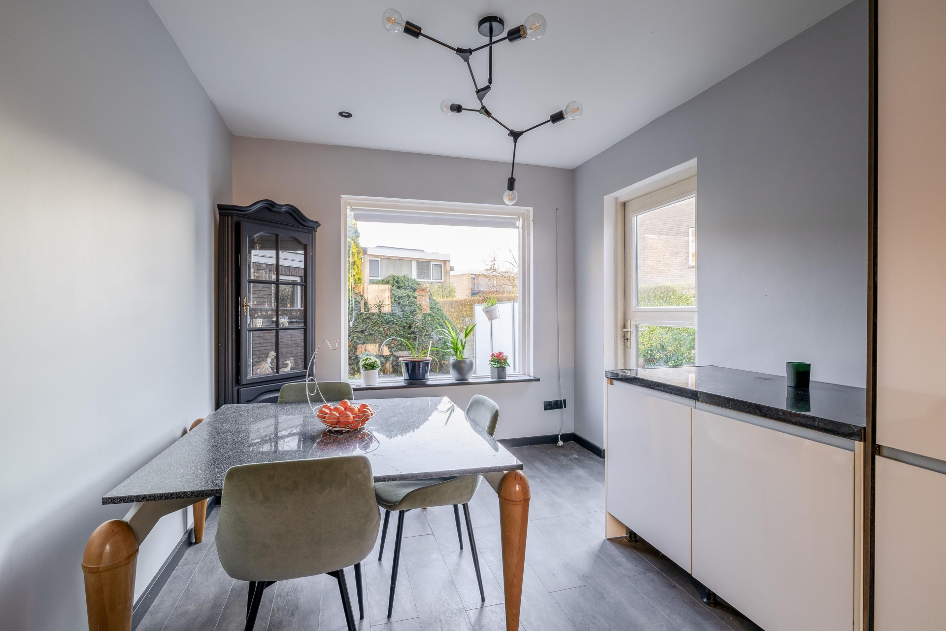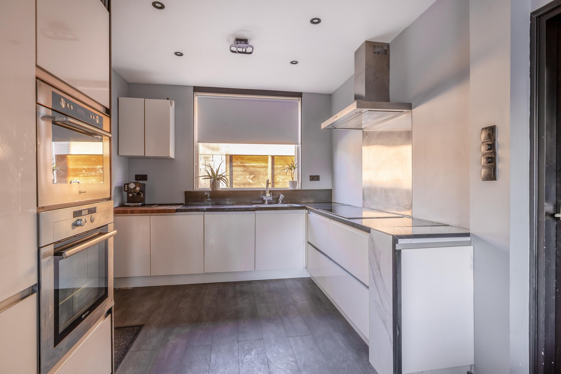 Bij binnenkomst valt meteen op hoe ruim en licht de woonkamer is. Dankzij de grote raampartijen aan twee zijden geniet je hier de hele dag van natuurlijk licht. Er is meer dan genoeg plek voor een royale zithoek en een flinke eettafel. De vloer is neutraal uitgevoerd en de wanden zijn strak afgewerkt, dus je kunt hier vrij snel je eigen stijl doorvoeren. Vanuit de woonkamer kijk je uit over de groene tuin rondom het huis – een fijne plek om tot rust te komen. Via de hal bereik je de gesloten keuken, die praktisch is ingedeeld en voorzien is van diverse inbouwapparatuur. De keuken biedt zicht op de achtertuin en directe toegang tot buiten, wat het praktisch maakt voor wie graag buiten eet of tuiniert.