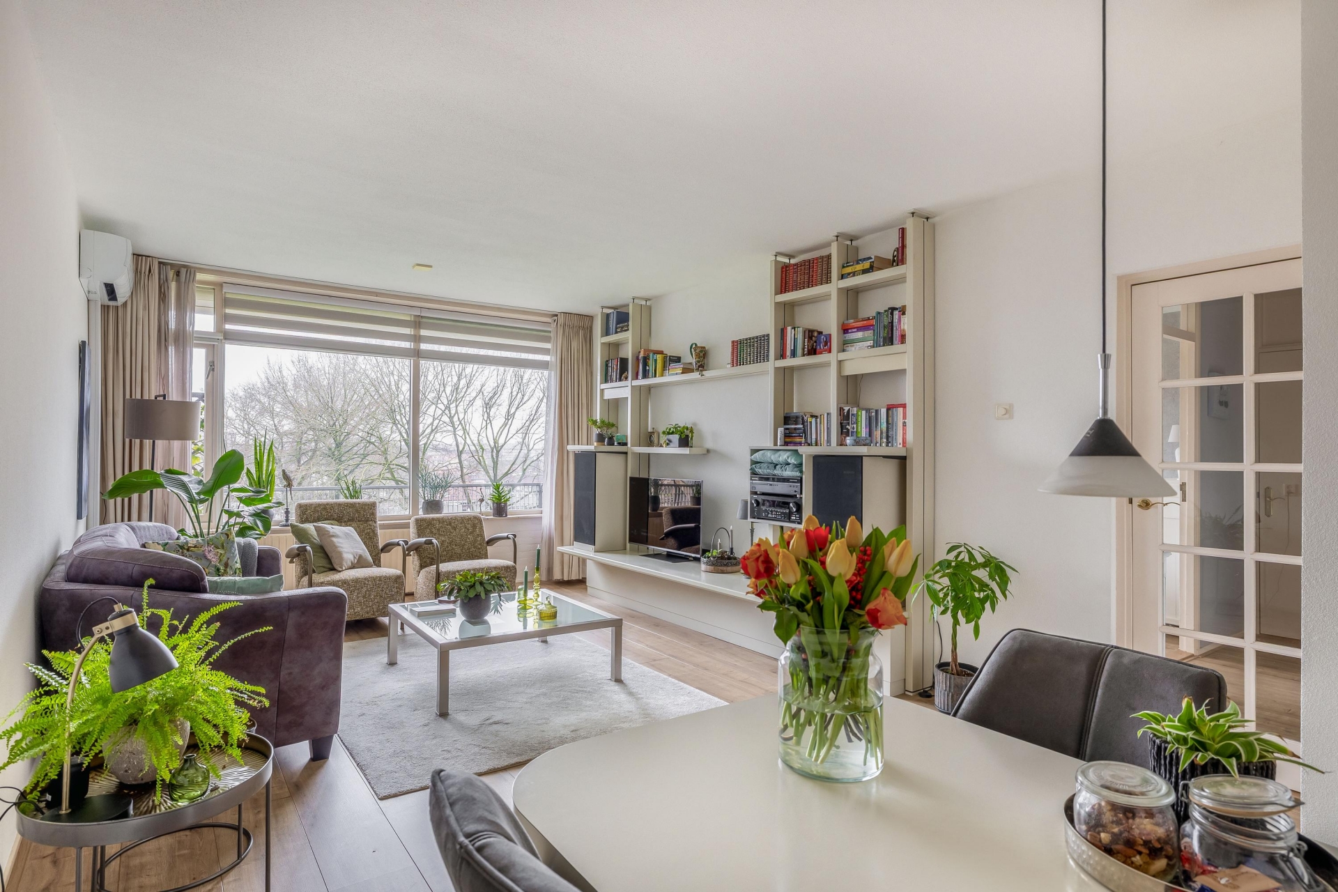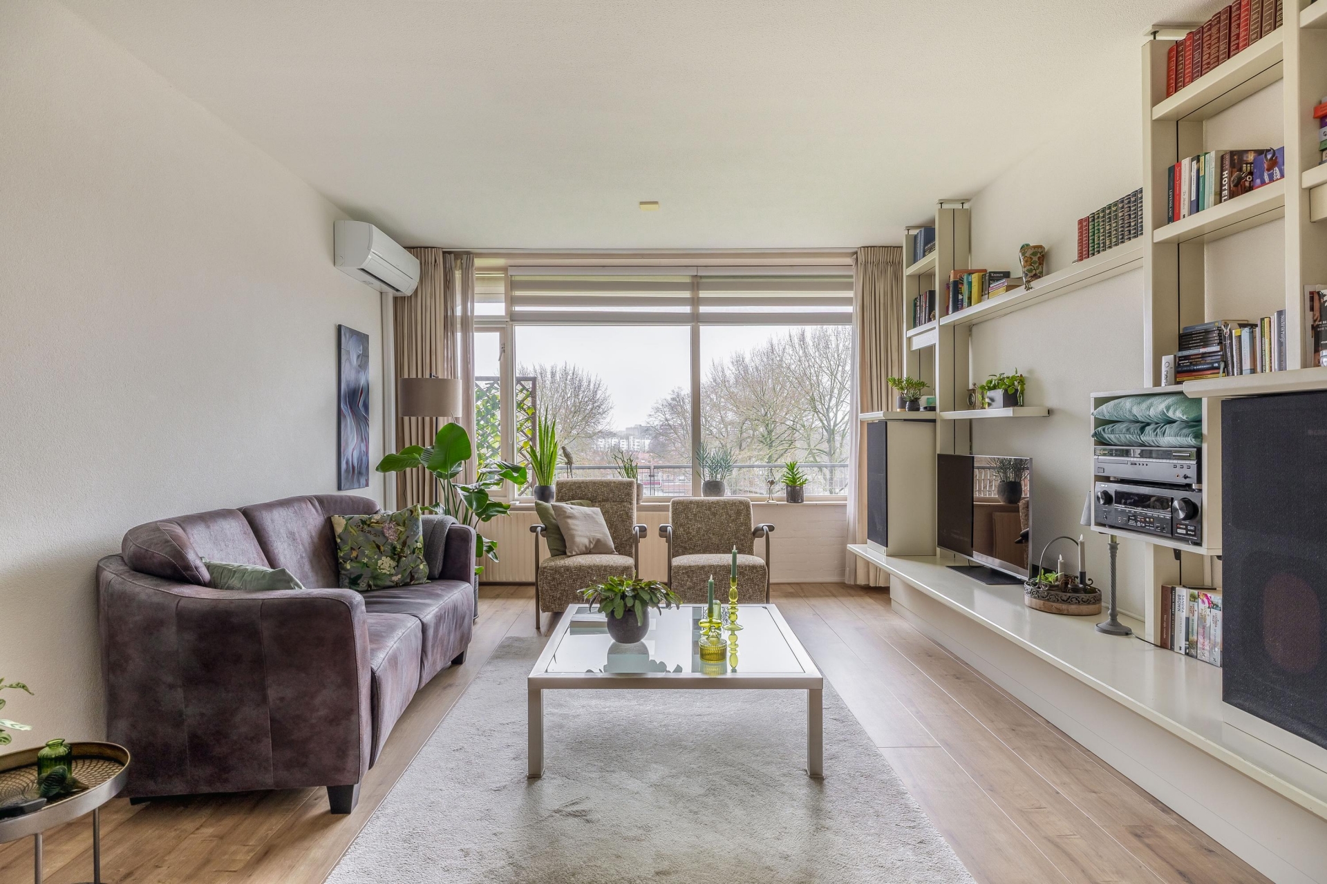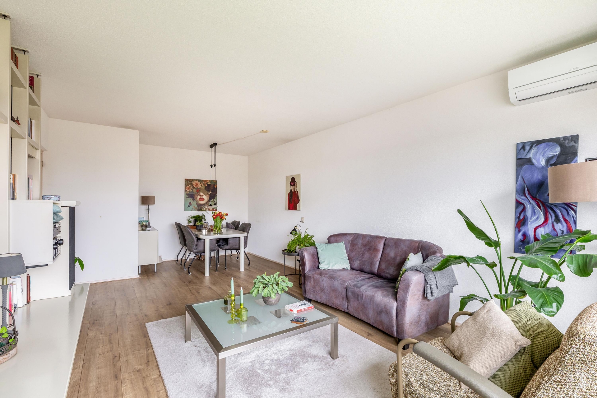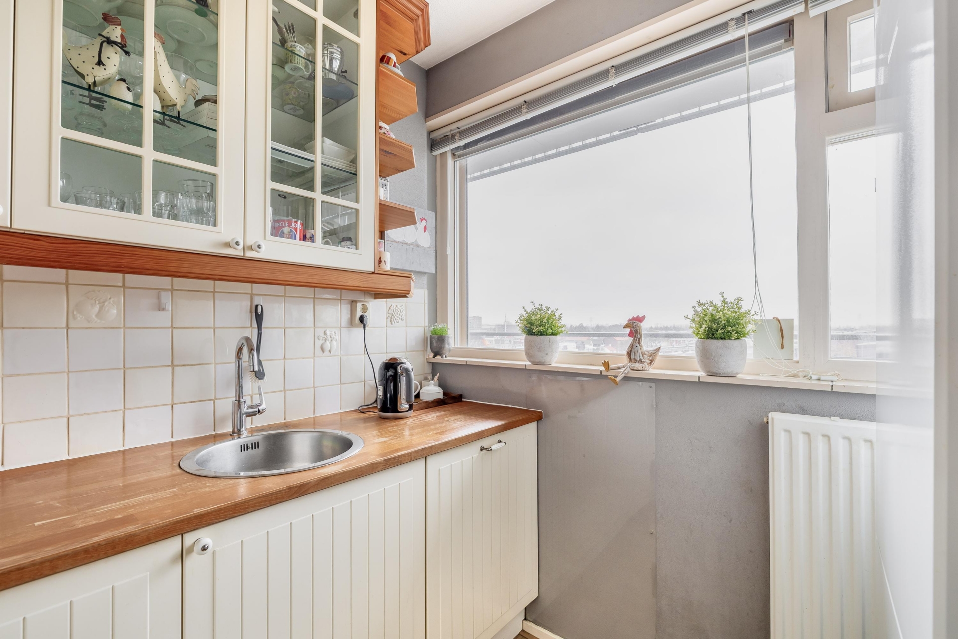 De lichte woonkamer heeft grote raampartijen en biedt een prettig uitzicht en veel daglicht. De keuken bevindt zich aan de galerijzijde en is uitgevoerd in een praktische hoekopstelling met diverse inbouwapparatuur.