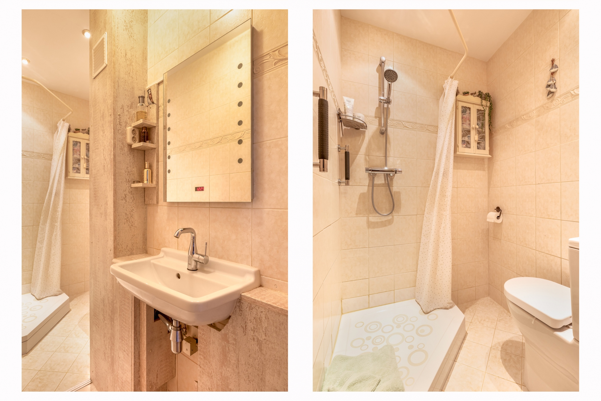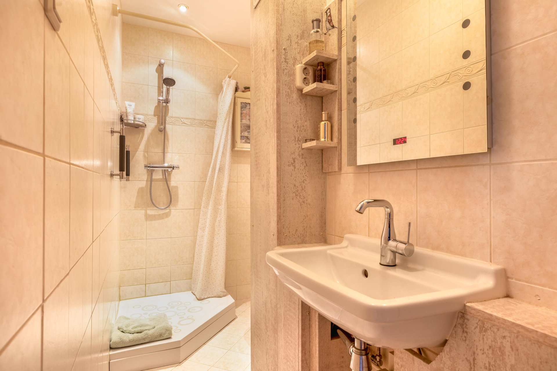 De badkamer is volledig betegeld. Je vindt hier een douche, een wastafel en het toilet.