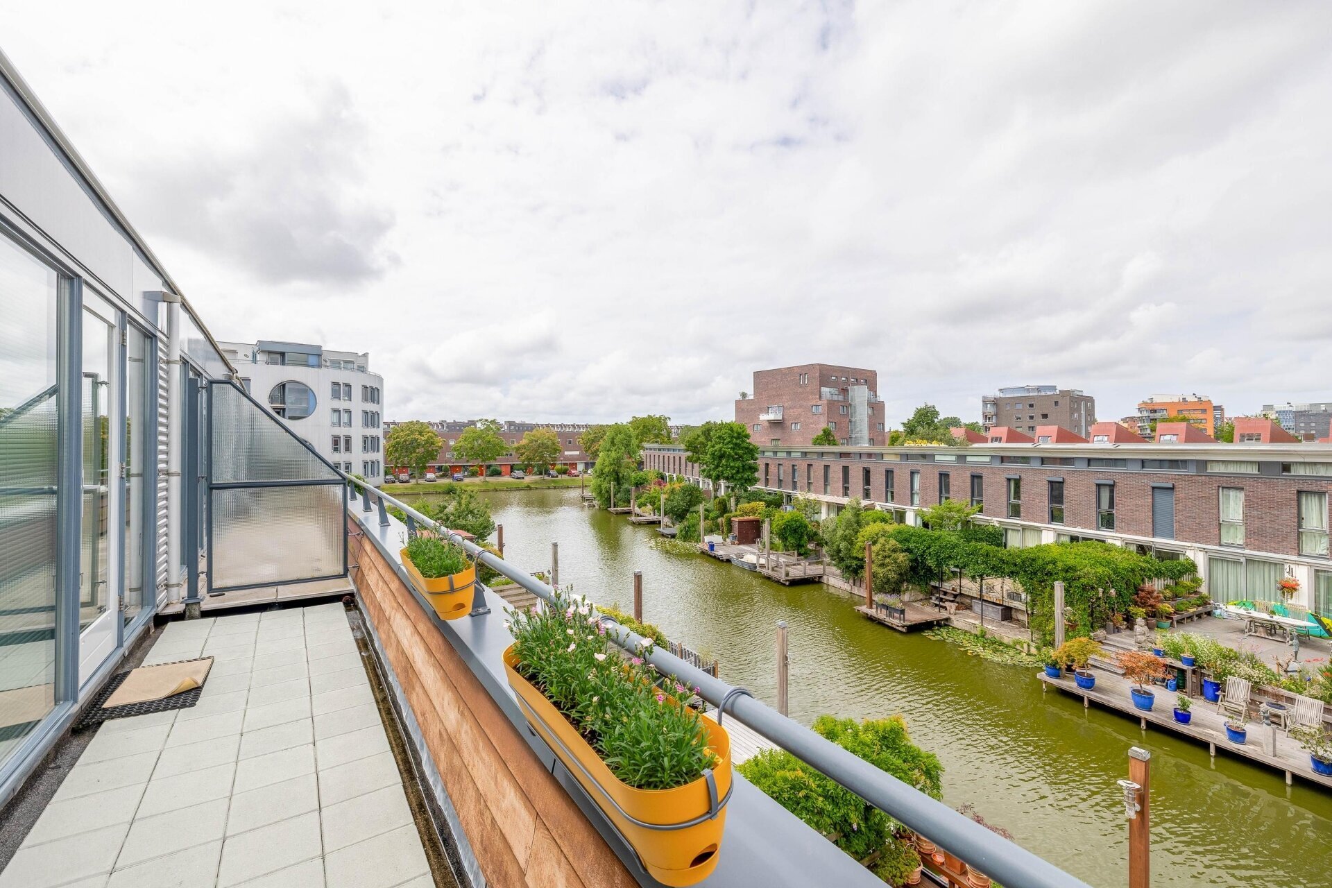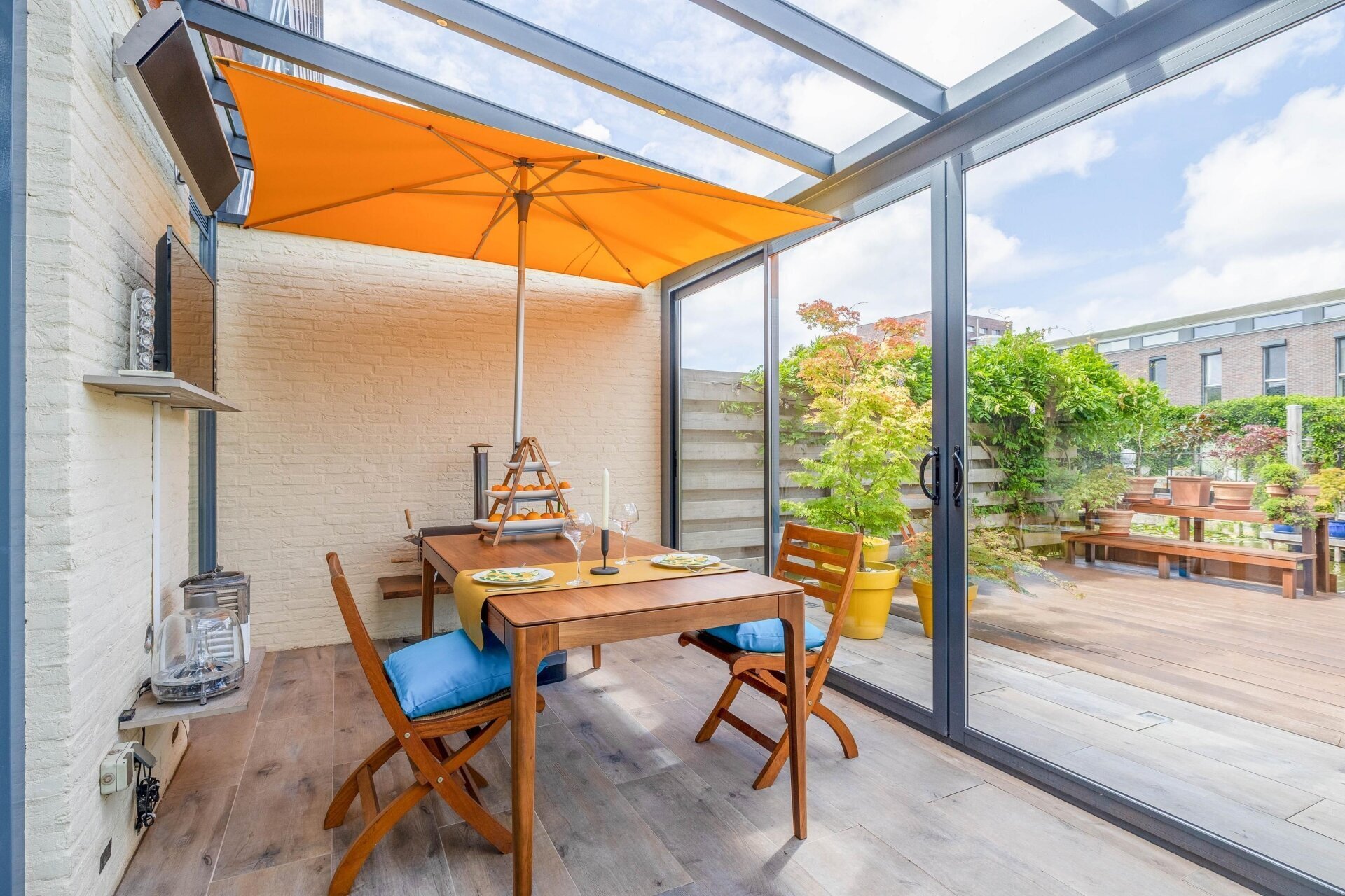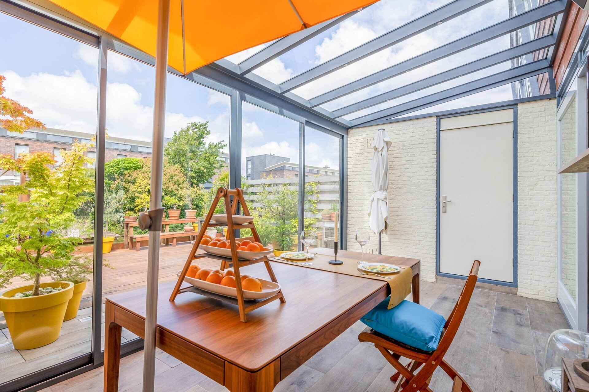 De serre (met infrarood verwarming) heeft een glazen schuifpui naar de zonnige achtertuin/terras, over de volle breedte van de woning en gelegen op het zuidwesten, met een trap naar de lager gelegen vlonder/steiger aan het water, waar u een bootje kunt aanleggen. De vloer van de serre loopt door naar buiten, met vloerverlichting, de tuin is voorzien van een hardhouten vlonder.