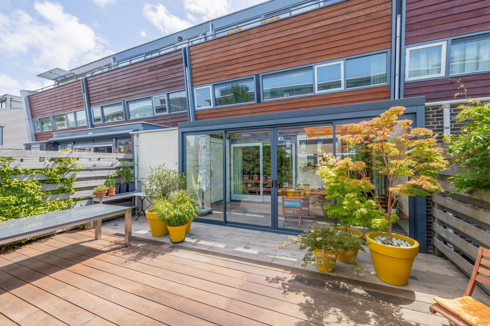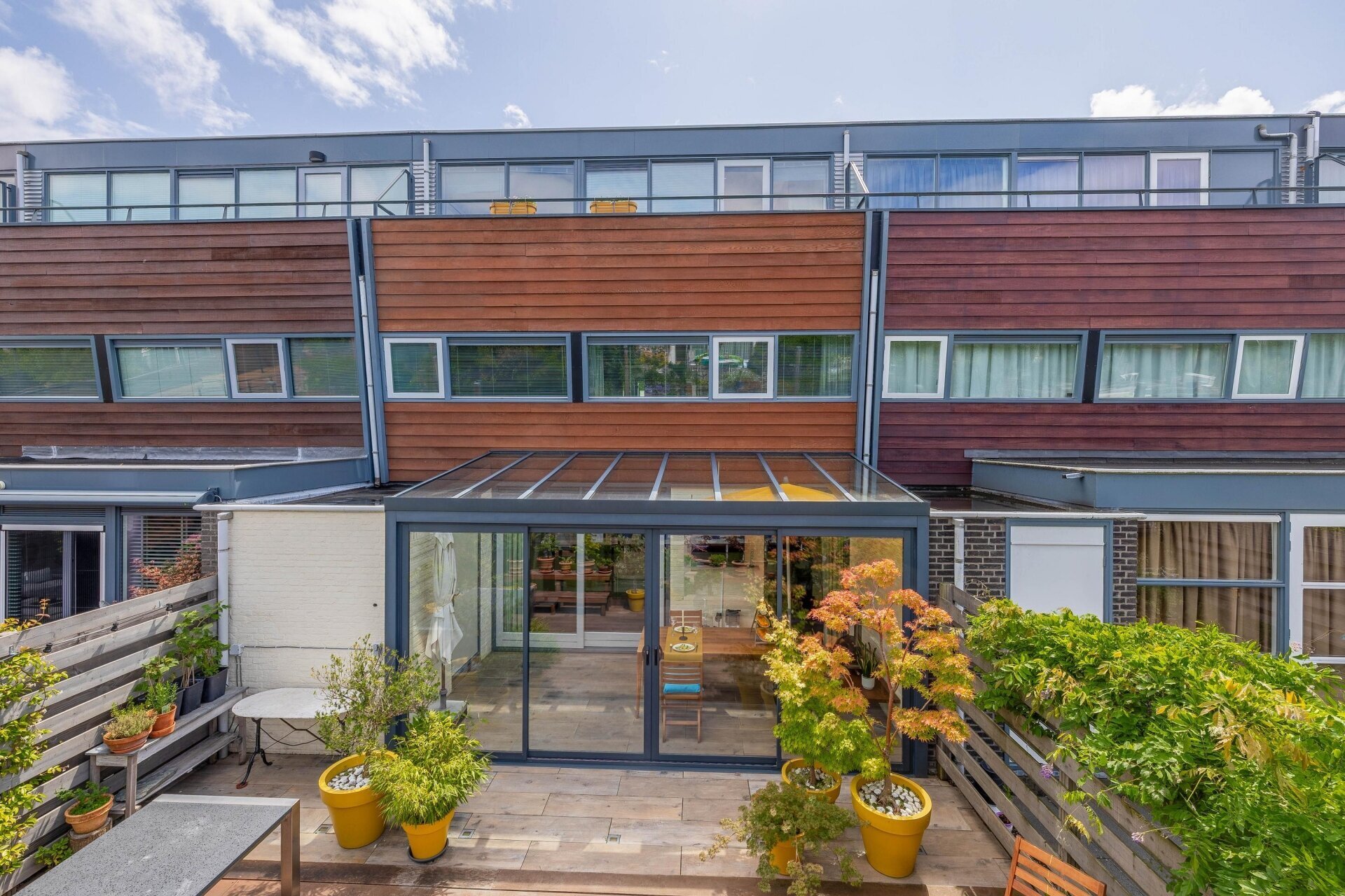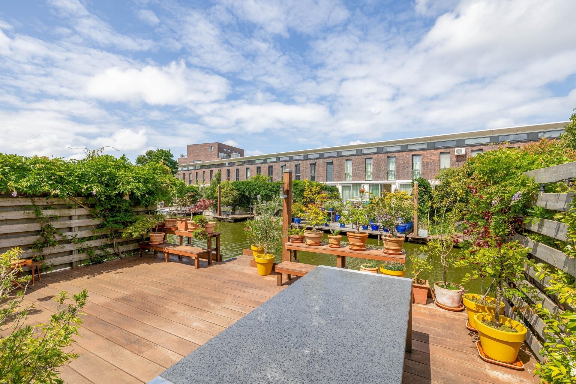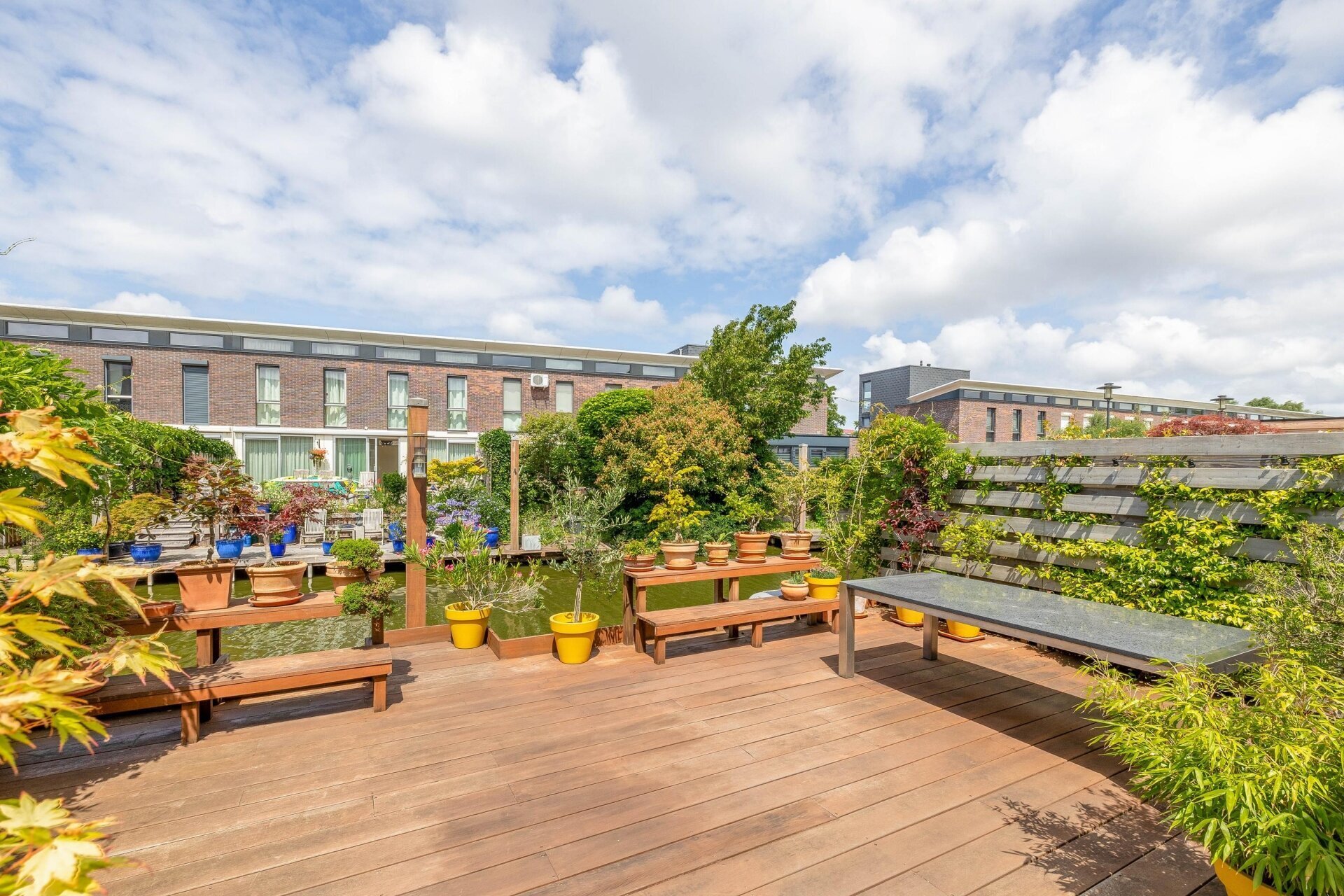 De serre (met infrarood verwarming) heeft een glazen schuifpui naar de zonnige achtertuin/terras, over de volle breedte van de woning en gelegen op het zuidwesten, met een trap naar de lager gelegen vlonder/steiger aan het water, waar u een bootje kunt aanleggen. De vloer van de serre loopt door naar buiten, met vloerverlichting, de tuin is voorzien van een hardhouten vlonder.