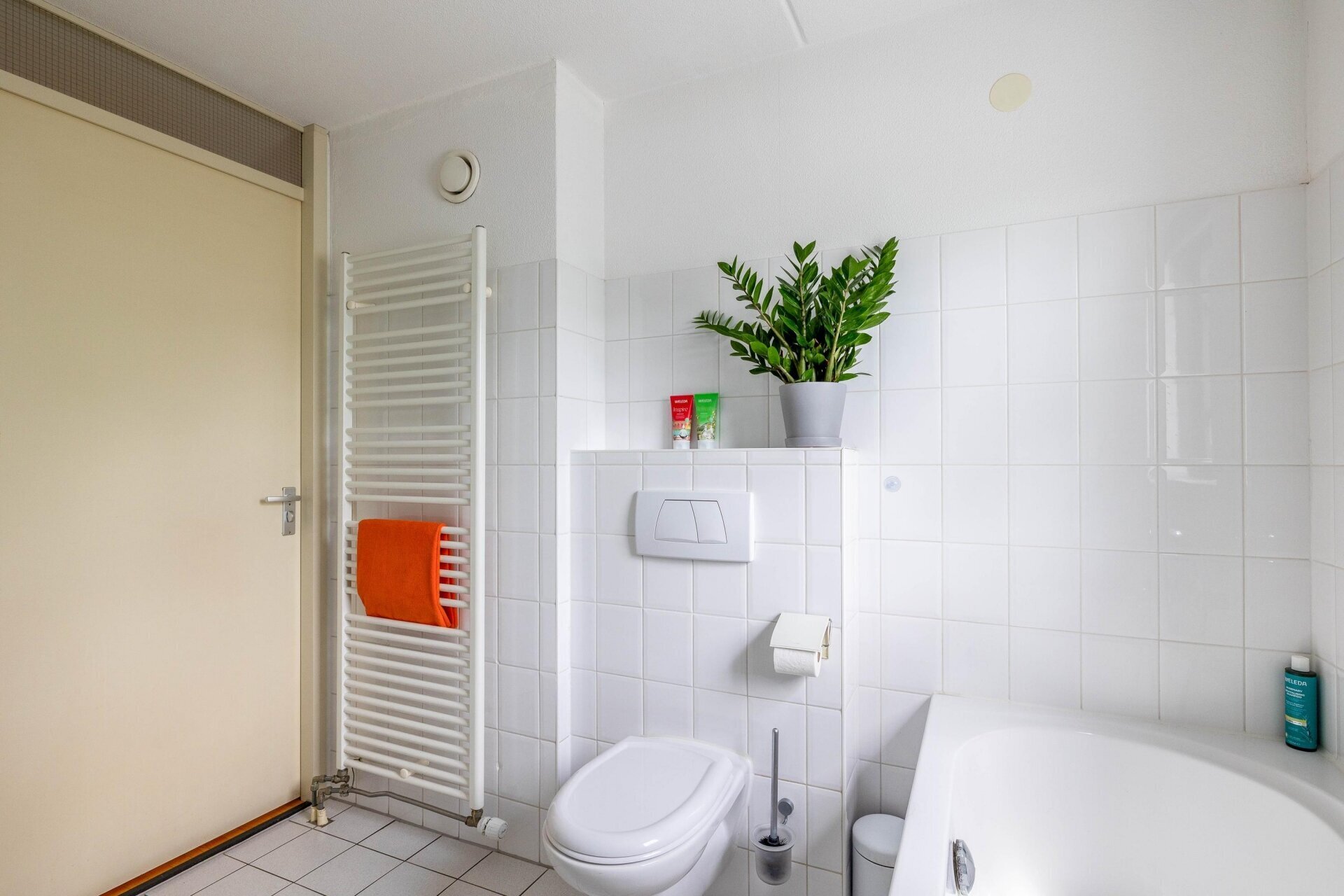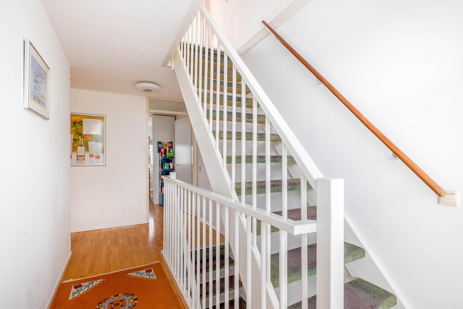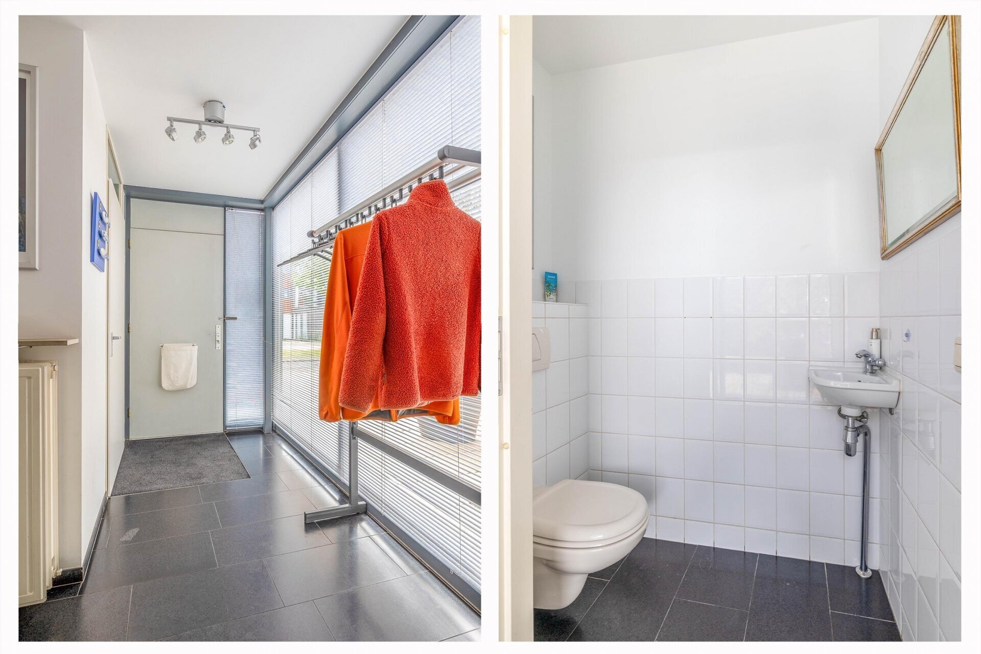 Voortuin met eigen parkeerplaats. Entree van de woning via de hal met toegang naar het toilet en de ruime berging met opstelplaats combi-ketel, meterkast, mechanische ventilatie en aansluiting wasmachine. De berging heeft vloerverwarming en is zowel van binnenuit als van buitenaf bereikbaar, handig voor de fietsen.