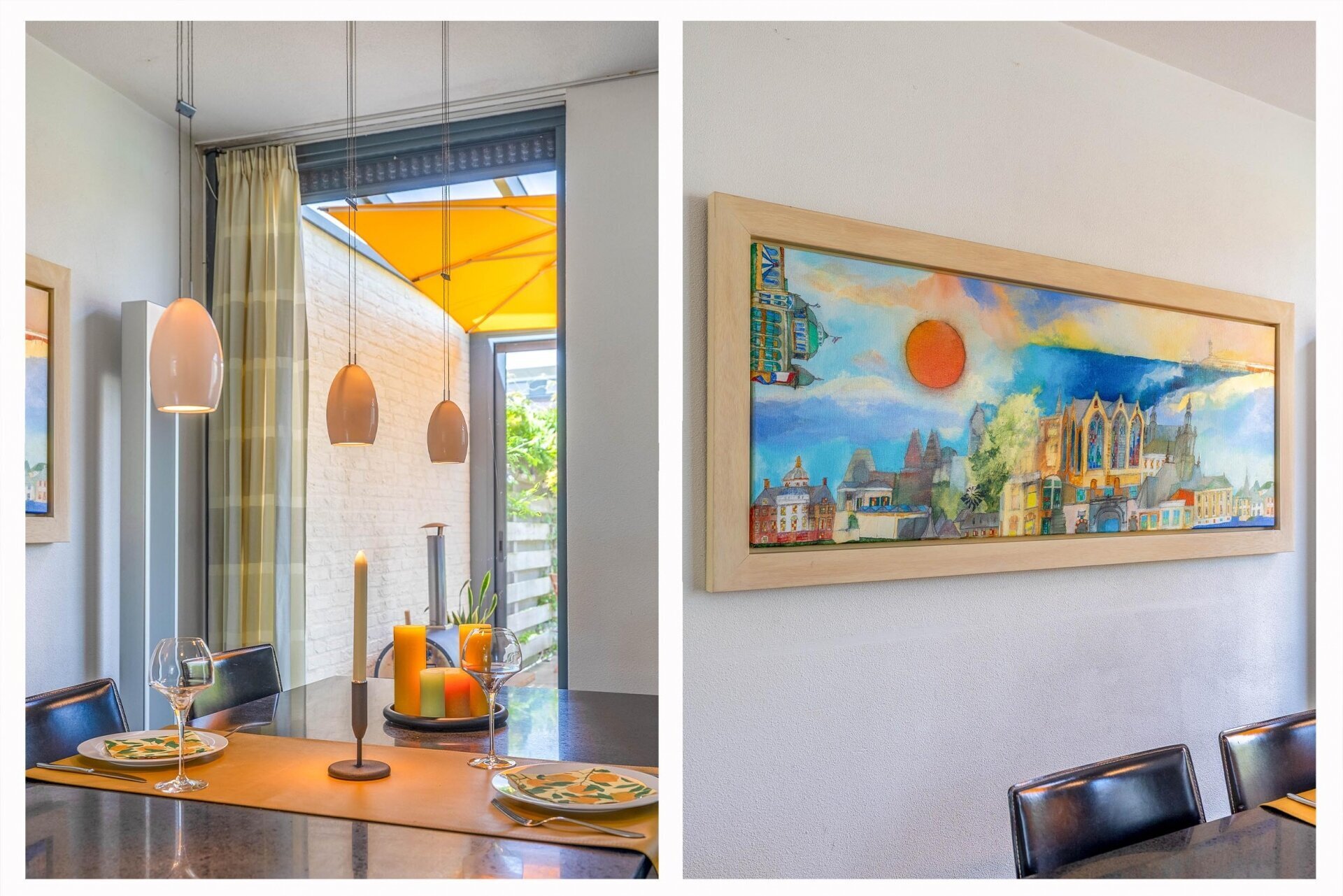 Wonen op een eiland, dat sprak ons wel aan, en ook de bijzondere architectuur, ik was meteen verliefd op het huis. Het huis is licht, ruim en ligt met de achtertuin aan het water, we hebben daar later de serre laten aanbouwen, waar je bij de eerste zonnestralen in het voorjaar al kunt zitten, heerlijk.