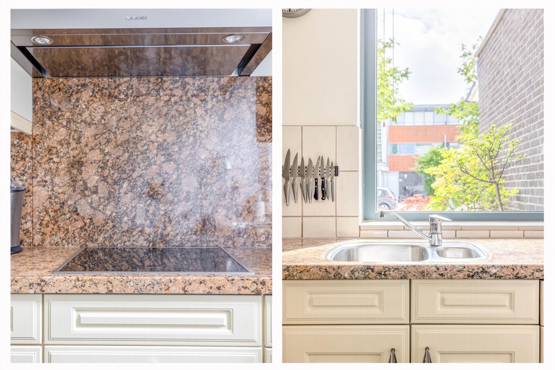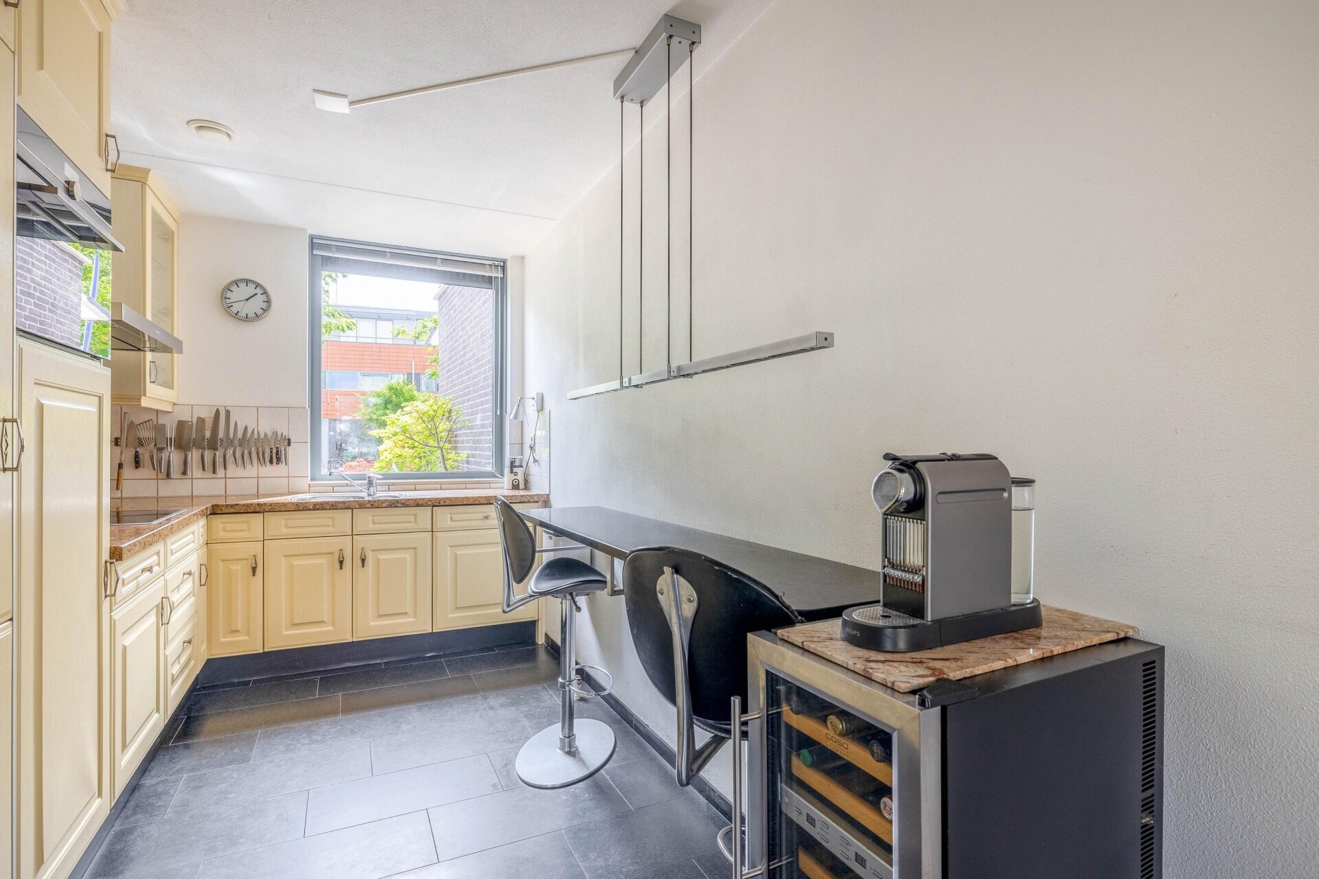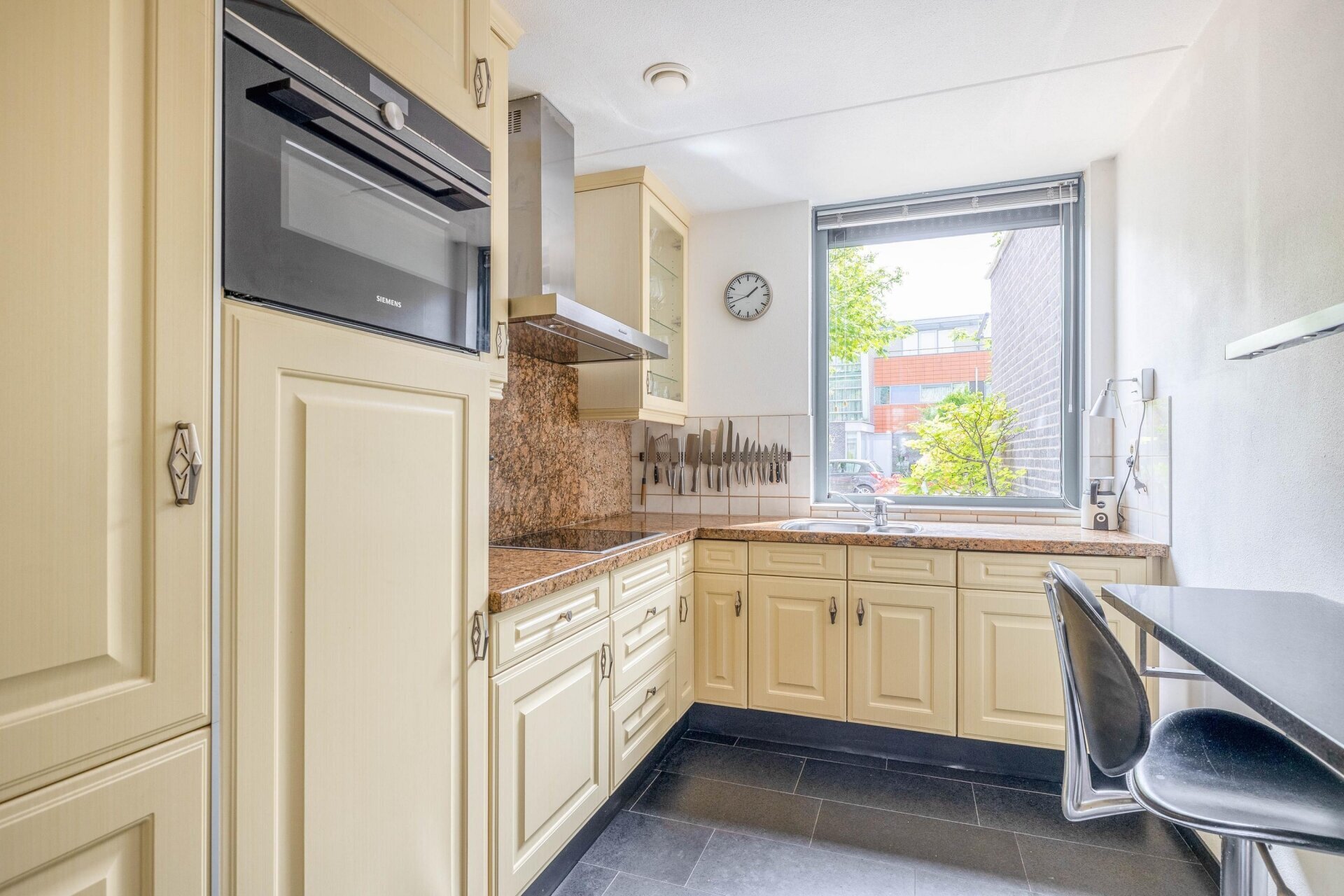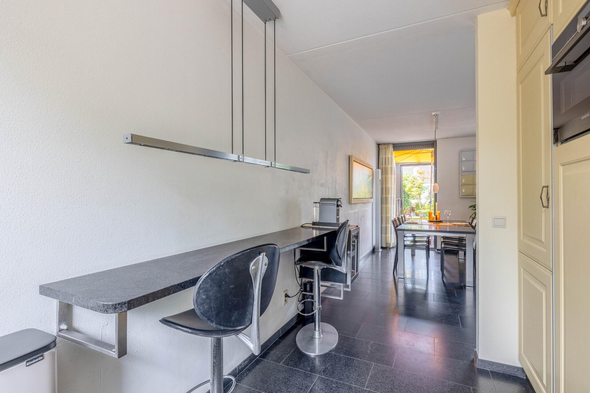 De half open keuken ligt aan de voorzijde van de woning en is voorzien van een granieten aanrechtblad, inductie kookplaat, afzuigkap + mechanische ventilatie, combi-oven, vaatwasser en koel-/vriescombinatie.