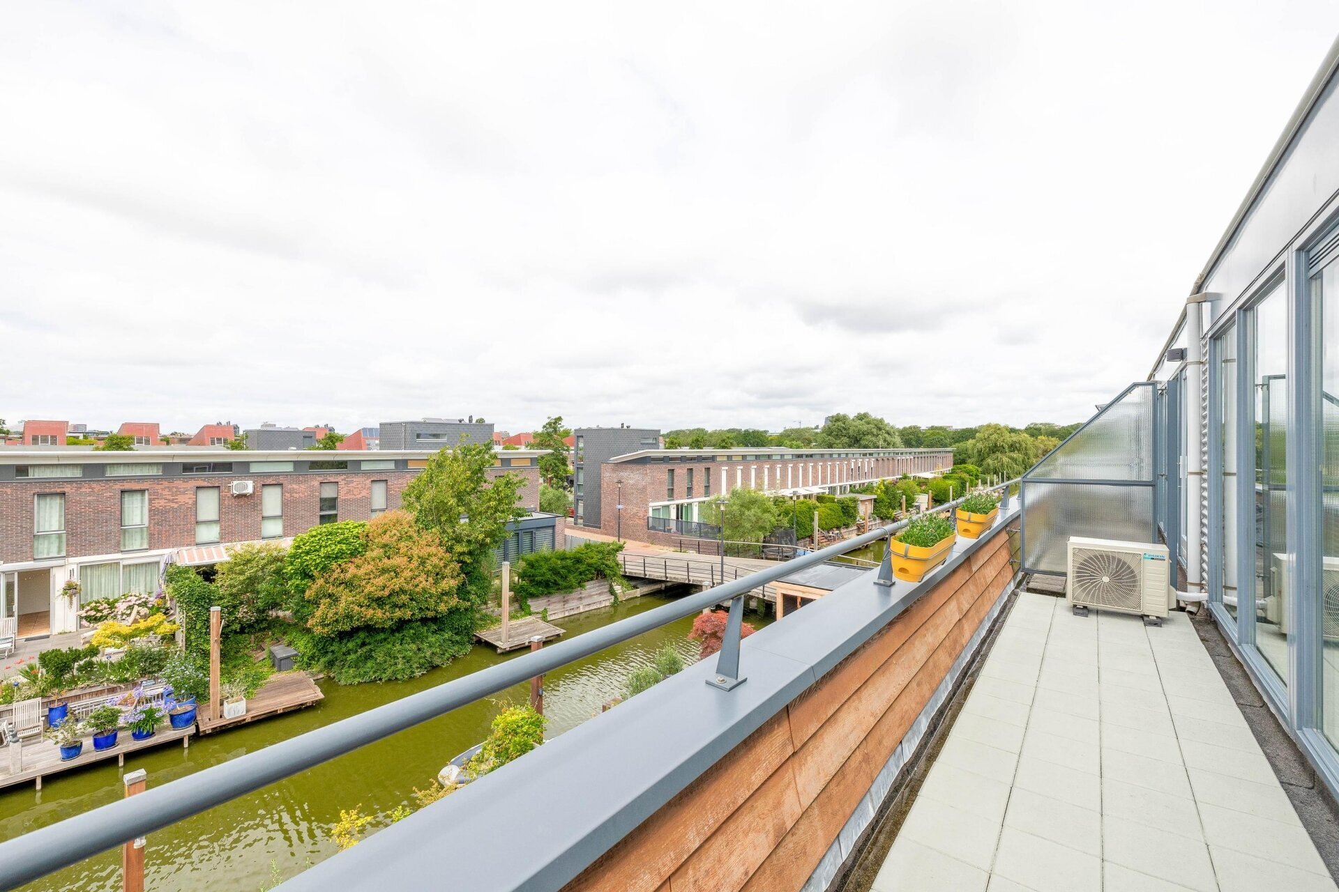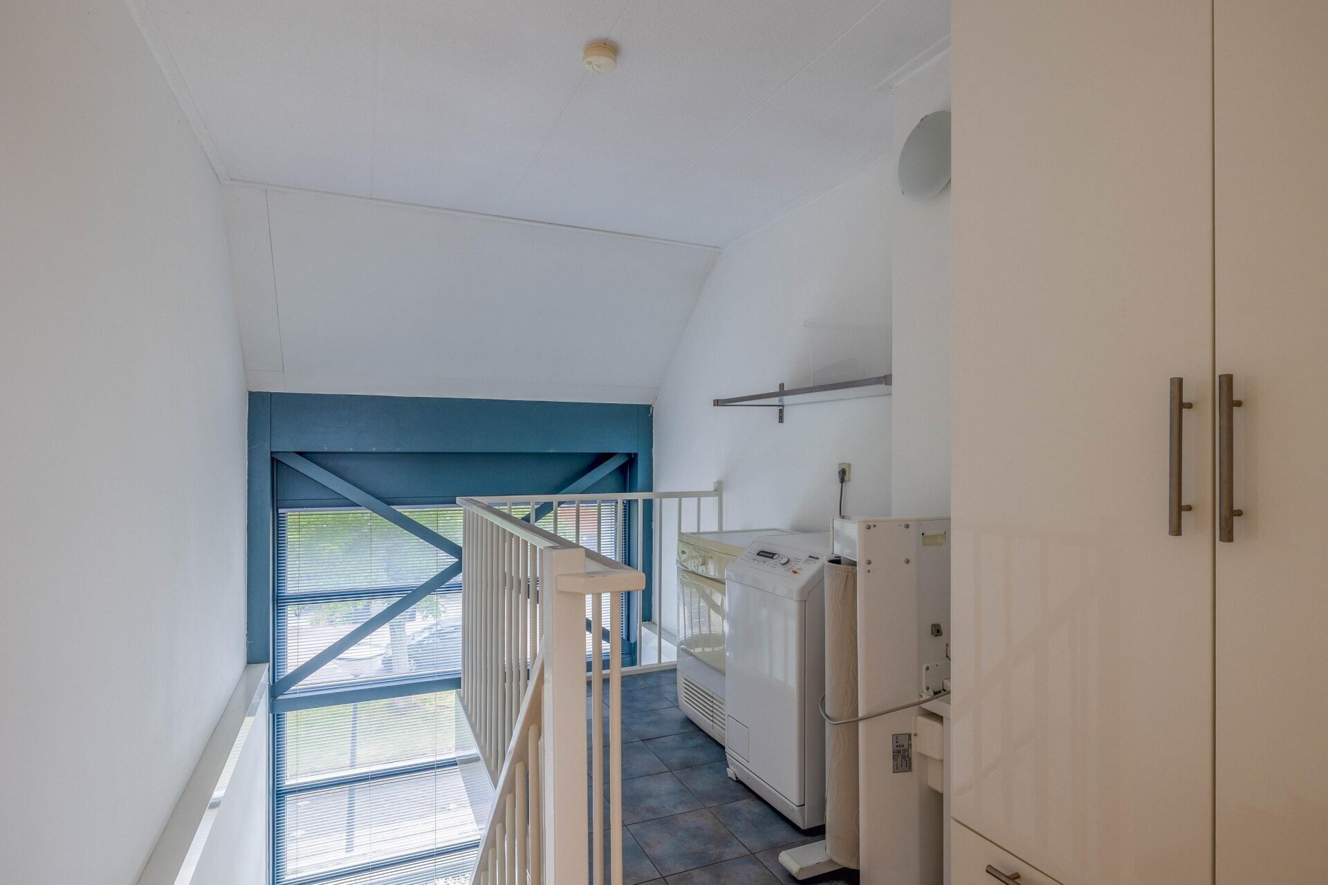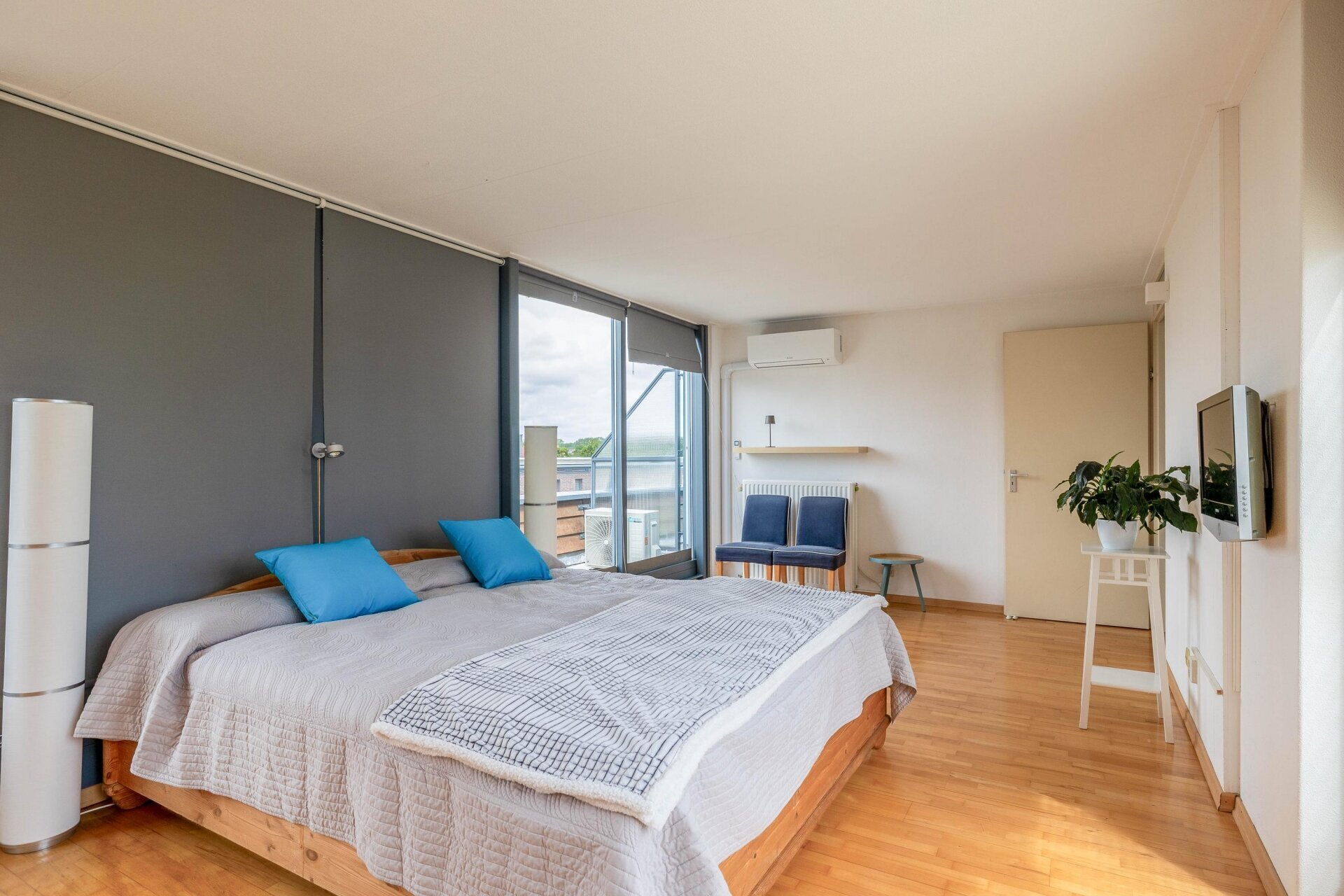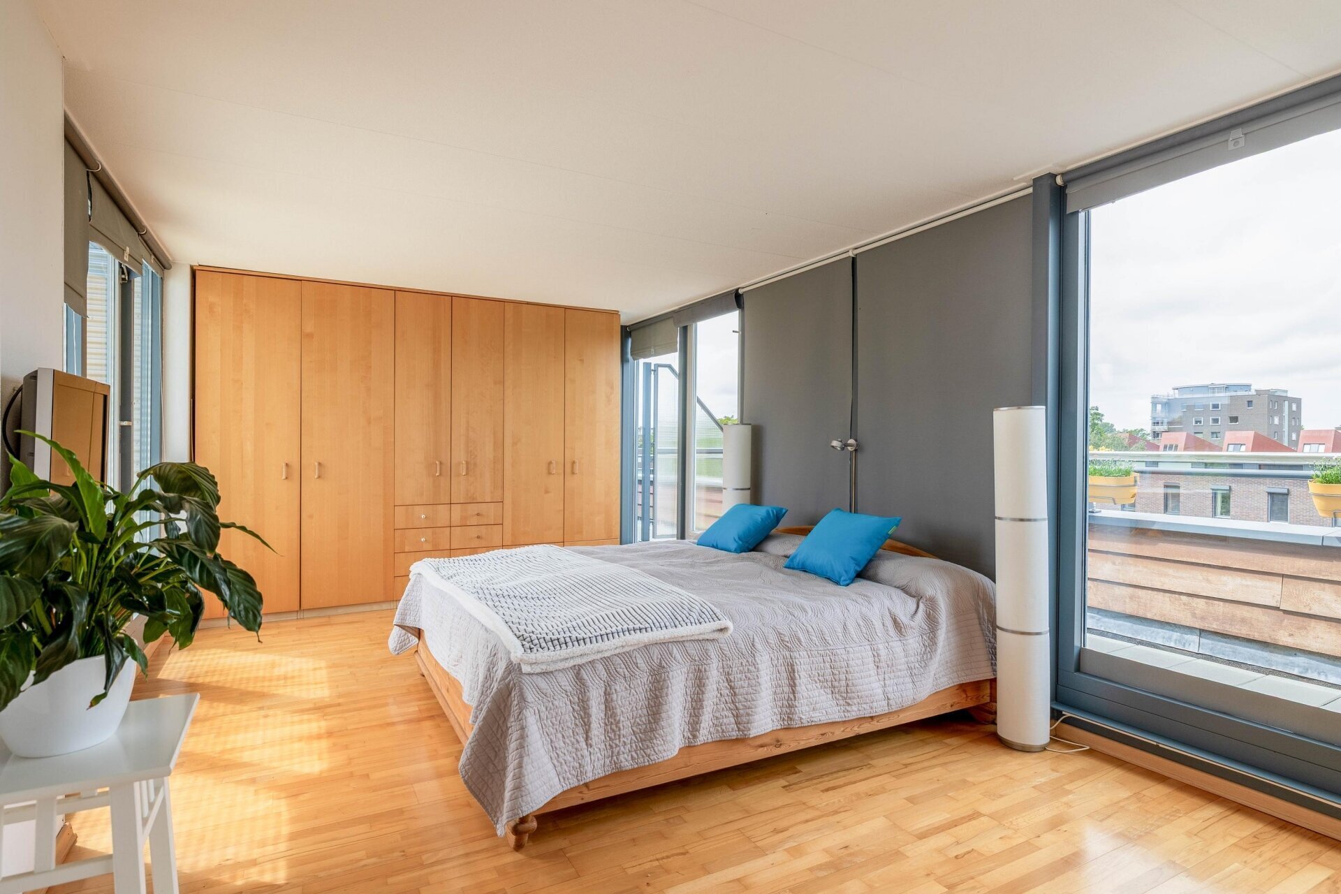Overloop met vide en 2e opstelplaats voor wasmachine en droger, omvormer van de zonnepanelen. Zeer ruime en lichte 4e slaapkamer over de volle breedte, voorzien van kastenwand, airco en toegang naar riante zonneterrassen aan de voor- en achterzijde (buitenkraan), met veel privacy en schitterend vrij uitzicht op het groen en water. De vloer is voorzien van licht parket. Onder de wasmachine-opstelling betegeld.