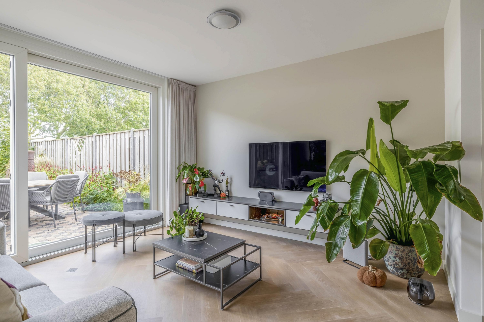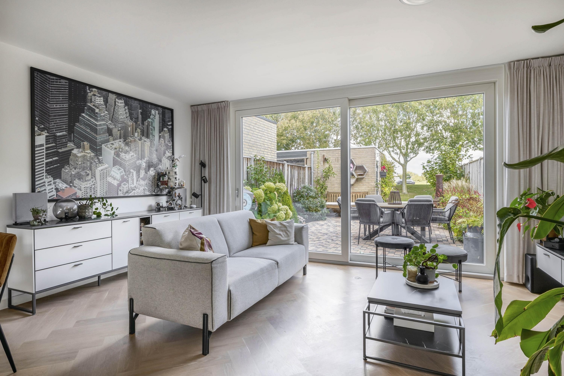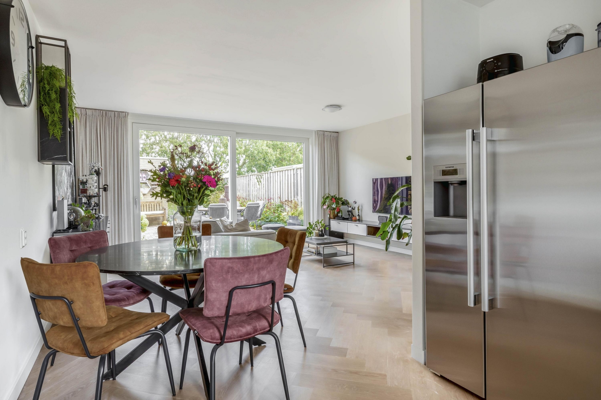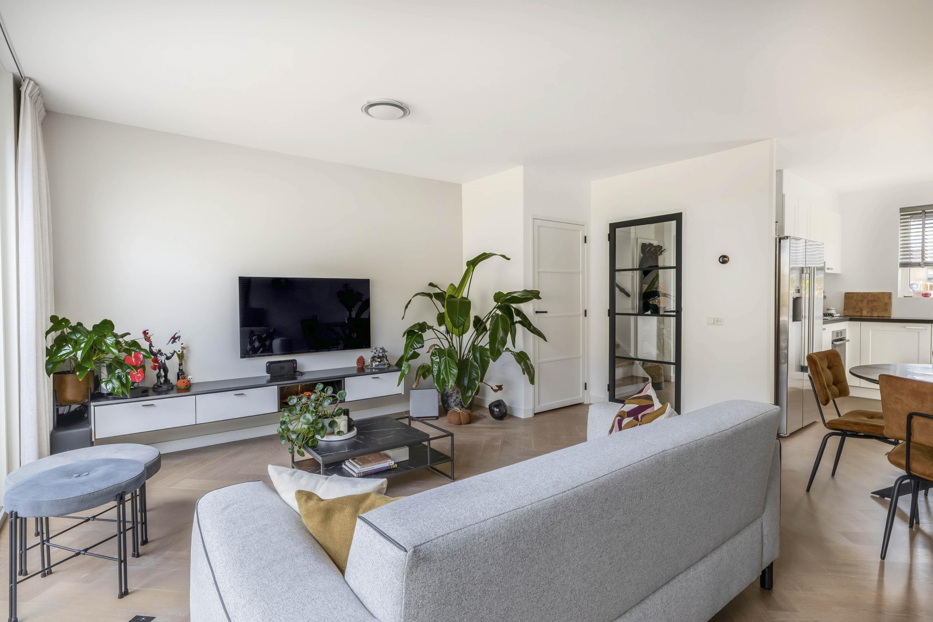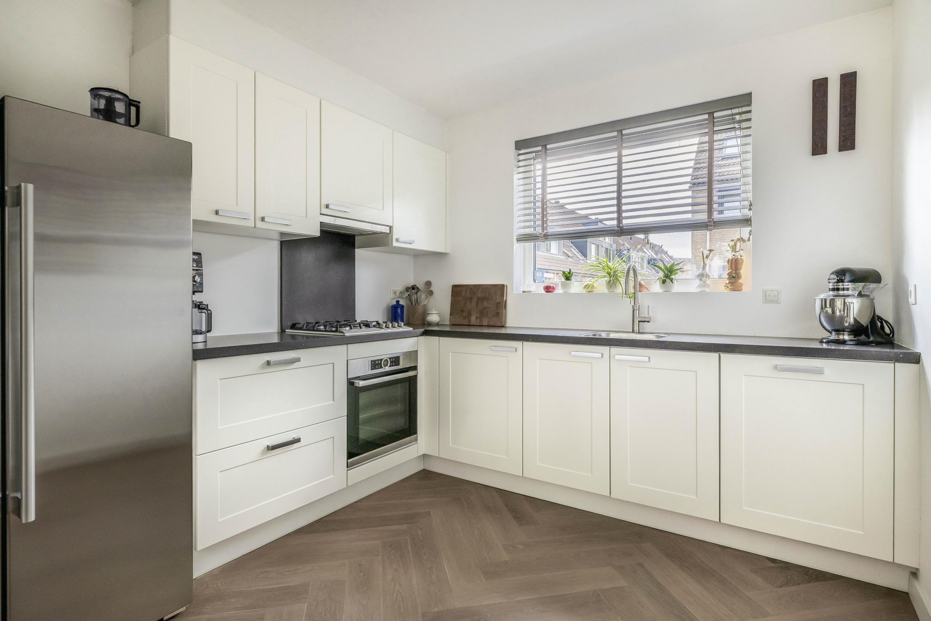 Bij binnenkomst valt direct op hoe netjes en eigentijds dit huis is ingericht. De begane grond is in 2020 voorzien van een prachtige parketvloer mét vloerverwarming. De lichte woonkamer biedt uitzicht op de tuin en is heerlijk ruim dankzij de kunststof schuifpui met HR+++ glas. De open keuken aan de voorzijde is in 2016 geplaatst en uitgerust met moderne inbouwapparatuur, een strak werkblad en voldoende opbergruimte.