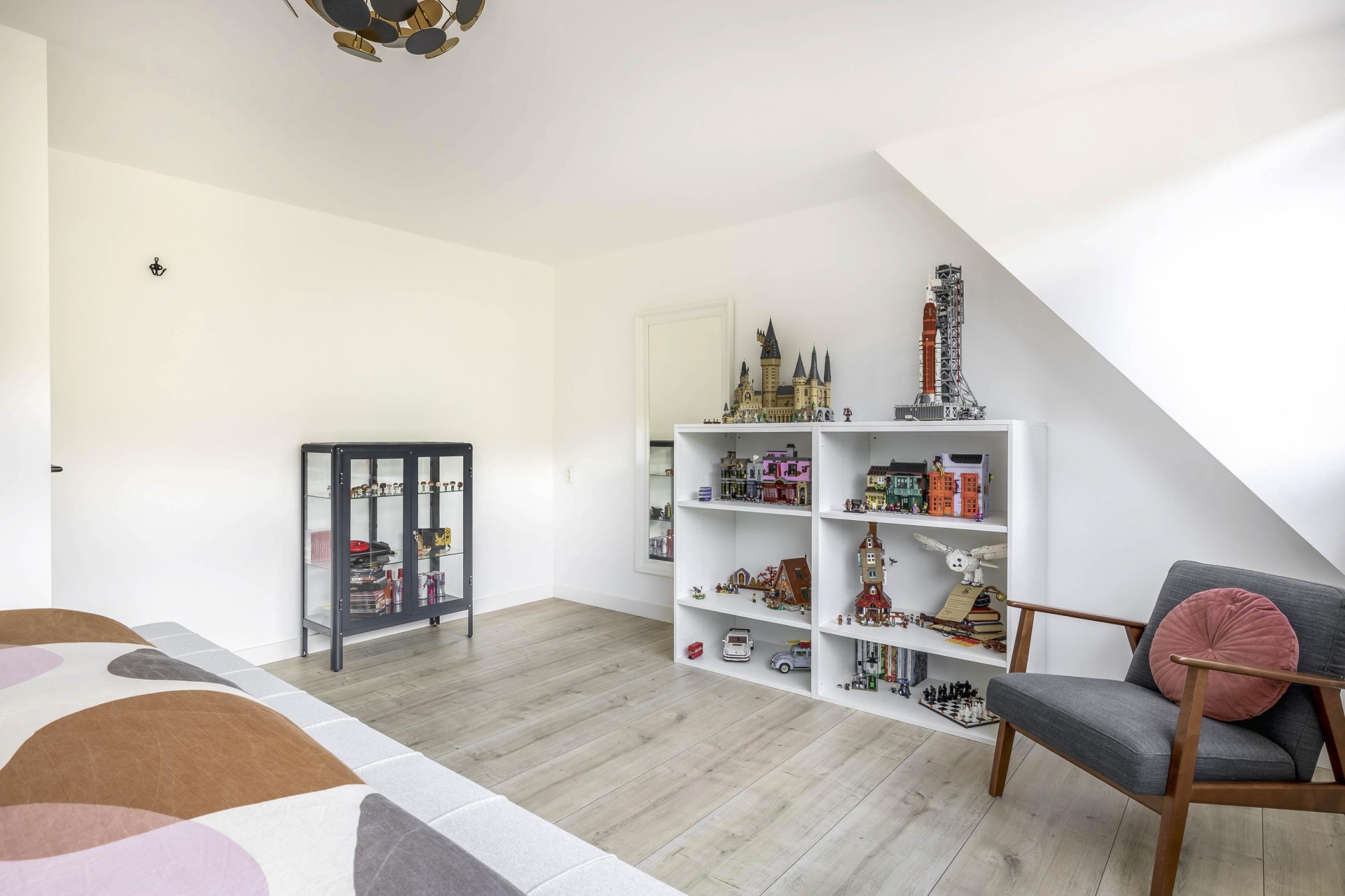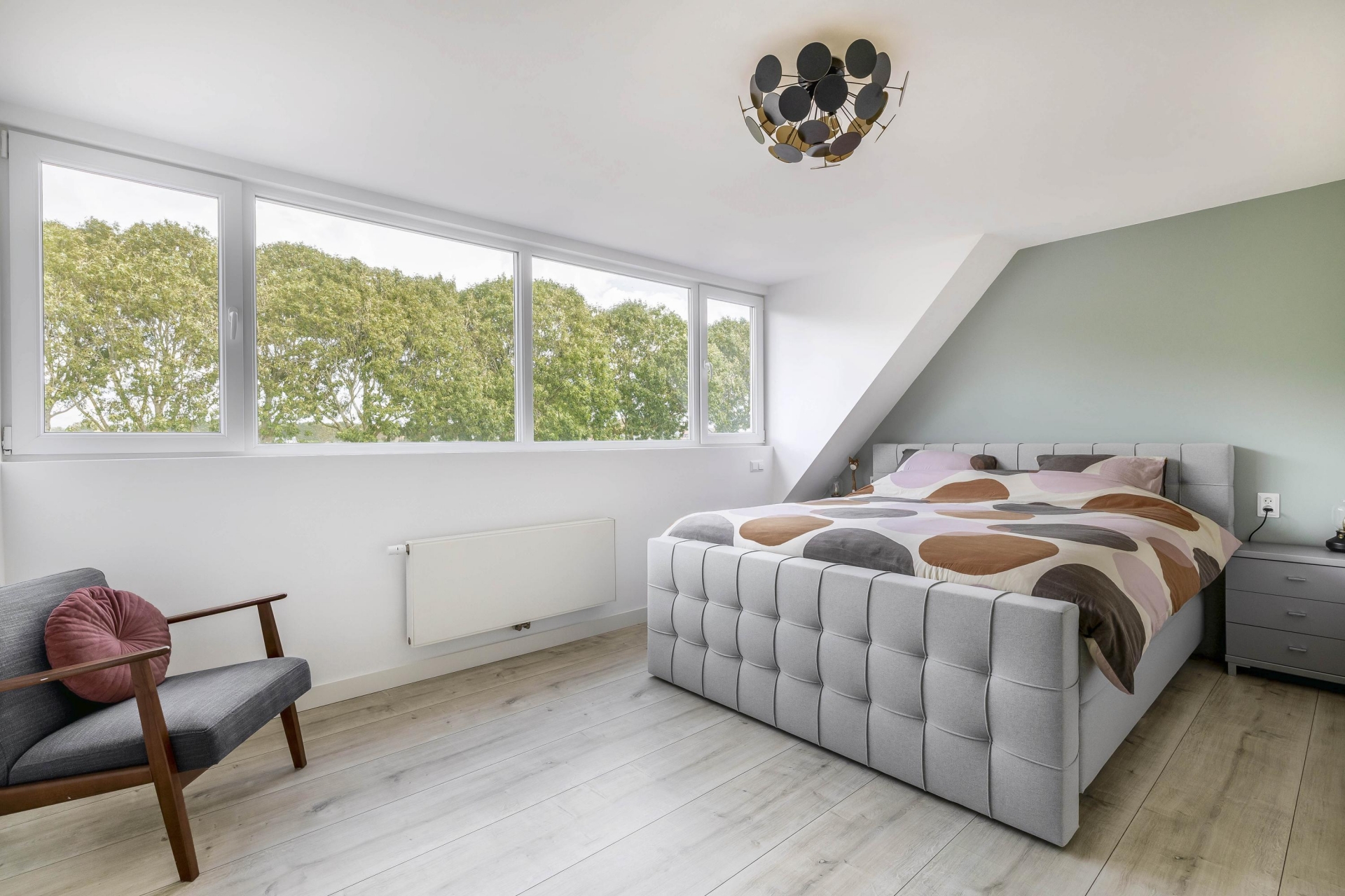 Ook de bovenverdiepingen zijn volledig aangepakt. De badkamer is in 2021 vernieuwd en uitgevoerd in een stijlvolle marmerlook met zwart sanitair. Hier vind je een ruime inloopdouche, wastafelmeubel met spiegel en een tweede toilet. Er zijn drie slaapkamers, waarvan twee zeer ruim. Oorspronkelijk waren dit er vier, maar de huidige eigenaren hebben gekozen voor meer ruimte en comfort. Een kunststof dakkapel aan de achterzijde vergroot de bovenverdieping en zorgt voor extra licht.