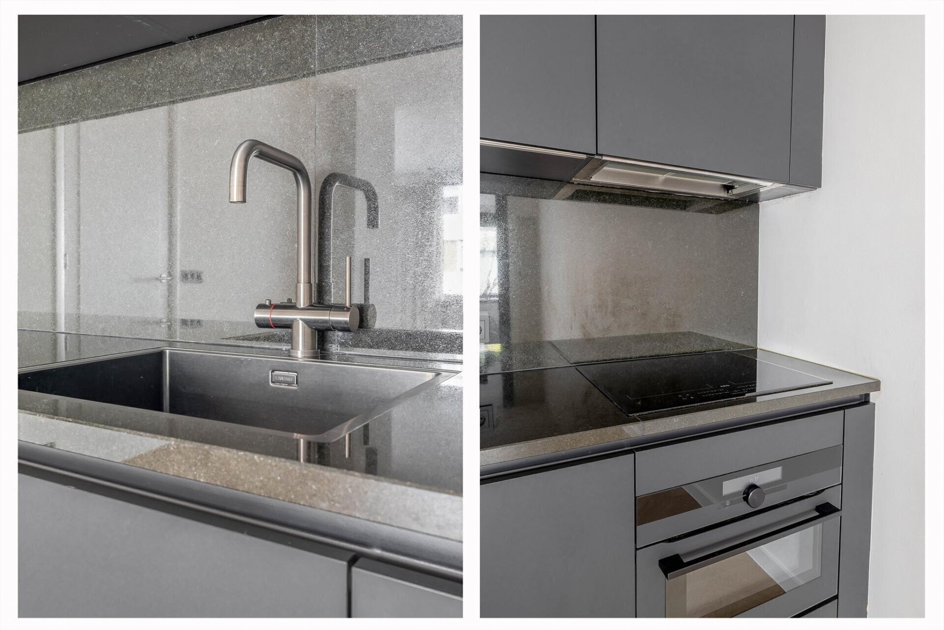 Koken wordt een feestje met de combi-oven, inductiekookplaat met geïntegreerde afzuiging, een koel-vriescombinatie en een Quooker voor direct kokend water. Het natuurstenen granieten werkblad en achterwand geven de keuken een stijlvolle en luxe uitstraling. Bovendien is de verlichting dimbaar en instelbaar in warm of koud licht, zodat je altijd de juiste sfeer creëert.