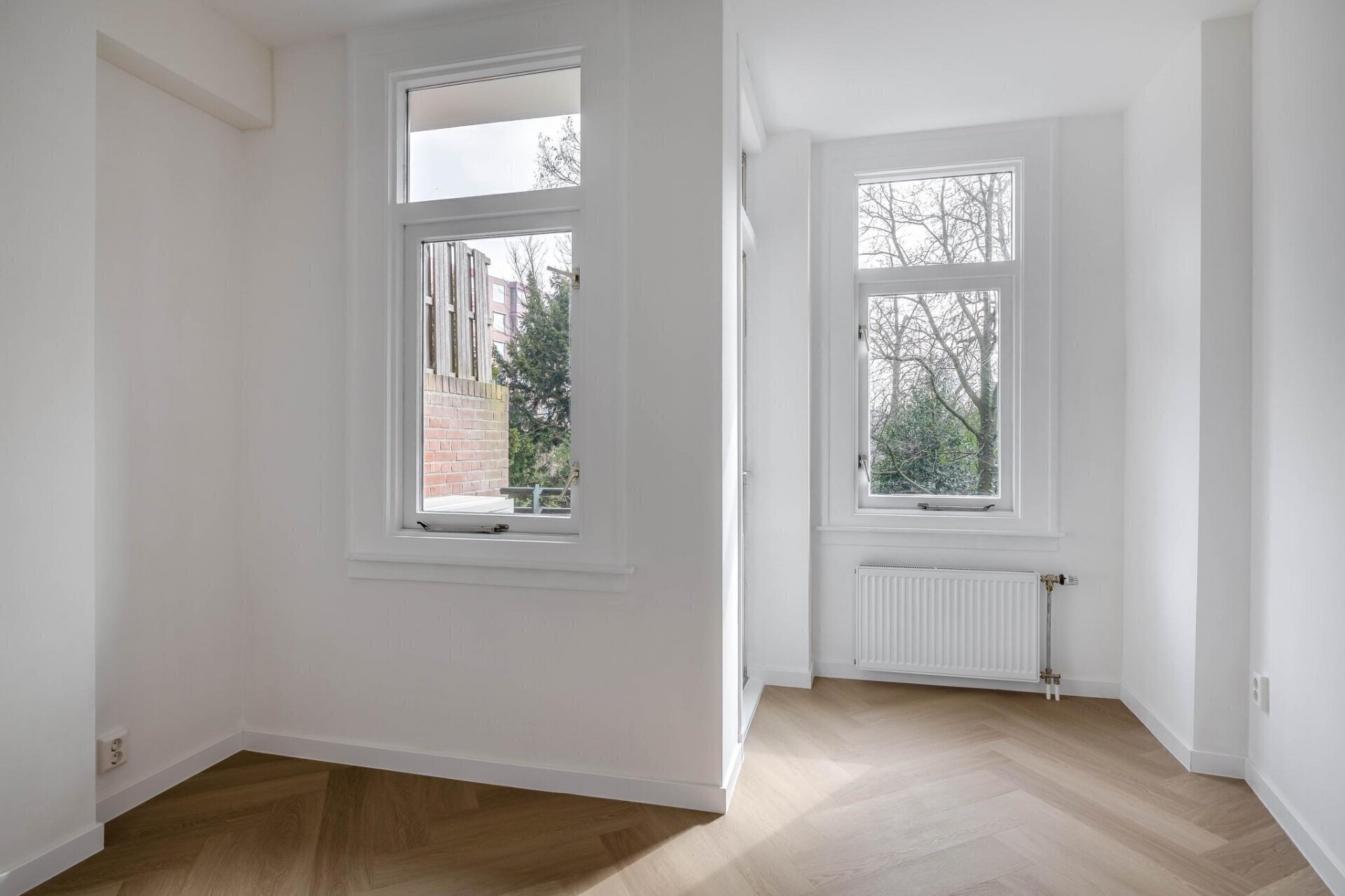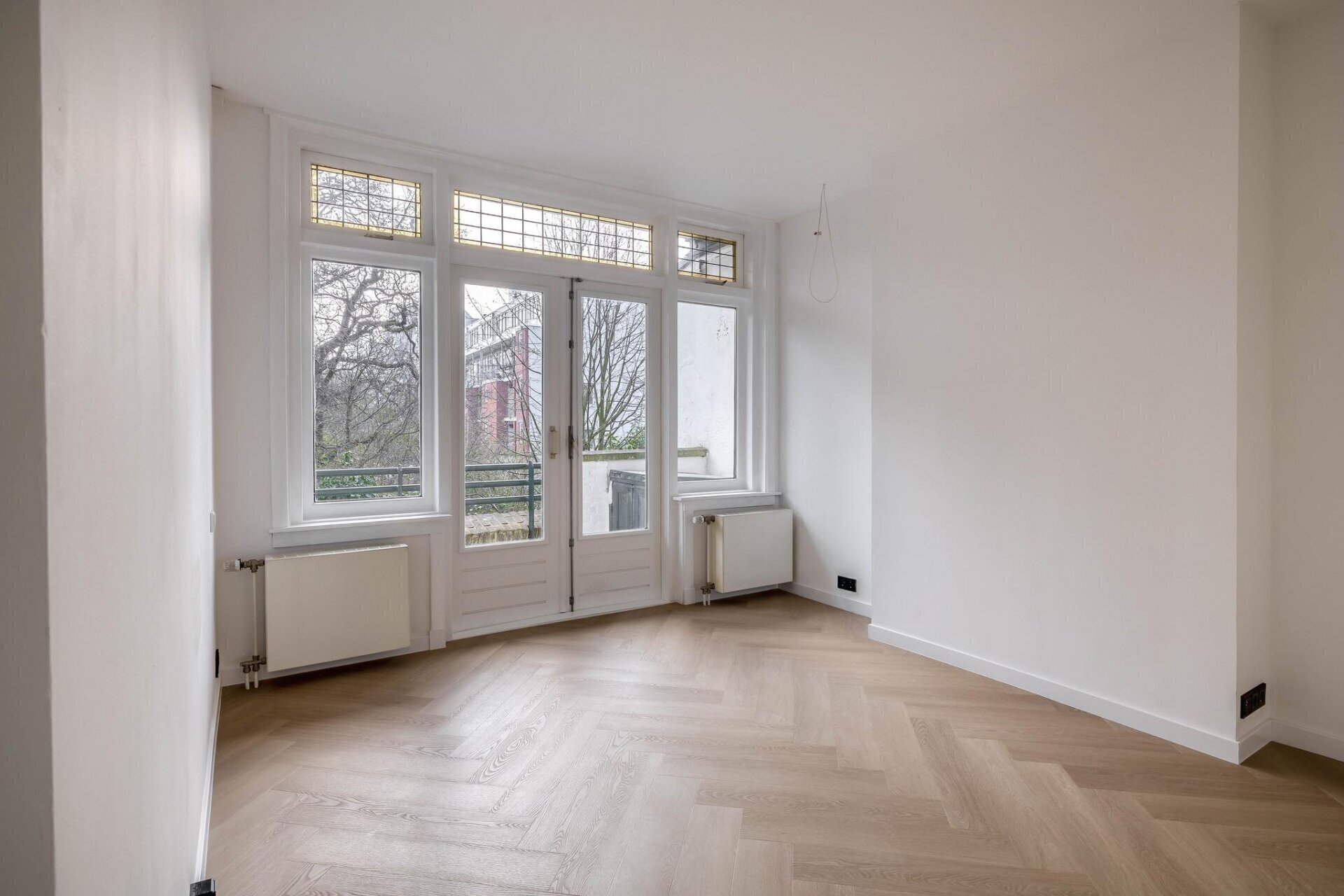 De grote slaapkamer biedt prachtig groen uitzicht, veel natuurlijk zonlicht en originele glas-in-looddetails in het voorzetraam. Daarnaast zijn er inbouwkasten voor extra opbergruimte en originele openslaande deuren naar het balkon. De tweede slaapkamer heeft eveneens toegang tot een eigen balkon. Daarnaast zijn de kamers voorzien van energiezuinige airconditioning, waarmee je in de zomer kunt koelen en in de winter kunt verwarmen.