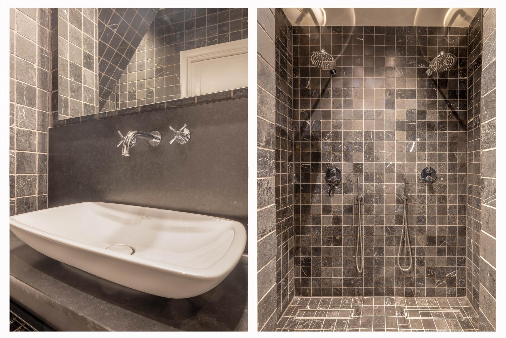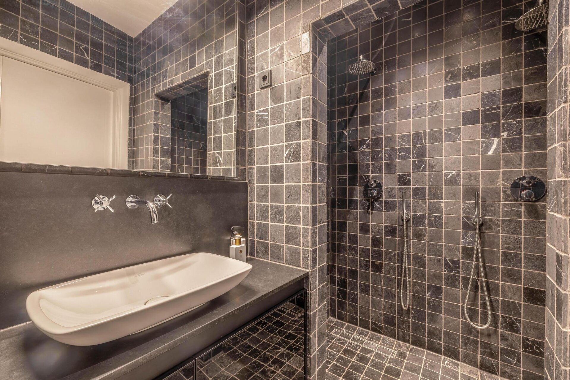 De badkamer is een echte eyecatcher, volledig uitgevoerd in echt marmer en voorzien van sanitair van Grohe en Villeroy & Boch. Geniet samen van de twee persoons douche, elektrische vloerverwarming die via een app of bedieningspaneel te regelen is, en een stijlvol wasmeubel met een granieten blad. Het toilet is uitgerust met een ingebouwde bidetfunctie, die je eveneens via een app of afstandsbediening kunt bedienen. Daarnaast zorgen dimbare verlichting en mechanische ventilatie voor extra comfort.