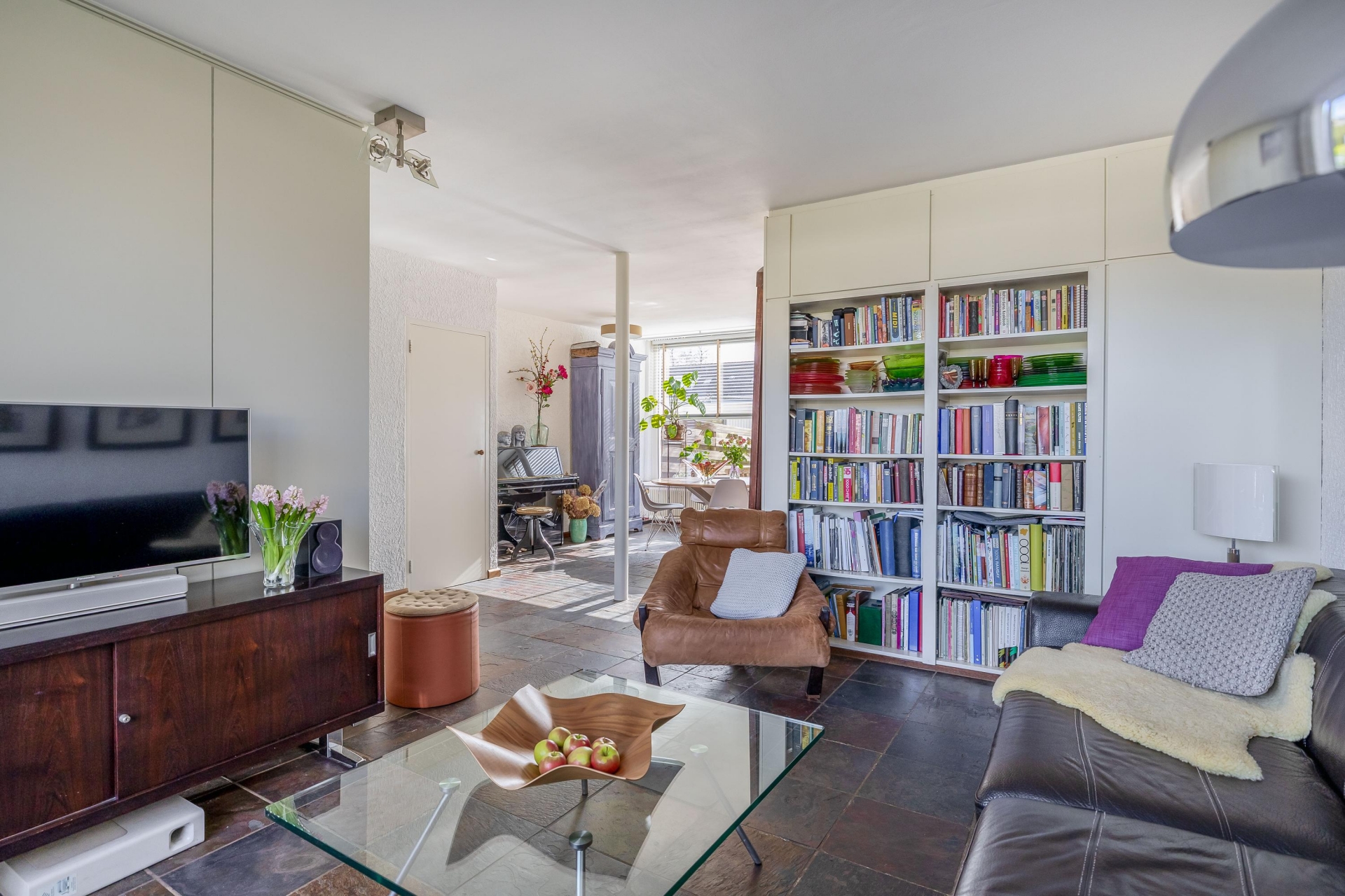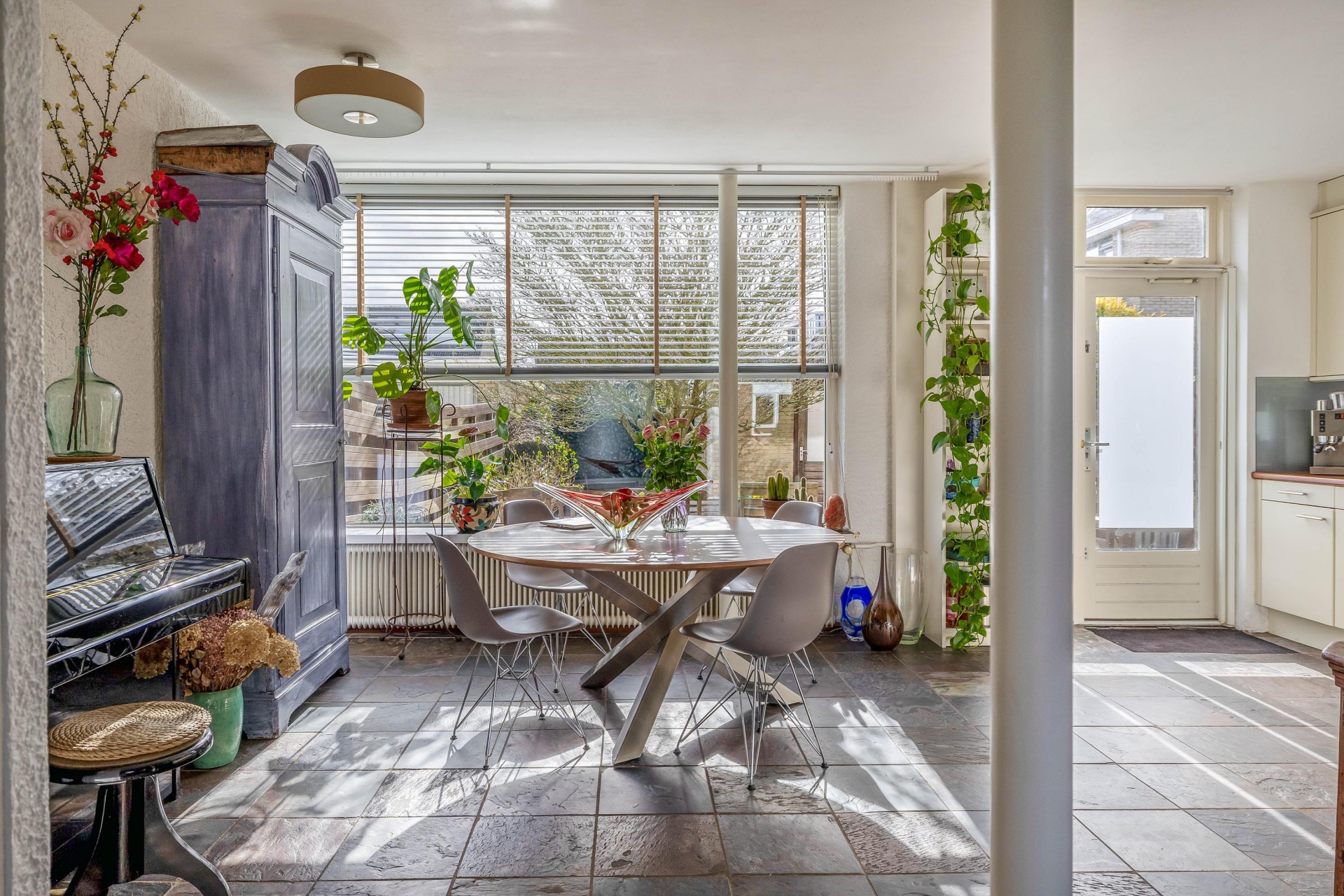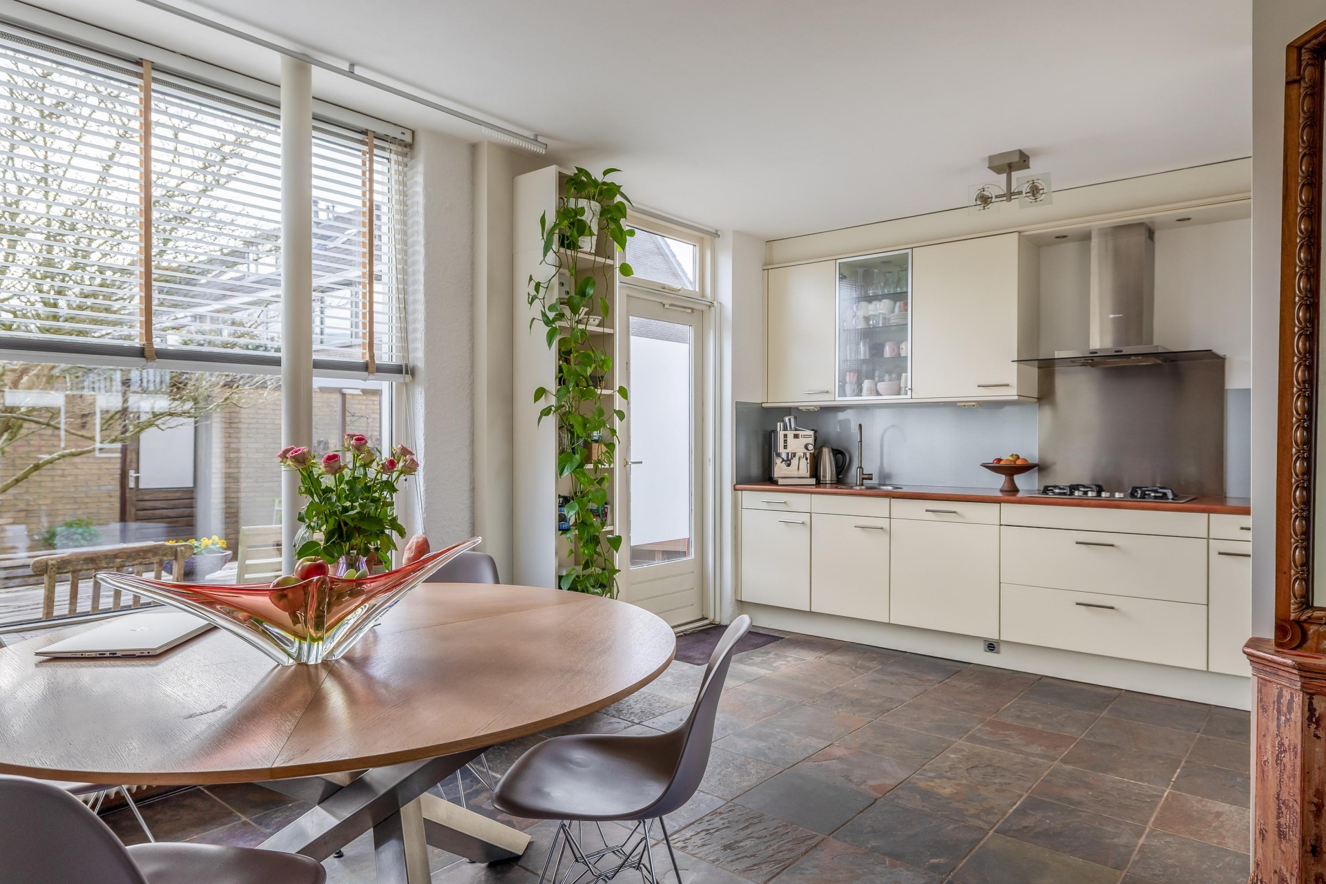 De woonkamer is heerlijk licht dankzij de grote raampartijen aan zowel de voor- als achterzijde. Hierdoor heb je niet alleen veel daglicht, maar ook een prettig zicht op de straat en de tuin. Wat direct opvalt is de karaktervolle vloer van Noord-Afrikaans leisteen, die de ruimte een warme en unieke uitstraling geeft. De ruimte is groot genoeg voor een comfortabele zithoek en een gezellige eethoek, waardoor dit echt het hart van het huis is.