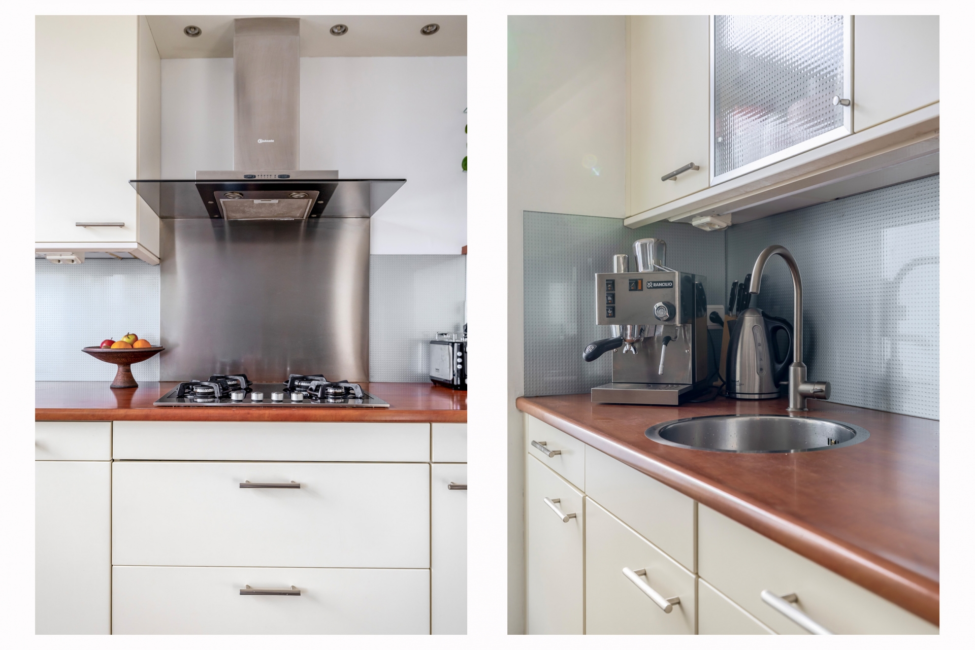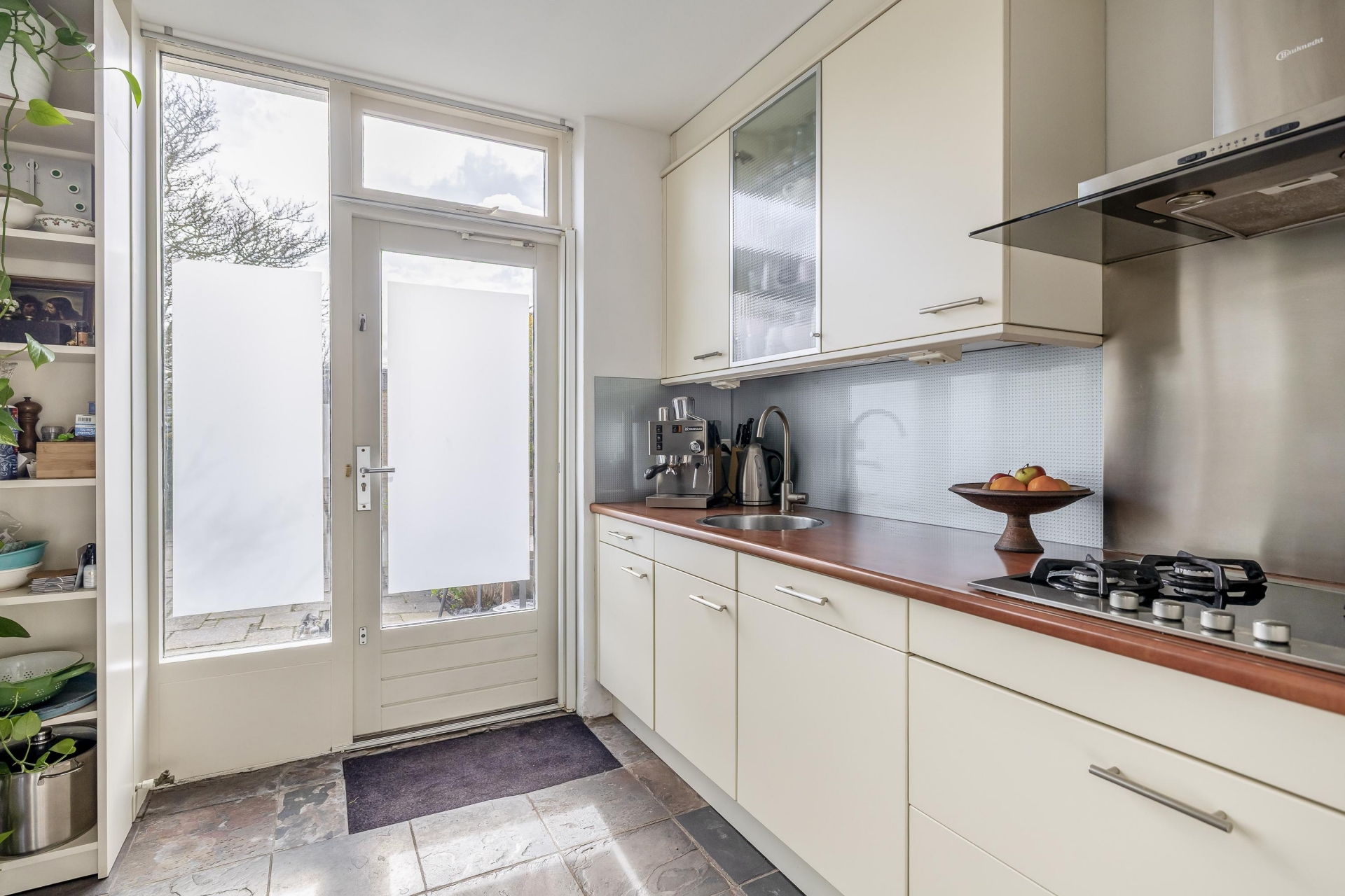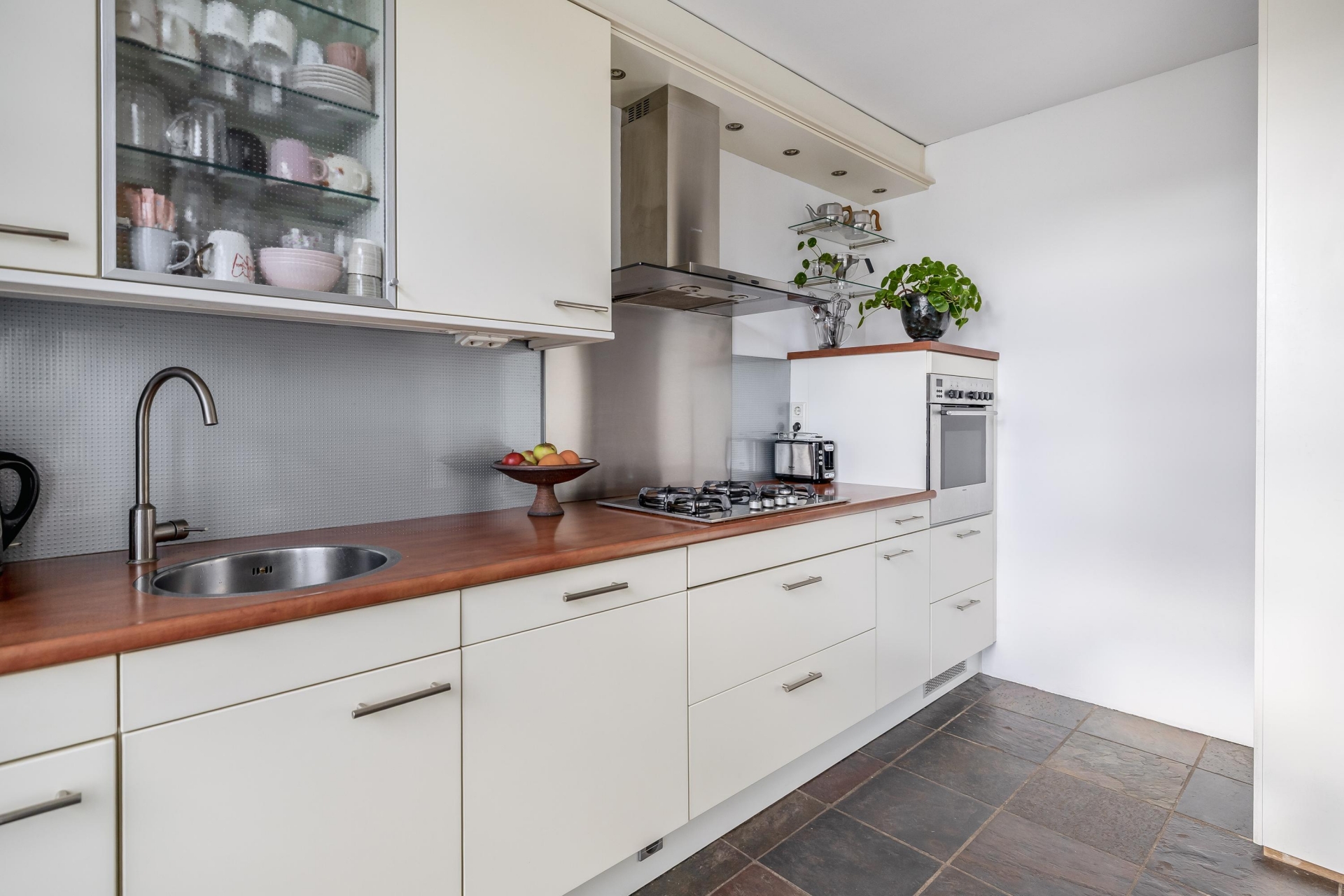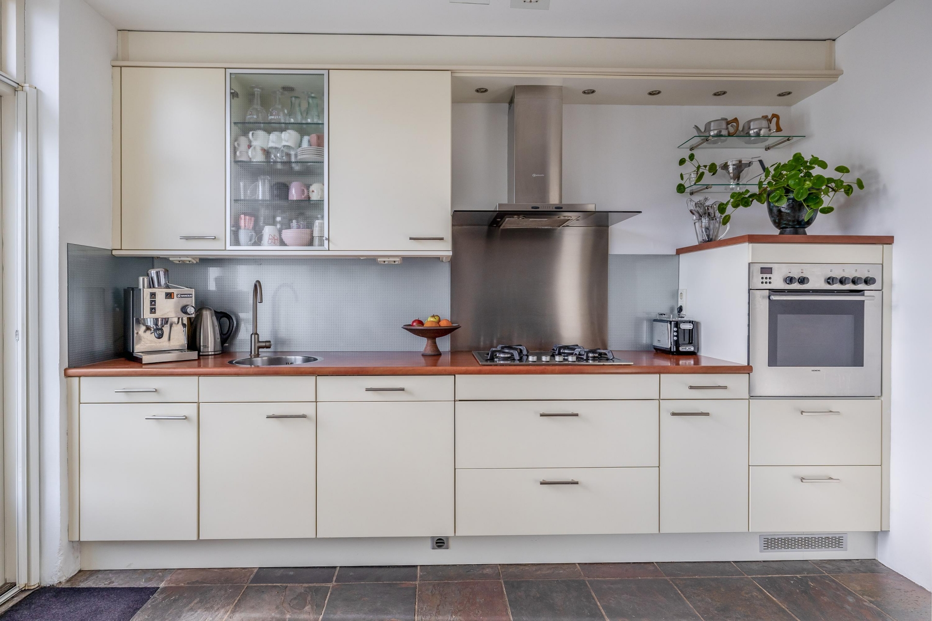 De keuken is praktisch ingericht en voorzien van diverse inbouwapparatuur. De lichte kleurstelling in combinatie met het werkblad zorgt voor een frisse uitstraling. Er is voldoende kastruimte aanwezig en je hebt direct toegang tot de achtertuin, wat ideaal is op zonnige dagen of wanneer je buiten wilt eten.