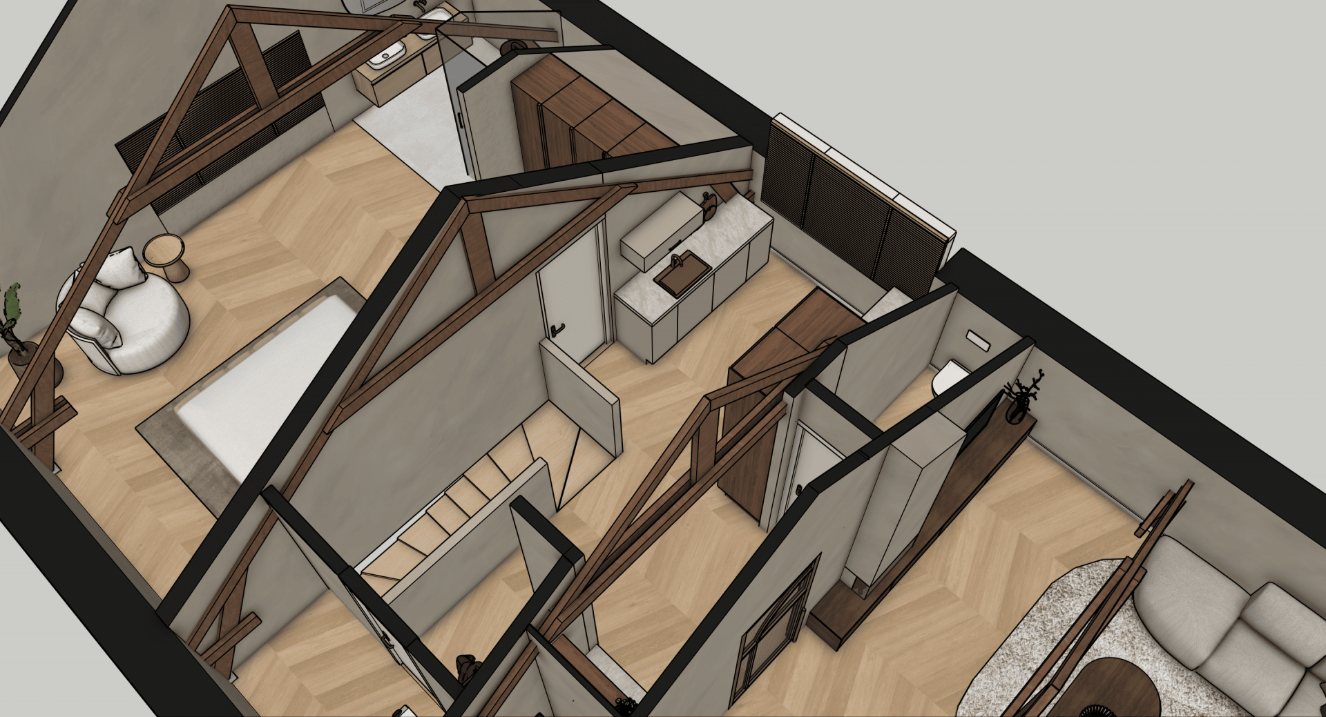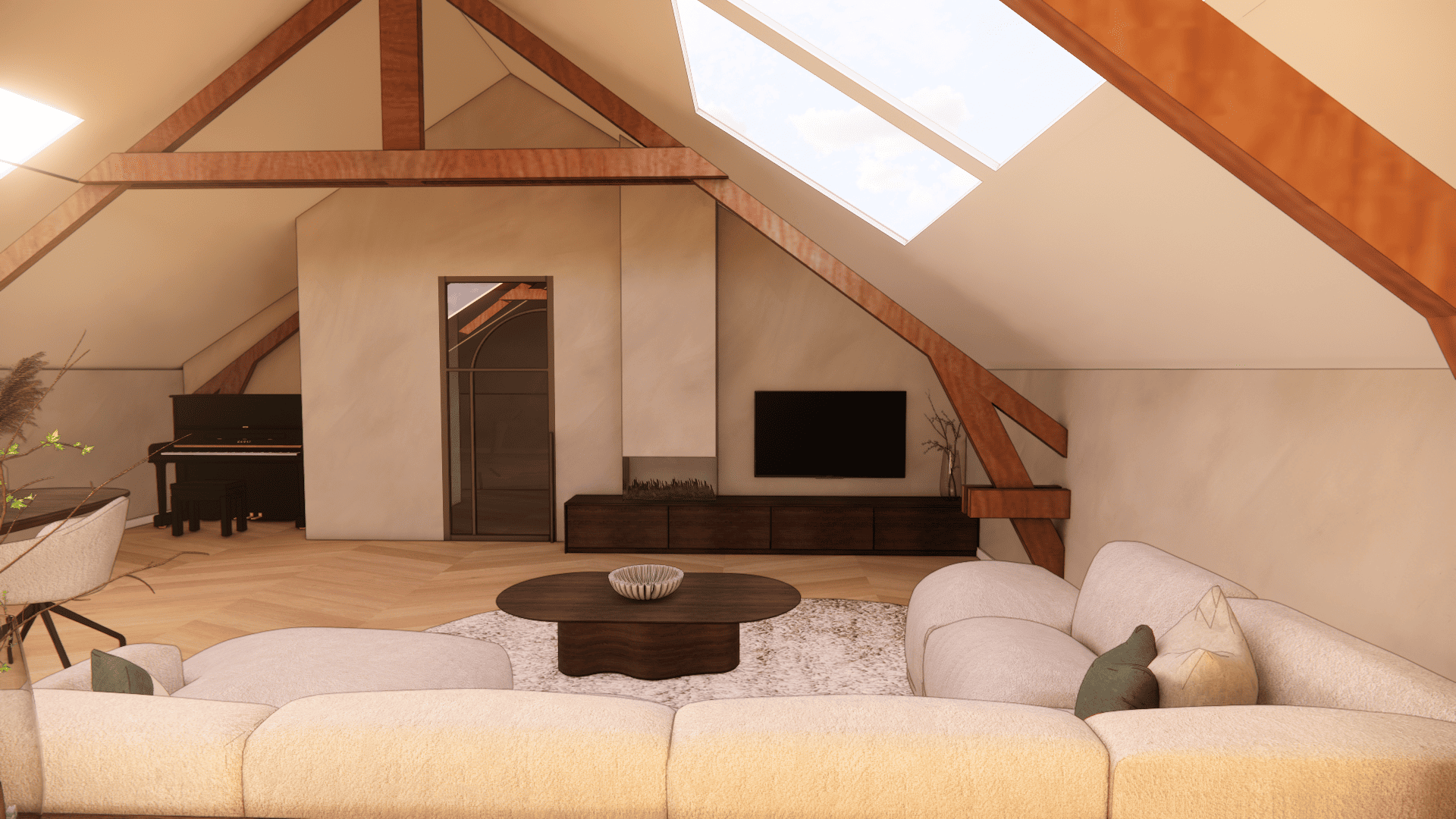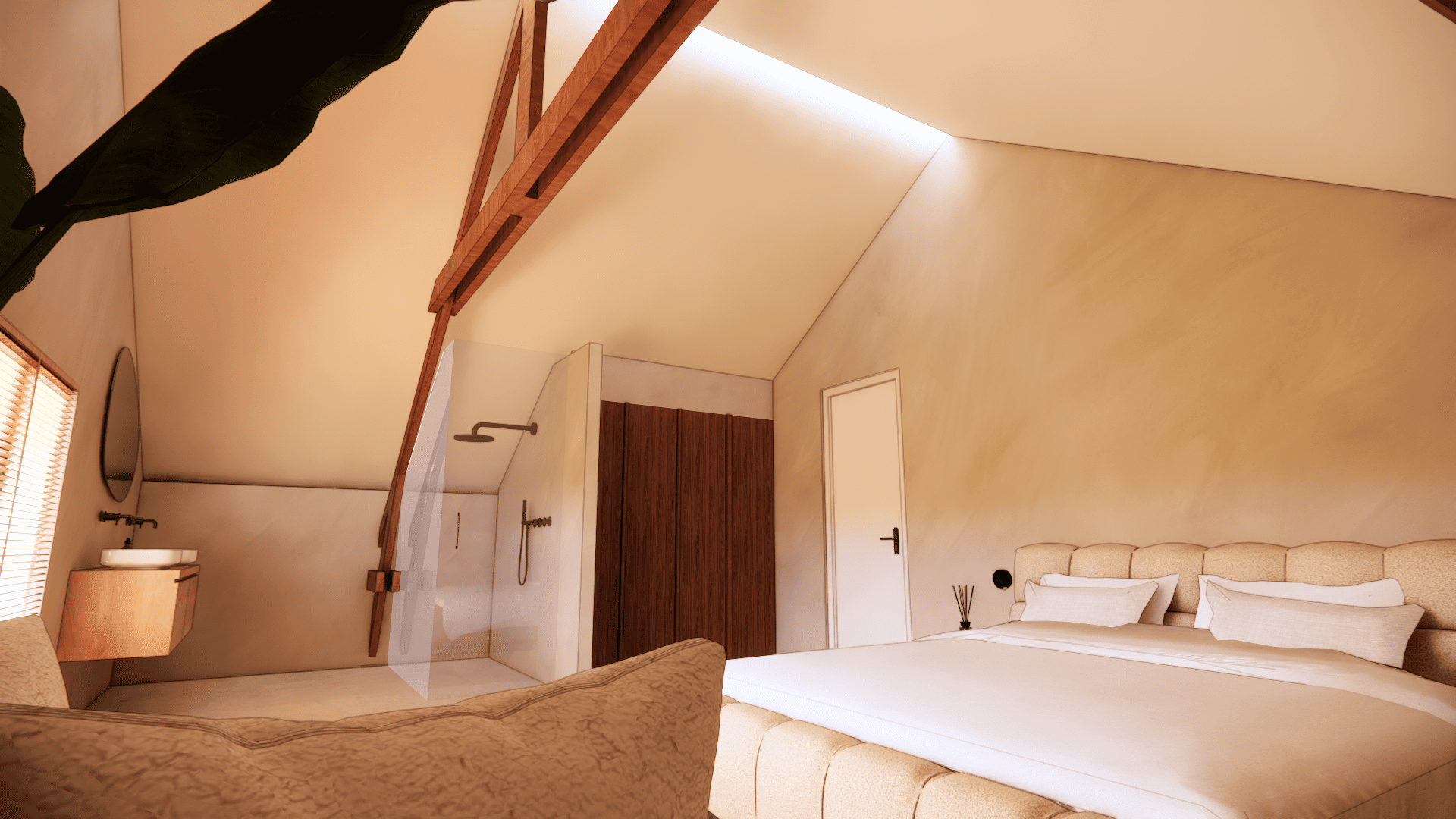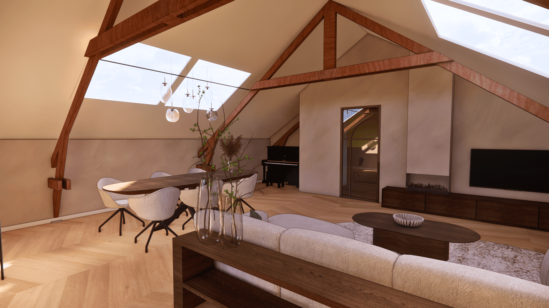 De verdieping laat zien wat hier mogelijk is: op basis van uitgewerkte 3D-visualisaties is een luxe loftstijl voorstel uitgewerkt met zichtbare houten spanten, dakramen voor daglicht, een open living met zithoek en eethoek, moderne keuken en een ruime slaapkamer met en suite badkamer. Alles in natuurlijke tinten, met warme materialen en slimme indeling. Of je het nu zelf gaat realiseren of laat uitvoeren, de inspiratie ligt er al.