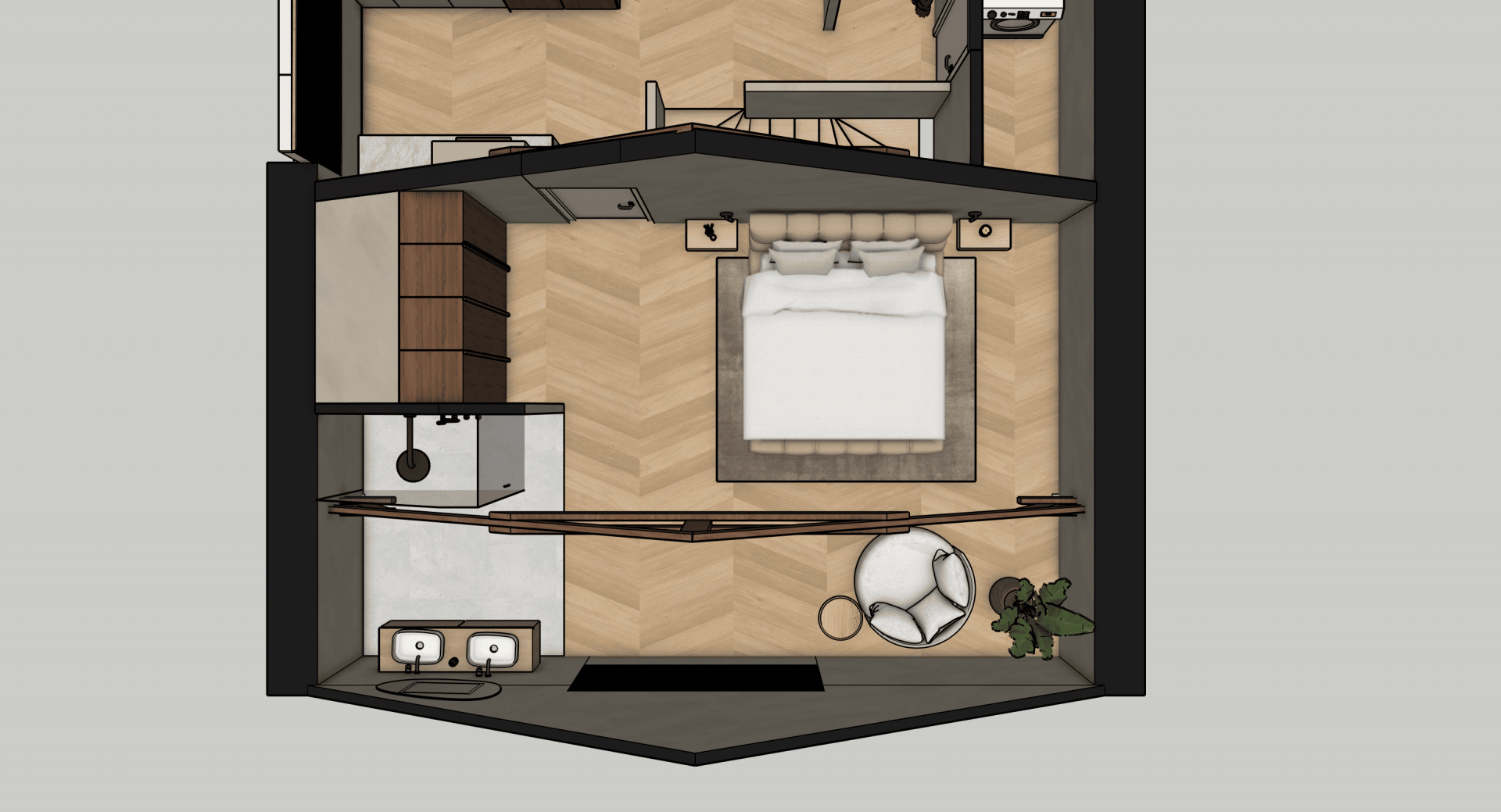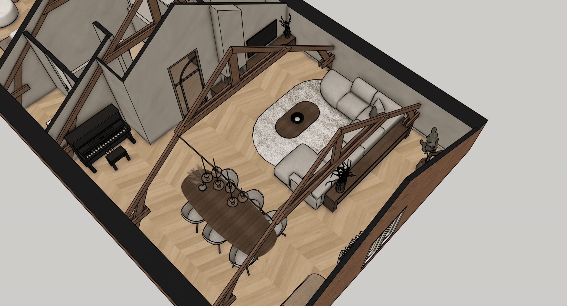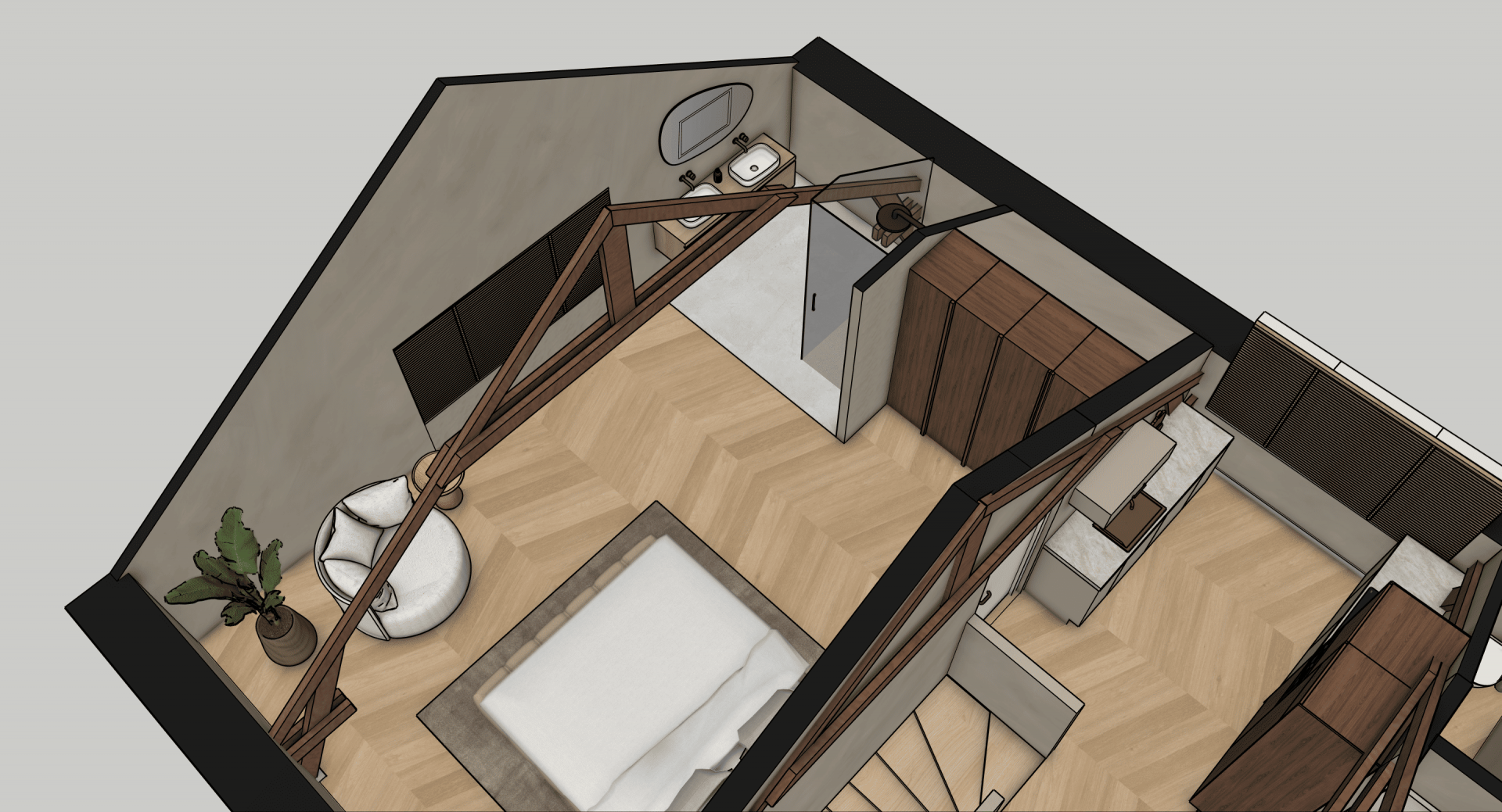 De verdieping laat zien wat hier mogelijk is: op basis van uitgewerkte 3D-visualisaties is een luxe loftstijl voorstel uitgewerkt met zichtbare houten spanten, dakramen voor daglicht, een open living met zithoek en eethoek, moderne keuken en een ruime slaapkamer met en suite badkamer. Alles in natuurlijke tinten, met warme materialen en slimme indeling. Of je het nu zelf gaat realiseren of laat uitvoeren, de inspiratie ligt er al.