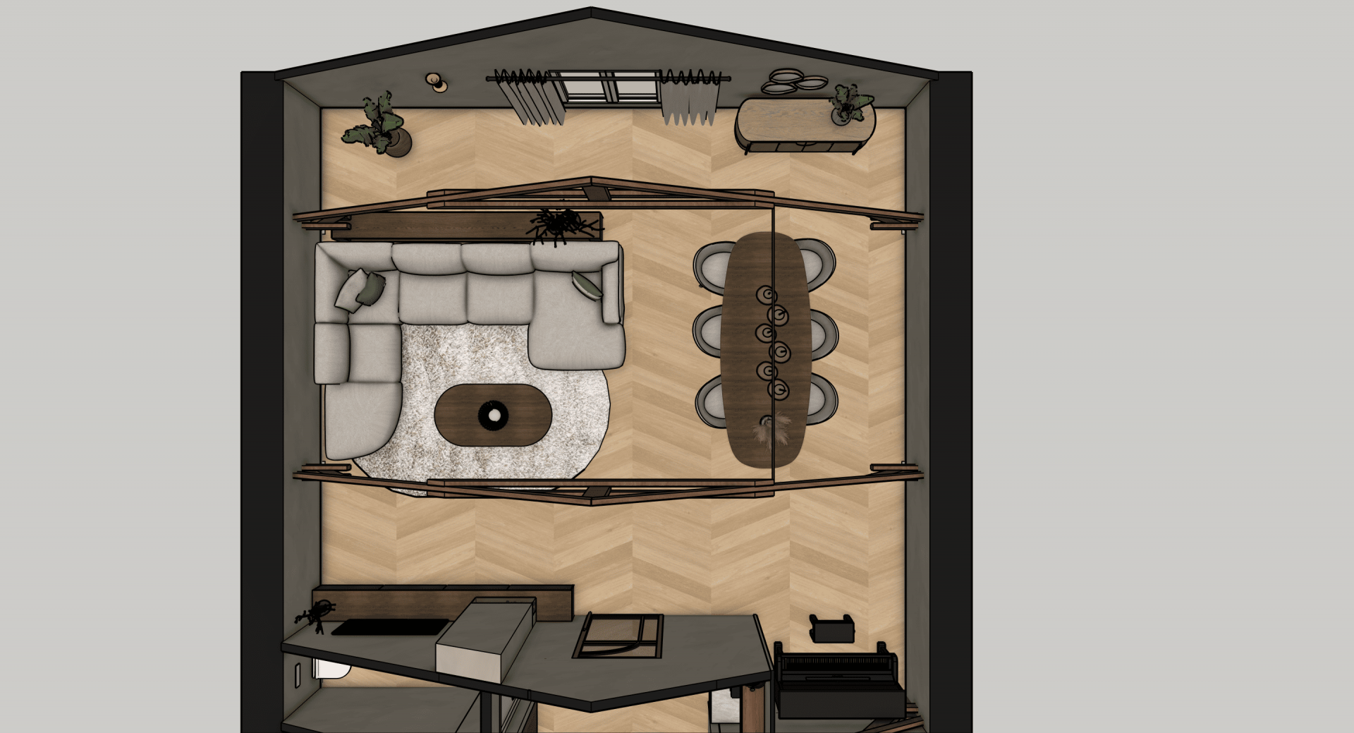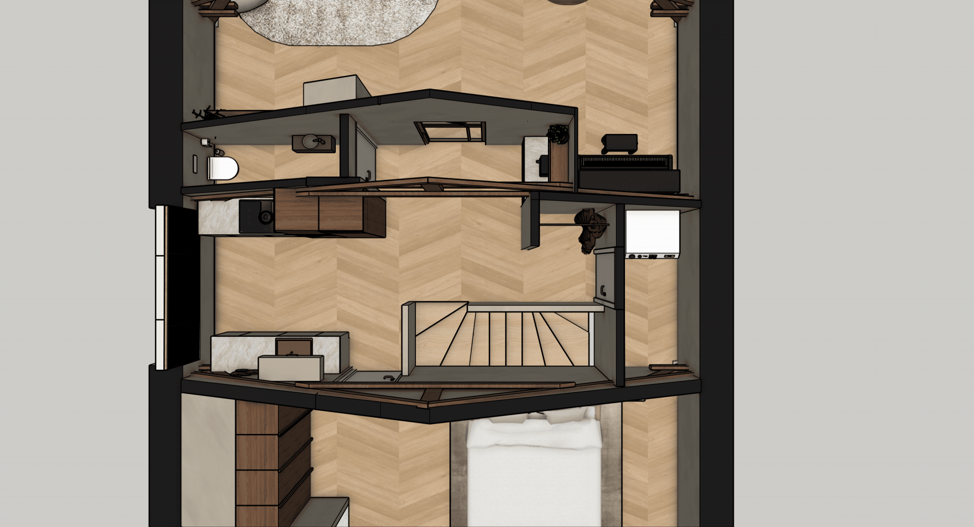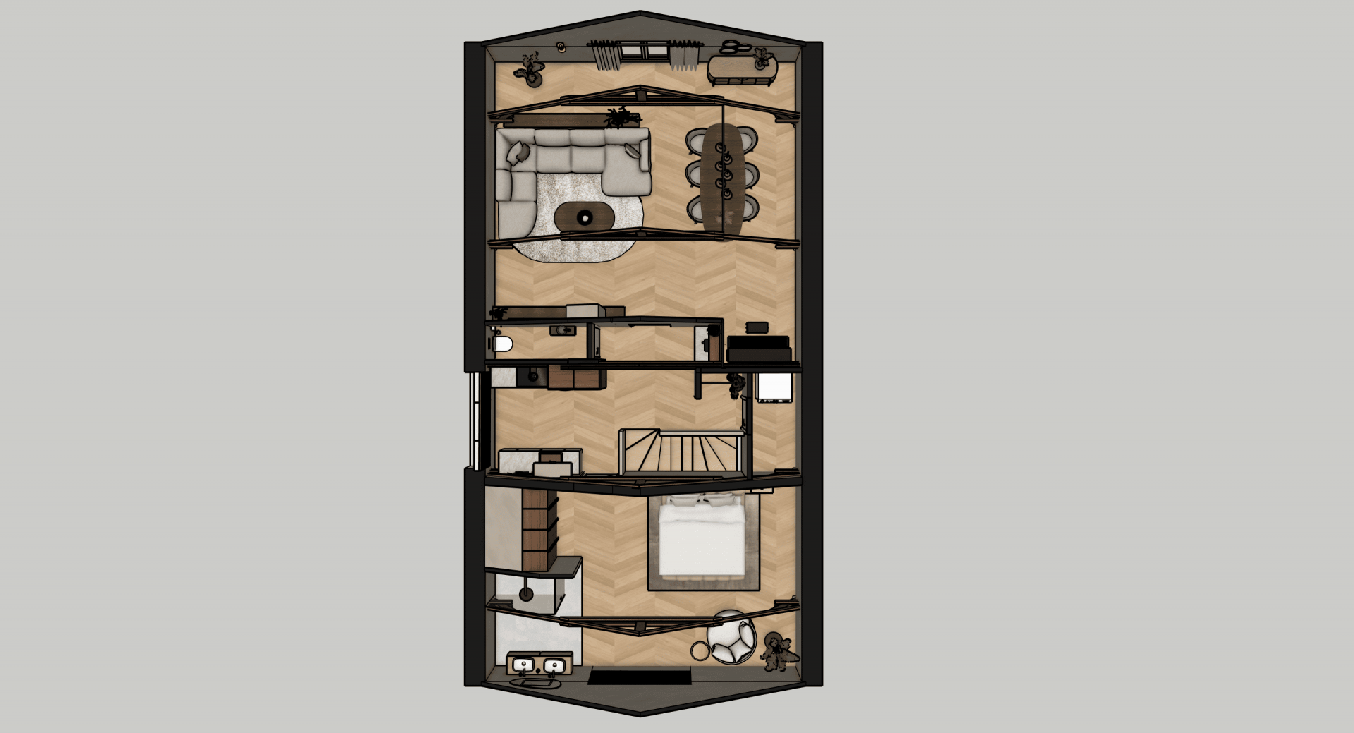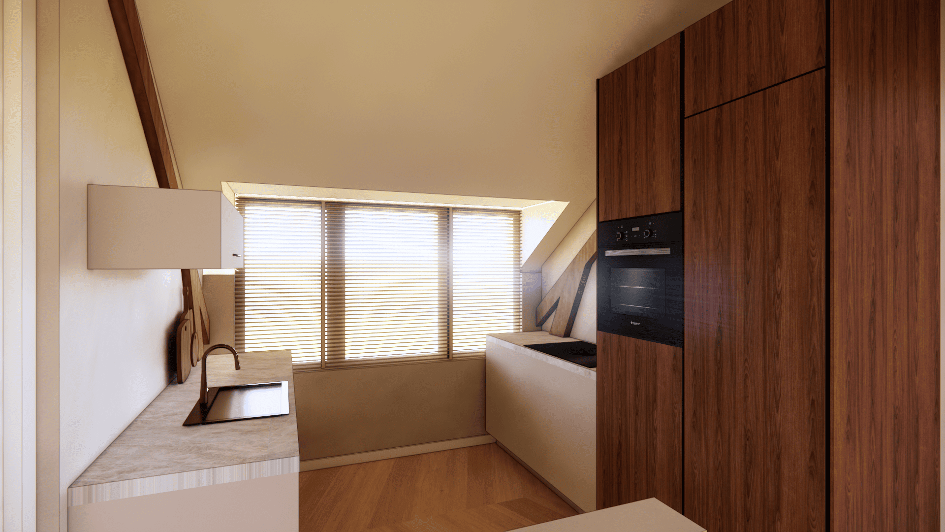 De verdieping laat zien wat hier mogelijk is: op basis van uitgewerkte 3D-visualisaties is een luxe loftstijl voorstel uitgewerkt met zichtbare houten spanten, dakramen voor daglicht, een open living met zithoek en eethoek, moderne keuken en een ruime slaapkamer met en suite badkamer. Alles in natuurlijke tinten, met warme materialen en slimme indeling. Of je het nu zelf gaat realiseren of laat uitvoeren, de inspiratie ligt er al.