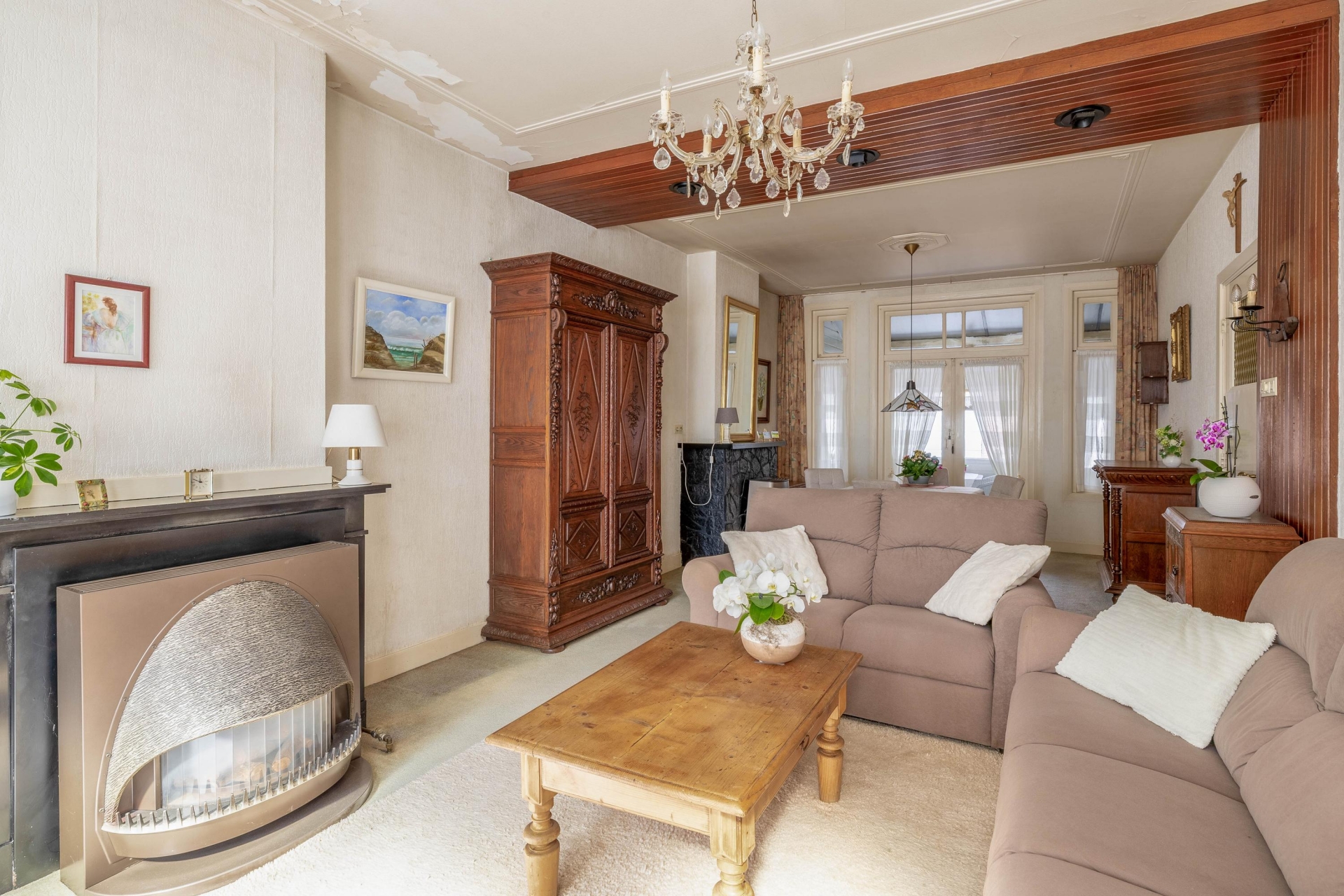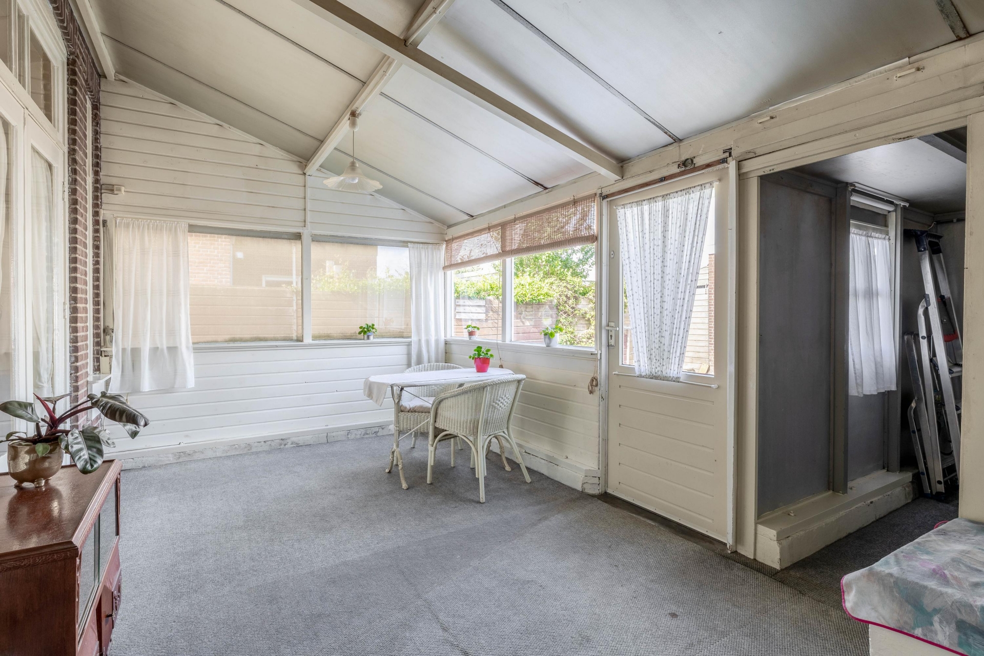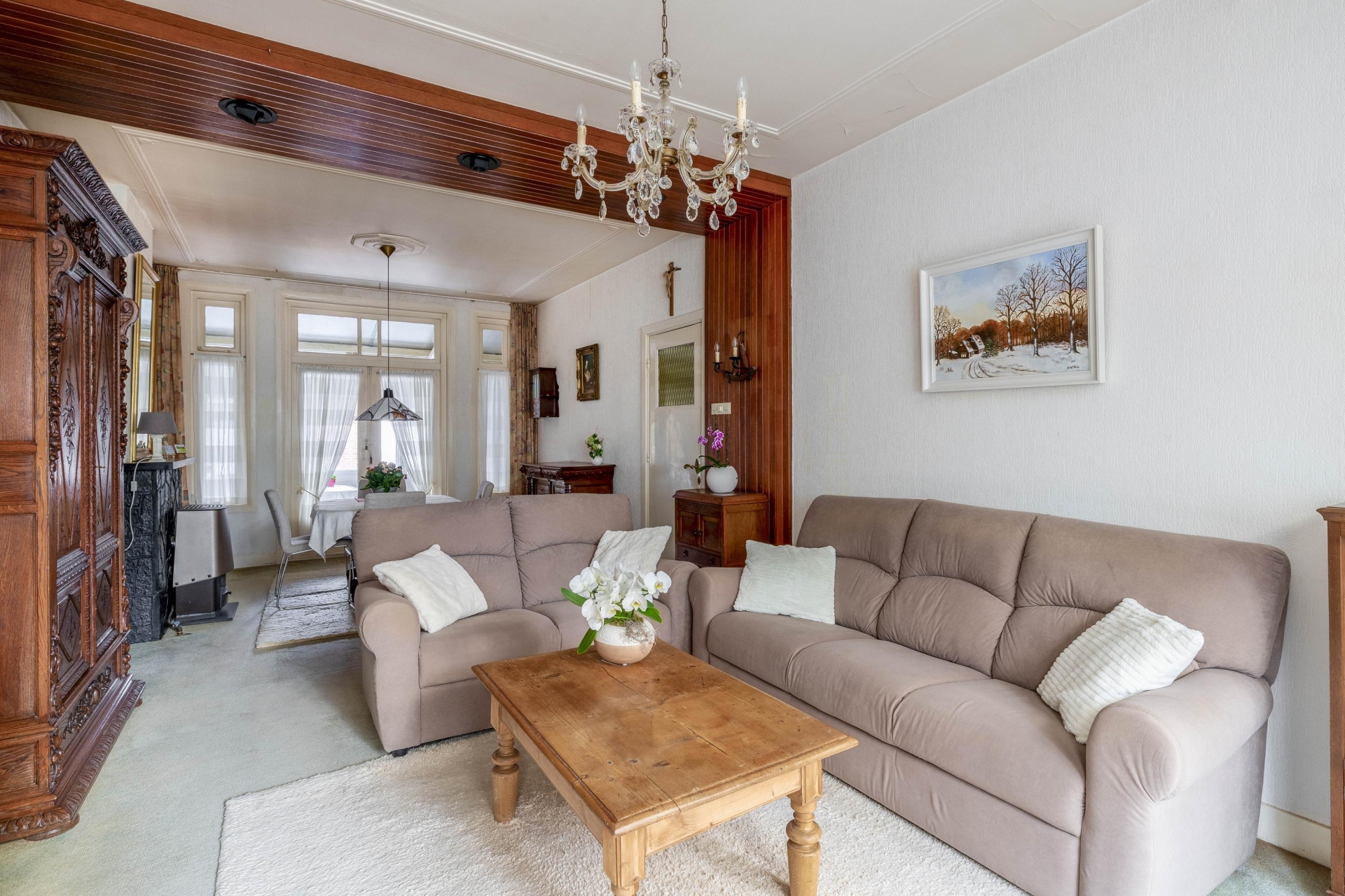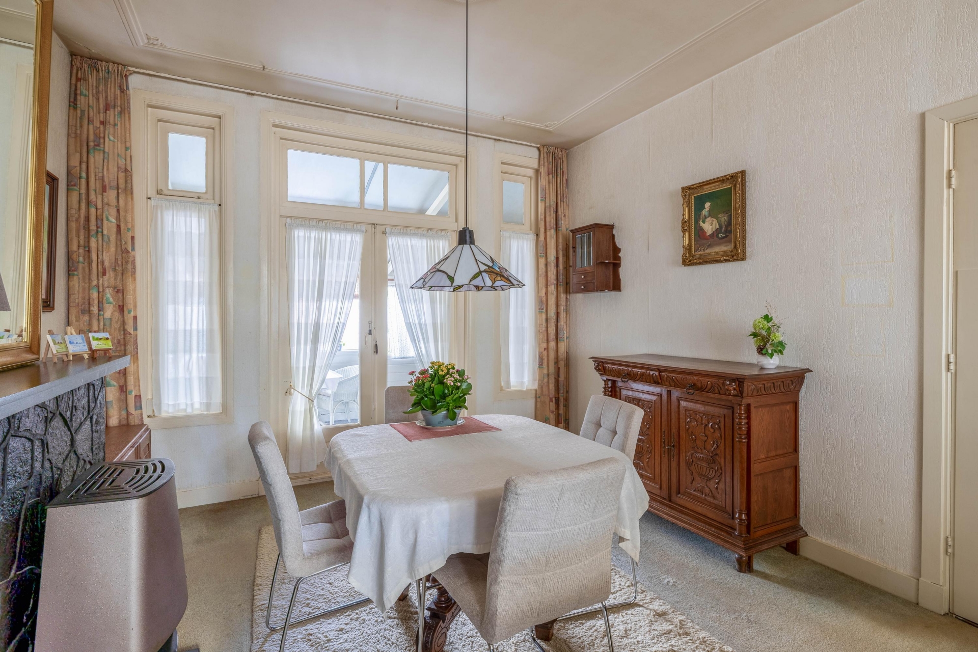 Bij binnenkomst in de hal voel je direct de sfeer van het huis. De woonkamer is licht en heeft nog originele elementen, zoals de erker aan de voorzijde die zorgt voor extra lichtinval en karakter. Er is plek voor een comfortabele zithoek en eettafel, en via de keuken met een verzorgde keukeninrichting loop je zo naar de serre aan de achterzijde met toegang tot de tuin. De afwerking is gedateerd, maar wie hier doorheen kijkt ziet meteen het potentieel: een lichte leefruimte met mooie basis.