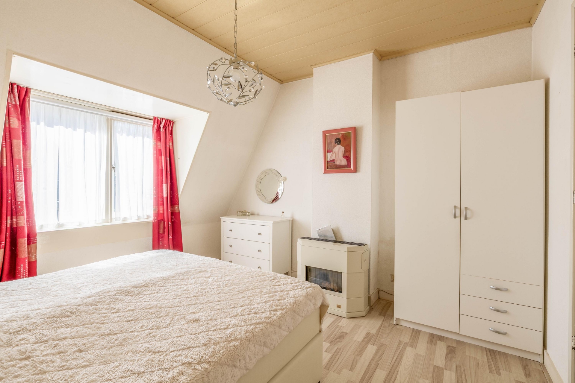 Op de eerste verdieping zijn drie slaapkamers, waarvan de grootste aan de achterzijde ligt en uitkijkt over de tuin. De twee kamers aan de voorzijde zijn ideaal als 2e slaapkamer, werkkamer of logeerplek, waarvan er één is uitgevoerd met dakkapel. De badkamer is eenvoudig, maar biedt net als de rest van het huis alle ruimte om te vernieuwen. Met twee woonlagen en in totaal vier kamers heb je een fijne basis om verder op te bouwen, waarbij er een mogelijkheid is om de woning in de toekomst te verhogen (opbouw). Vanuit de overloop op de 1e verdieping is er een ruime bergvliering bereikbaar.