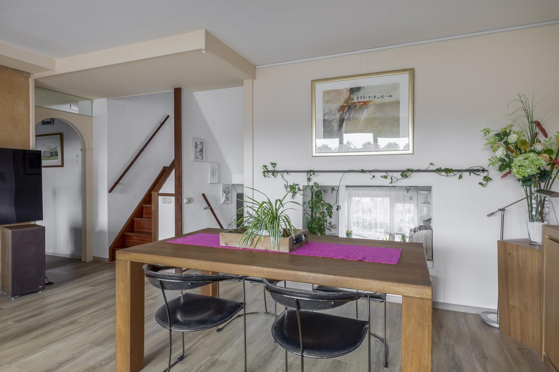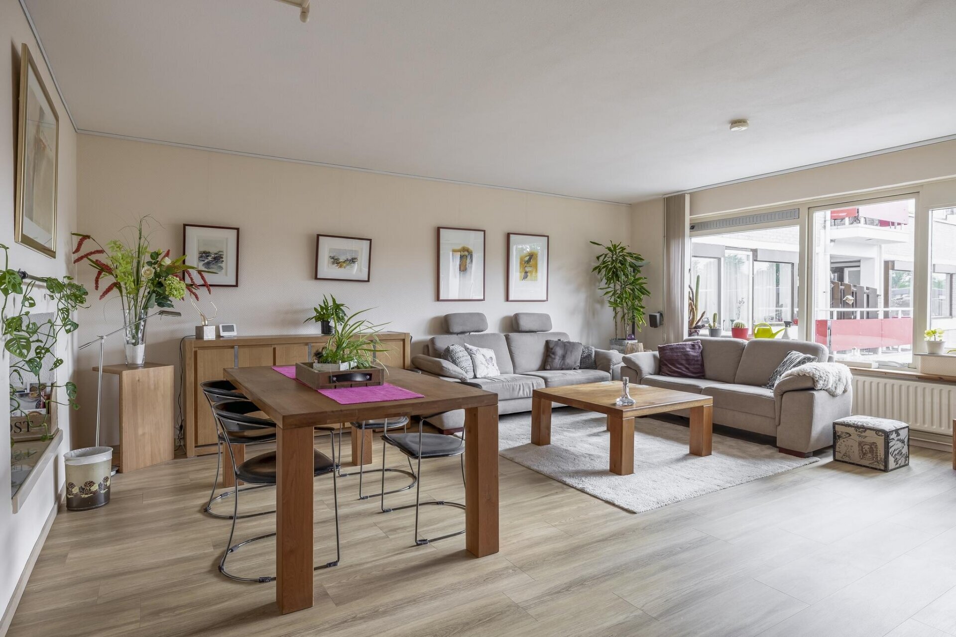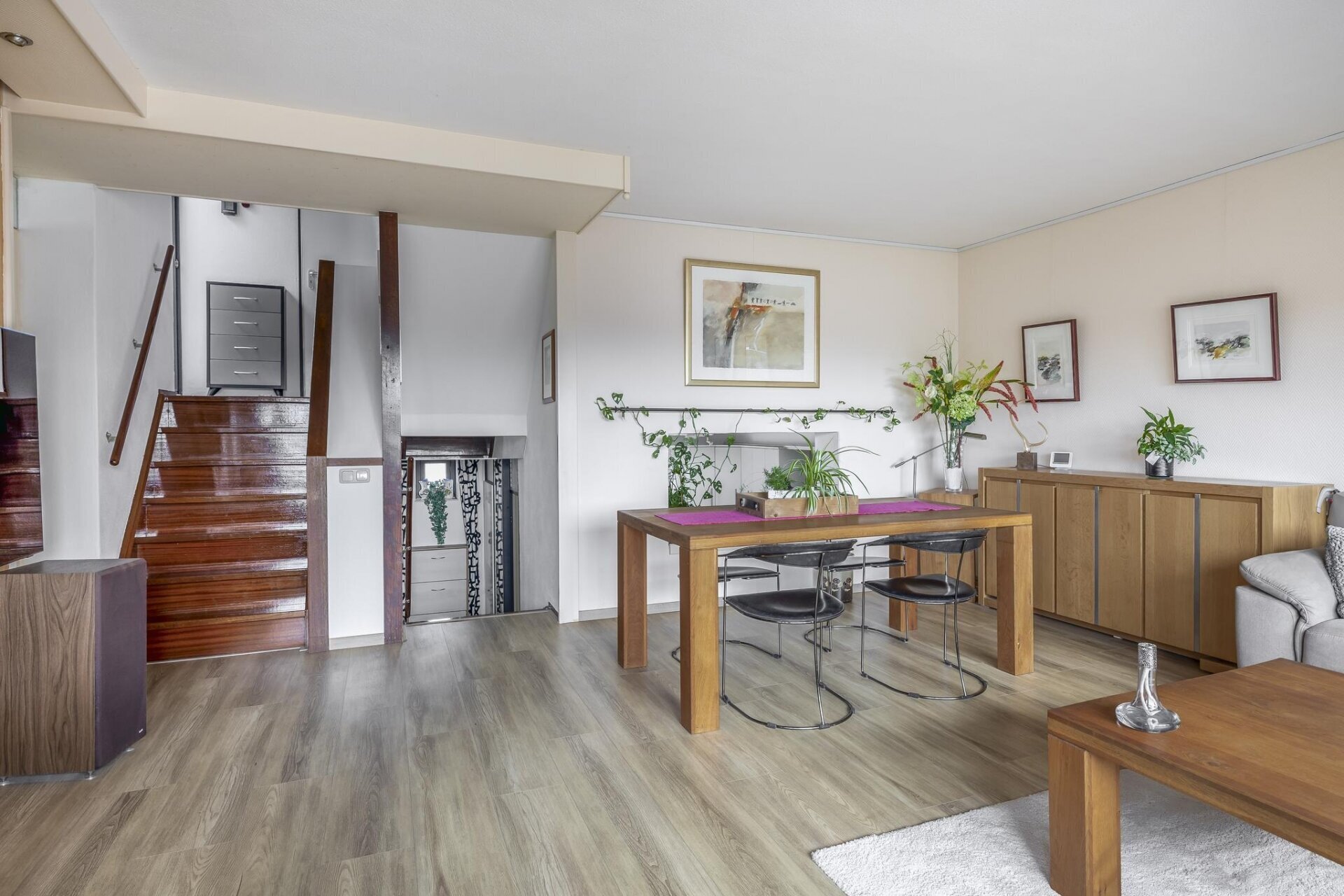 Met een woonoppervlakte van 112 m² is dit 5-kamerappartement allesbehalve standaard. Door de split-level indeling heeft het huis een verrassend speels karakter én veel lichtinval. De ruime woonkamer is warm en sfeervol, met voldoende plek voor een grote zithoek én een aparte eethoek. Grote ramen zorgen voor een fijne connectie met buiten en brengen veel daglicht binnen. De gehele ruimte is keurig afgewerkt met een lichte vloer, nette wanden en een verzorgd plafond. Het gevoel van ruimte en comfort overheerst direct bij binnenkomst.