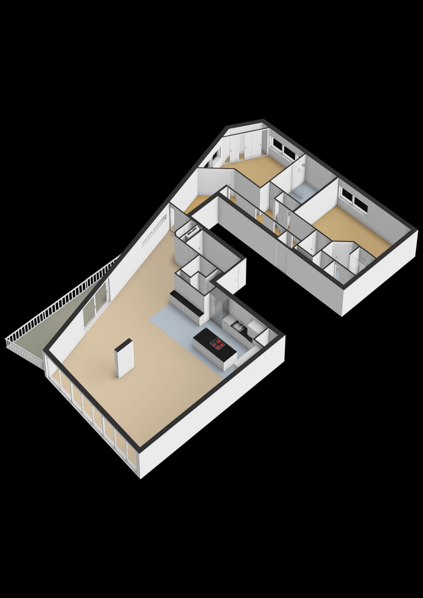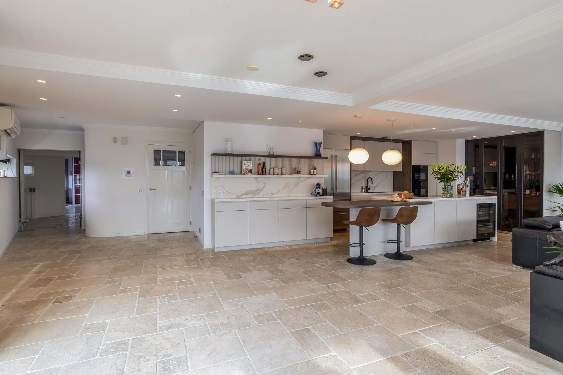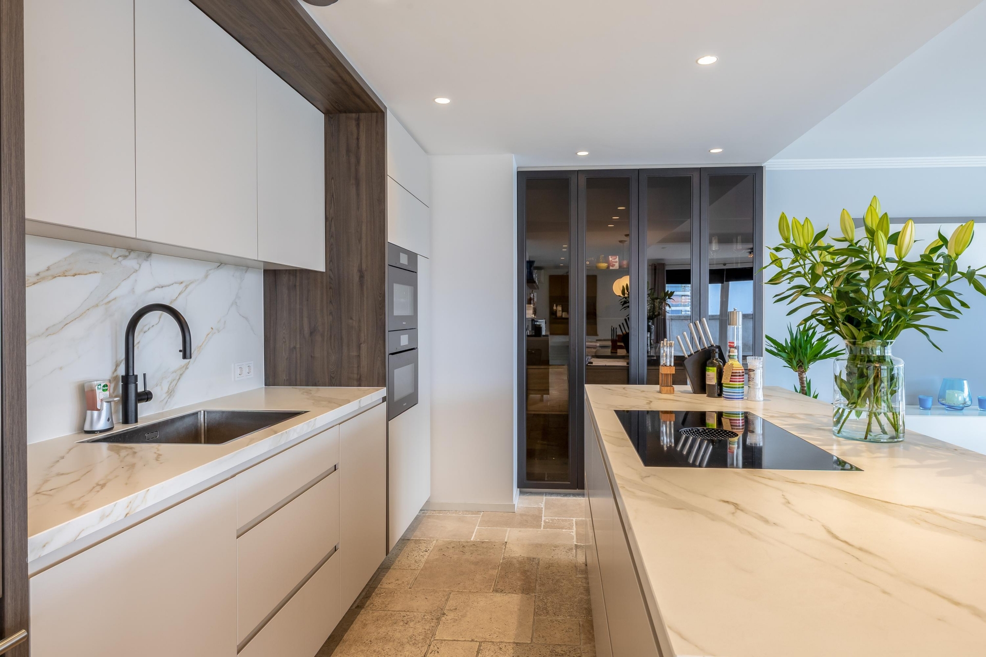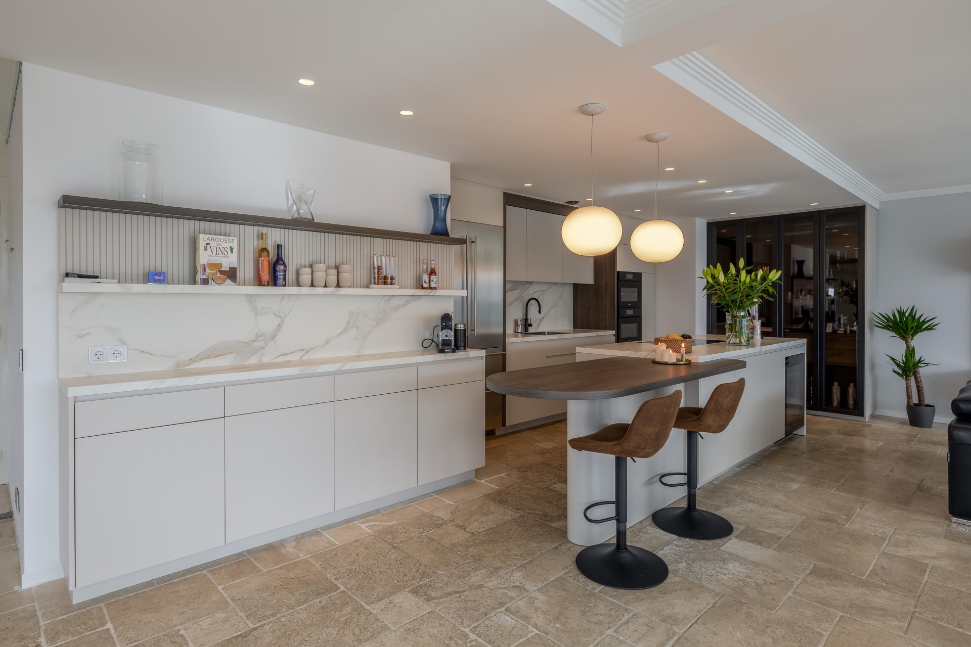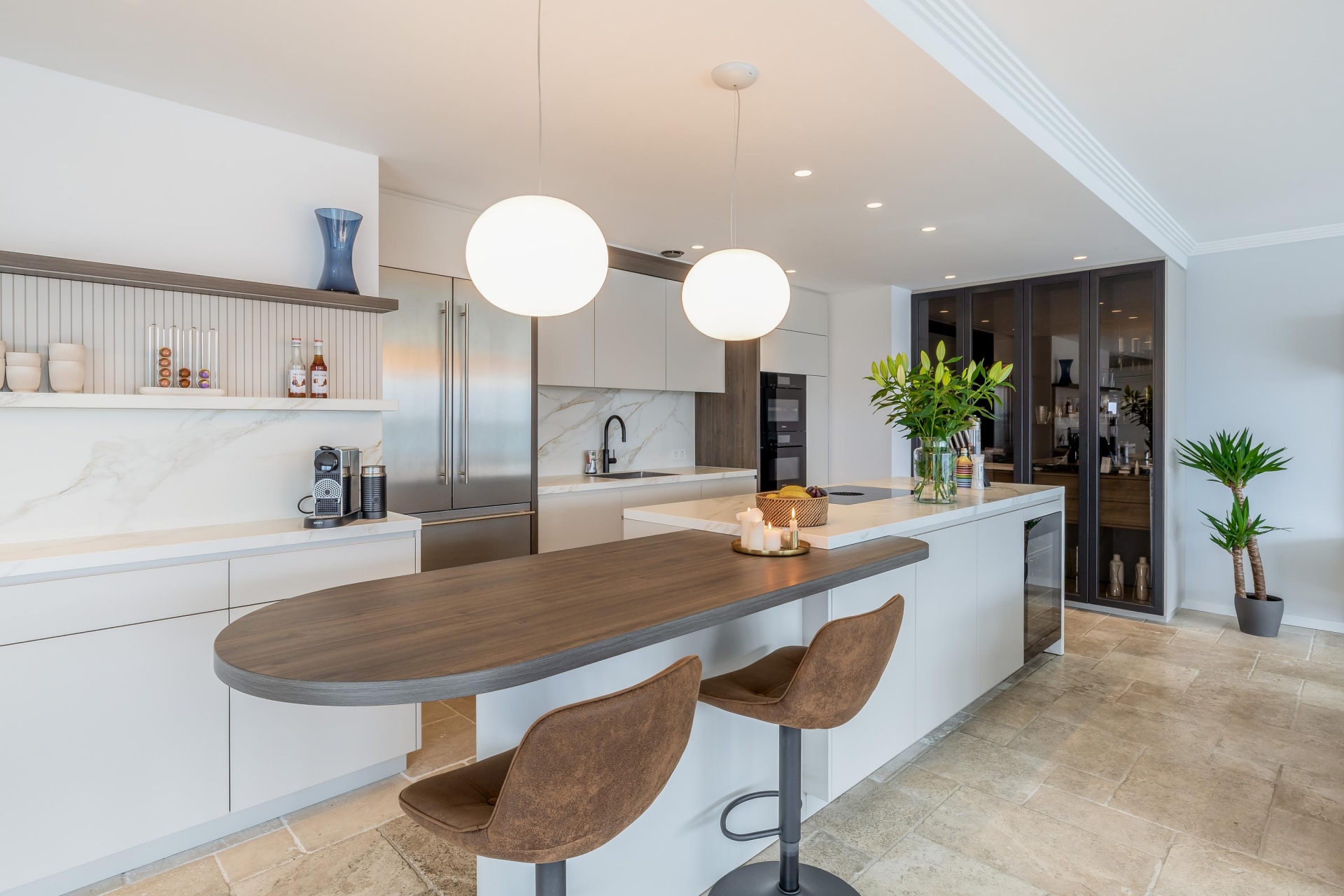 Centraal in de ruimte ligt de gloednieuwe keuken (2025): een echte blikvanger! Voorzien van een kookeiland, strakke marmerlook werkbladen, hoogwaardige inbouwapparatuur (Miele) en veel opbergruimte. Het eiland biedt bovendien plaats voor een gezellige zit aan de bar, waardoor koken en samenzijn vanzelf samengaan.