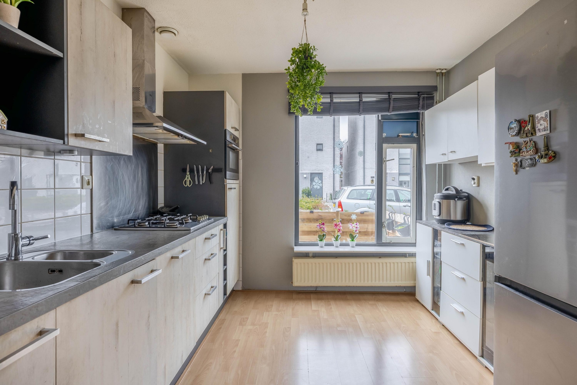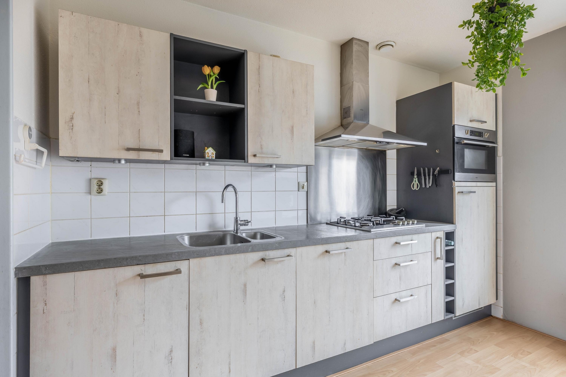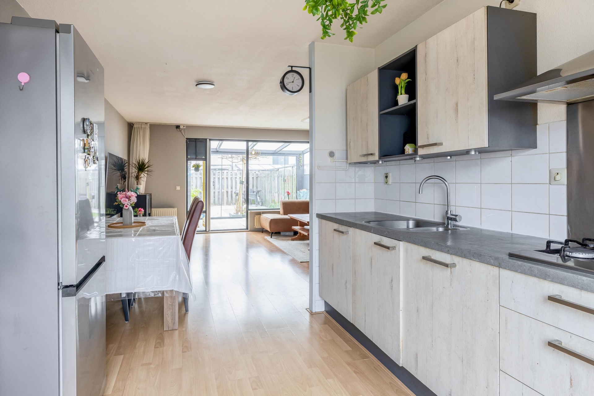 Aan de voorzijde van het huis vind je de keuken. Deze is praktisch ingericht met voldoende werk- en opbergruimte. De lichte kastfronten in combinatie met het werkblad zorgen voor een frisse uitstraling. Hier kook je met gemak een doordeweekse maaltijd, terwijl je toch in contact blijft met de rest van het huis.
