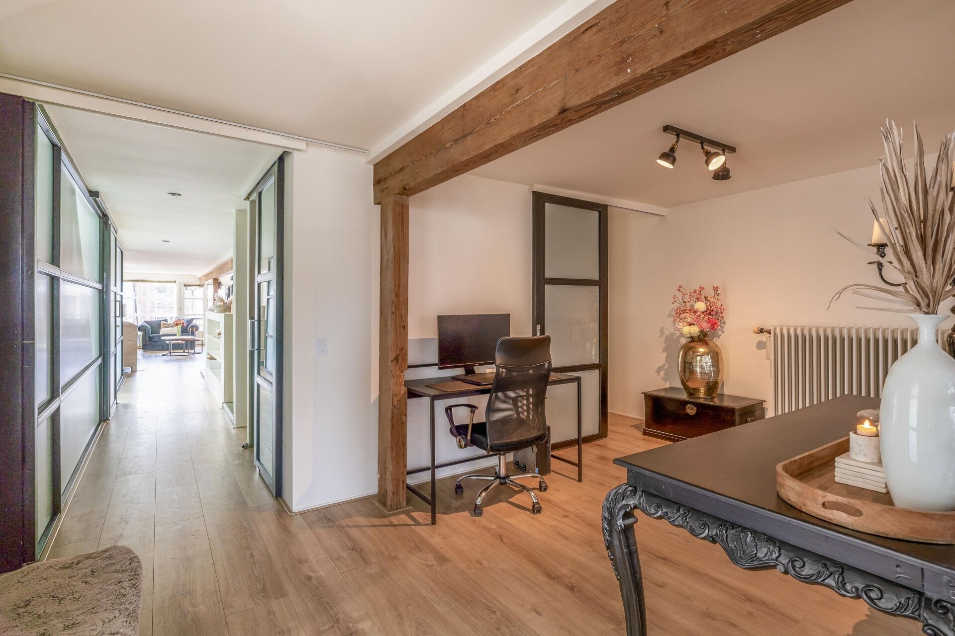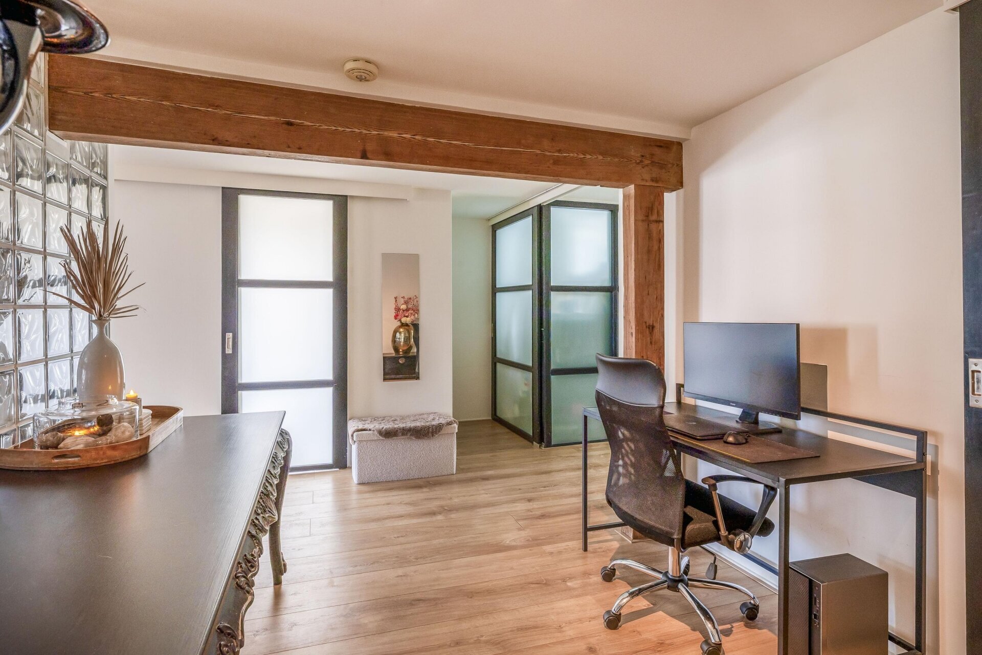 In het midden van de woning vind je een open ruimte die nu dienst doet als werkplek perfect voor thuiswerken. Hier bevindt zich ook een ruime berging met wasmachineaansluiting en opstelling voor de cv-ketel (Remeha, ca. 2016). Onder de trap is nog een aparte afsluitbare bergkast aanwezig.