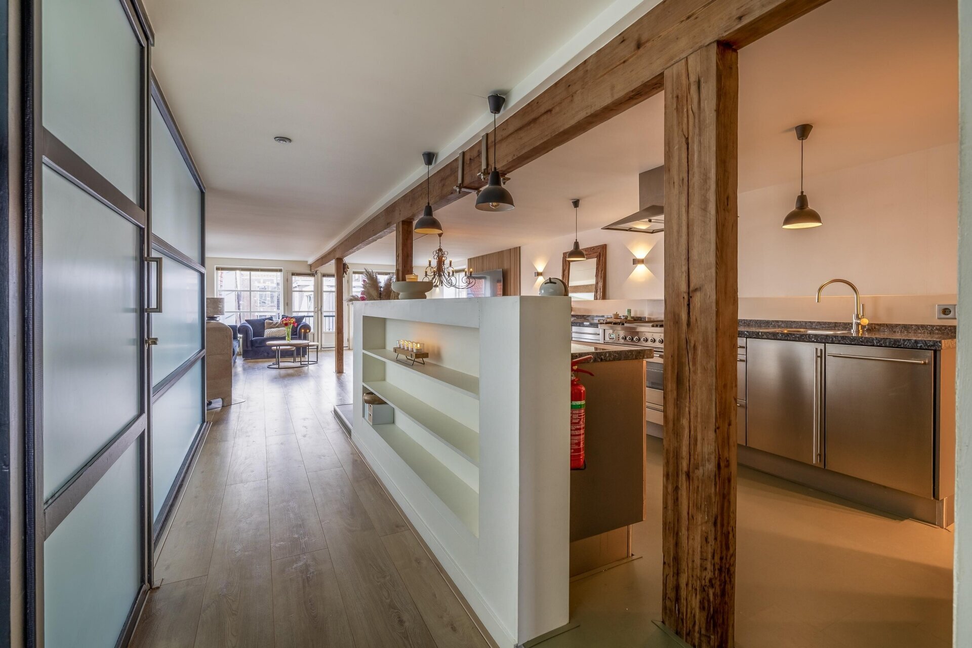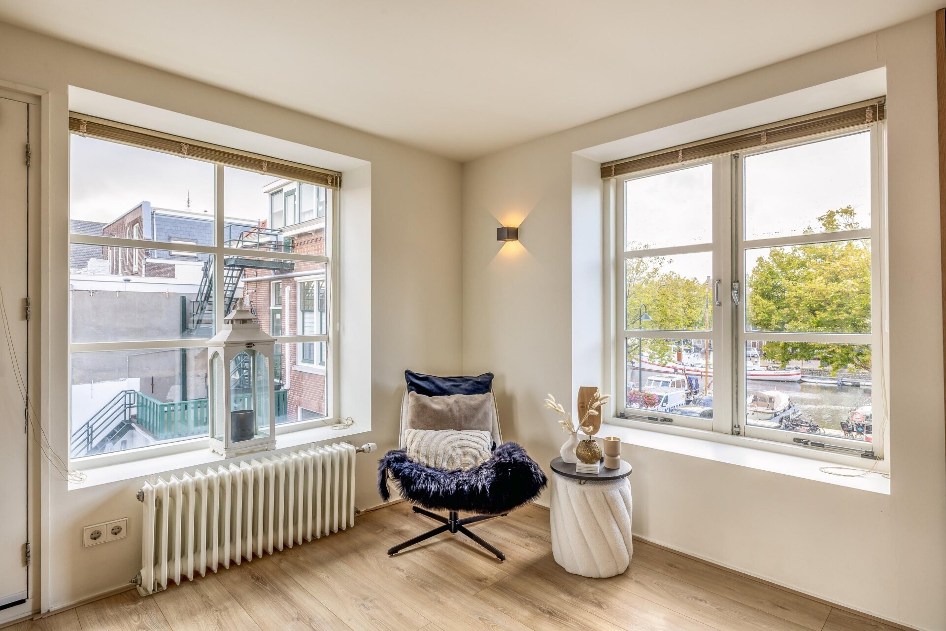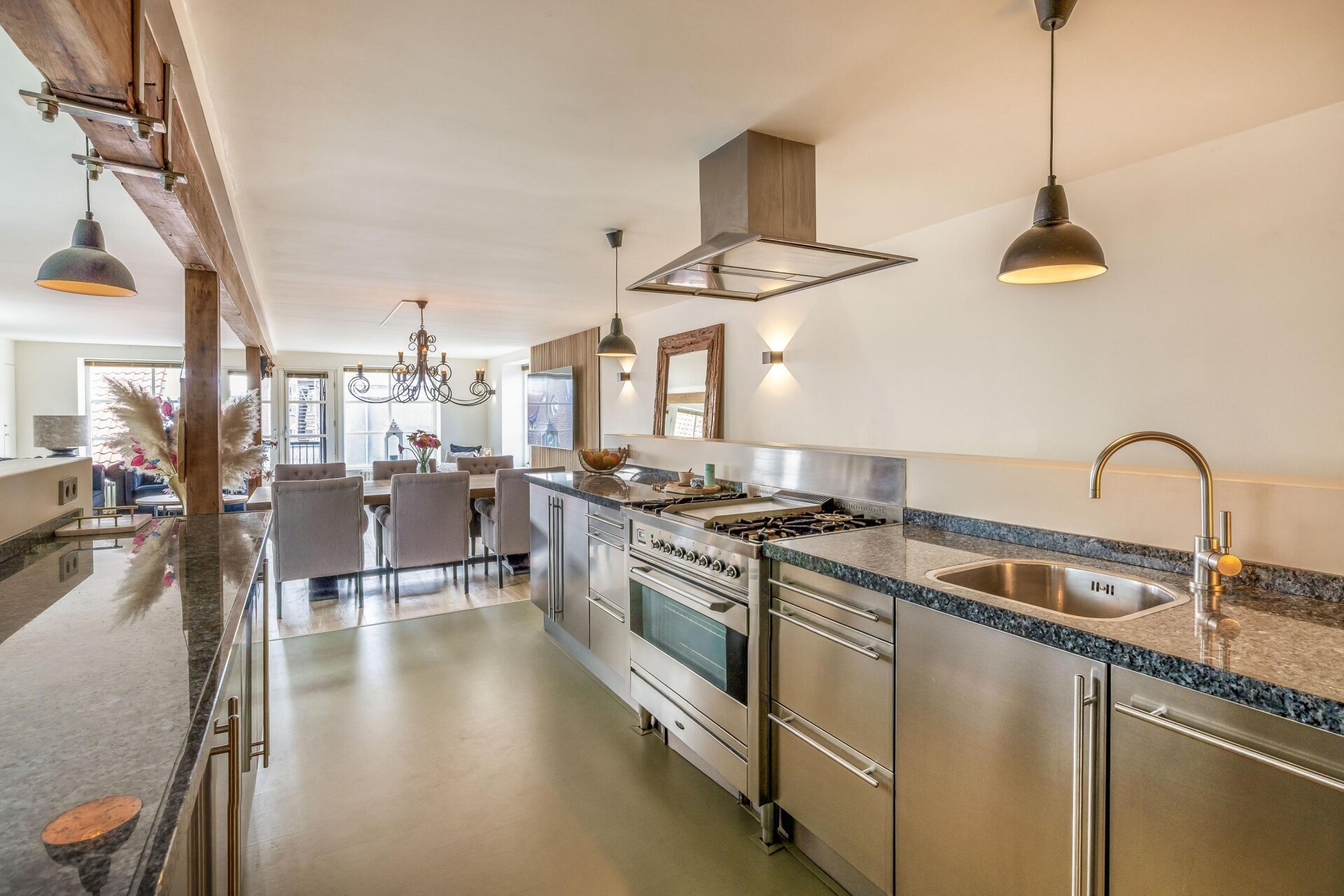 De woonkamer is ruim en heeft openslaande deuren naar een Frans balkon. Vanaf de vensterbank kun je heerlijk wegkijken over het water of de karakteristieke bebouwing in de straat. Aan de voorzijde profiteer je van ochtendzon, wat zorgt voor een fijne start van de dag. De open keuken, centraal in de ruimte, is modern uitgevoerd met een robuust roestvrijstalen keukenblok en een natuurstenen werkblad. Voorzien van onder meer een Boretti-fornuis, Amerikaanse koelkast (2022), vaatwasser (2021) en diverse andere inbouwapparatuur – een ideale plek om te koken én gezellig te tafelen.