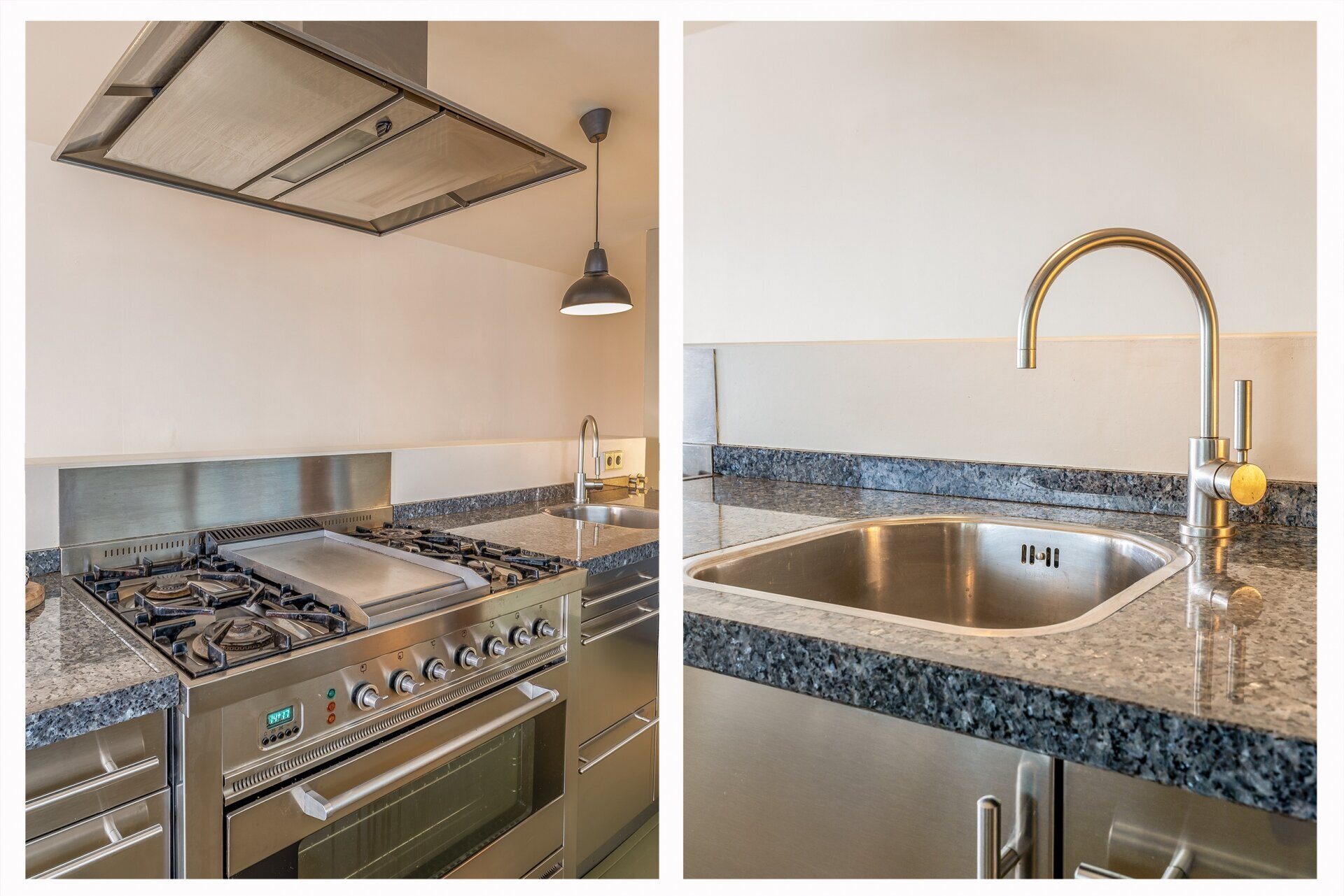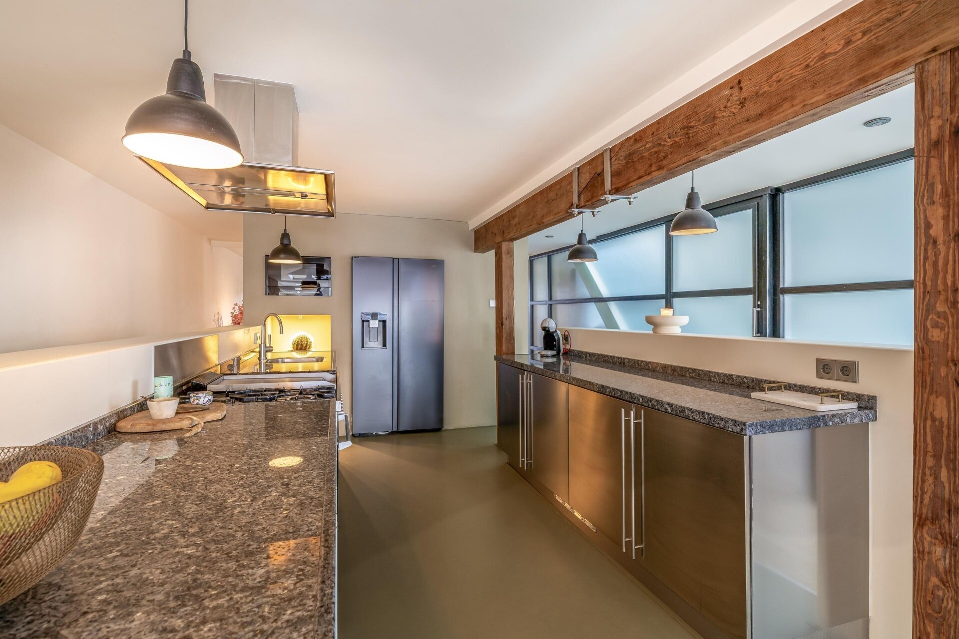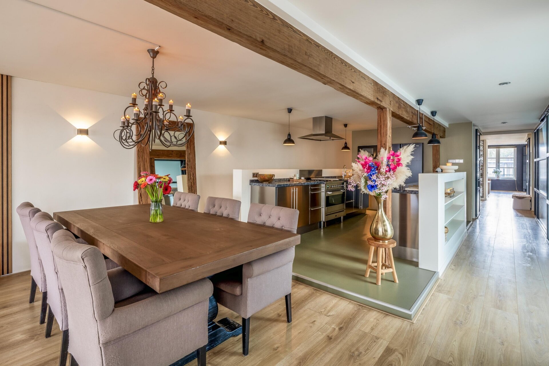 De woonkamer is ruim en heeft openslaande deuren naar een Frans balkon. Vanaf de vensterbank kun je heerlijk wegkijken over het water of de karakteristieke bebouwing in de straat. Aan de voorzijde profiteer je van ochtendzon, wat zorgt voor een fijne start van de dag. De open keuken, centraal in de ruimte, is modern uitgevoerd met een robuust roestvrijstalen keukenblok en een natuurstenen werkblad. Voorzien van onder meer een Boretti-fornuis, Amerikaanse koelkast (2022), vaatwasser (2021) en diverse andere inbouwapparatuur – een ideale plek om te koken én gezellig te tafelen.
