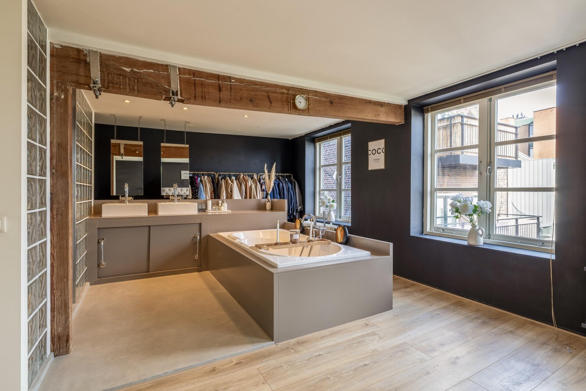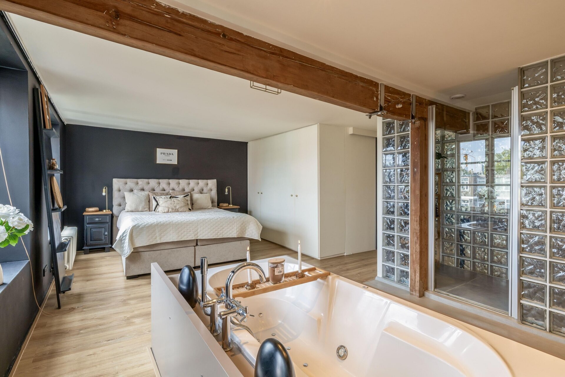 Naast de sfeervolle woonkamer en keuken beschikt de loft over twee ruime slaapkamers en een luxe badkamer. De master bedroom aan de achterzijde is voorzien van diepe inbouwkasten (2020) en heeft een en-suite badkamer met whirlpool ligbad, ruime inloopdouche en een wastafelmeubel met dubbele wasbak. Alles is in 2020 vernieuwd met oog voor kwaliteit en stijl. De tweede slaapkamer heeft twee praktische vaste kasten met schuifdeuren.