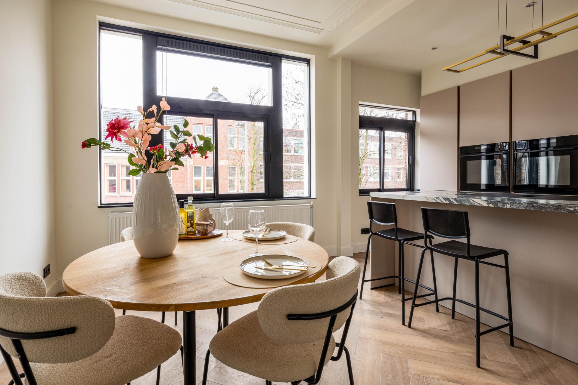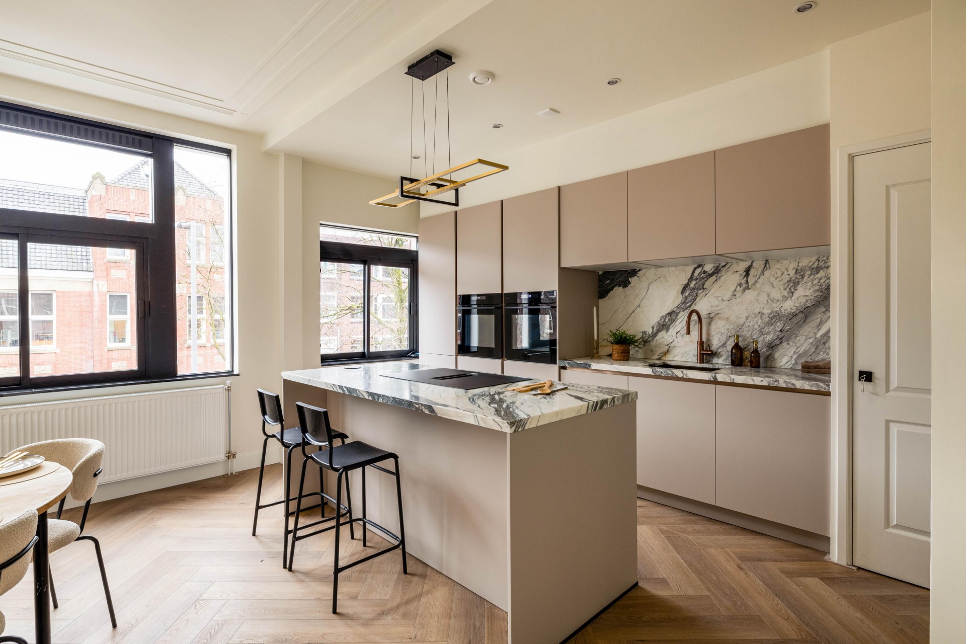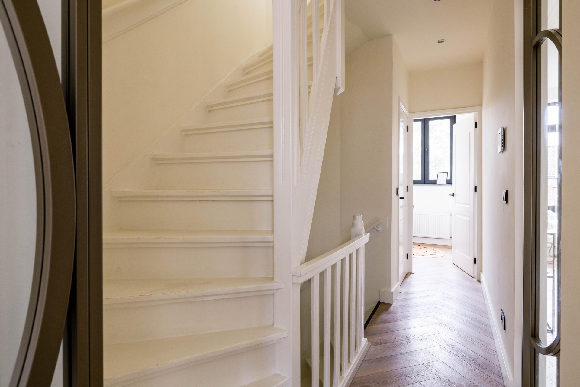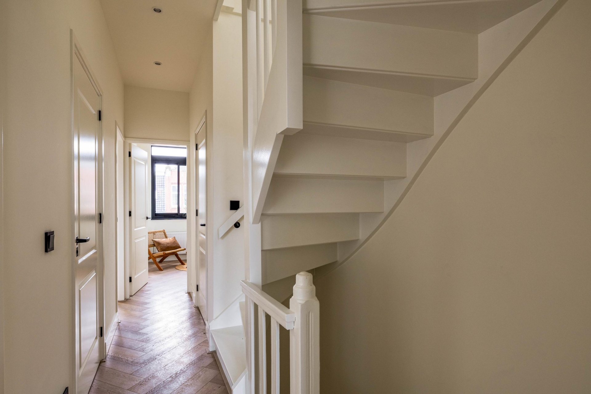 De leefverdieping is royaal opgezet en baadt in het daglicht. Grote ramen zorgen voor een prettige lichtinval en de indeling biedt volop ruimte voor zowel een comfortabele zithoek als een ruime eethoek. De combinatie van de visgraatvloer, strakke wanden en subtiele details creëert een moderne, rustige sfeer met behoud van karakter.