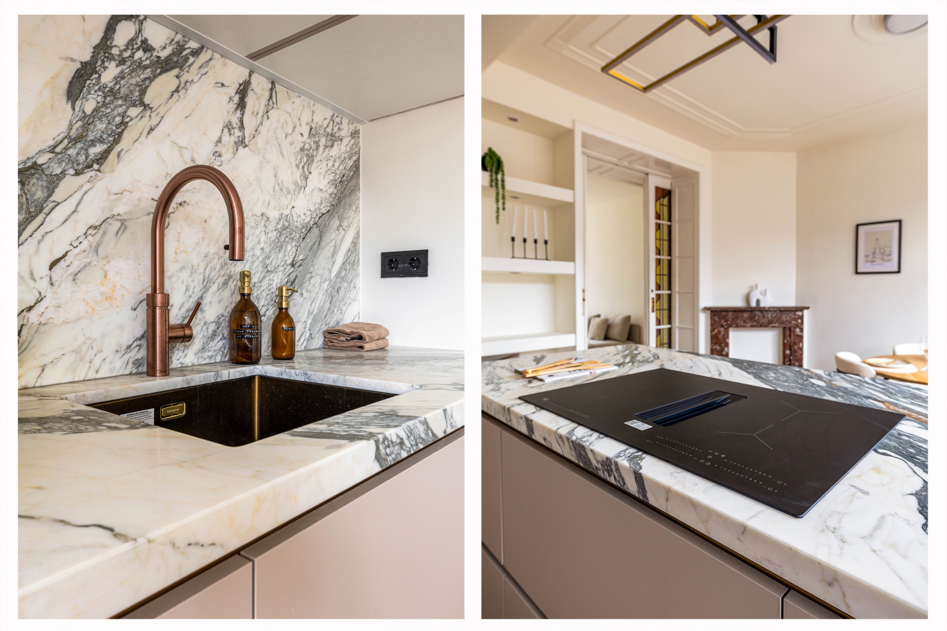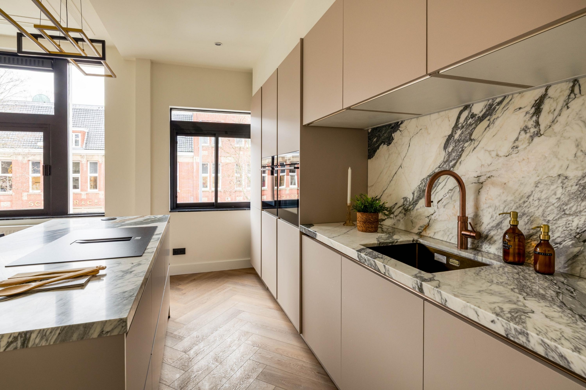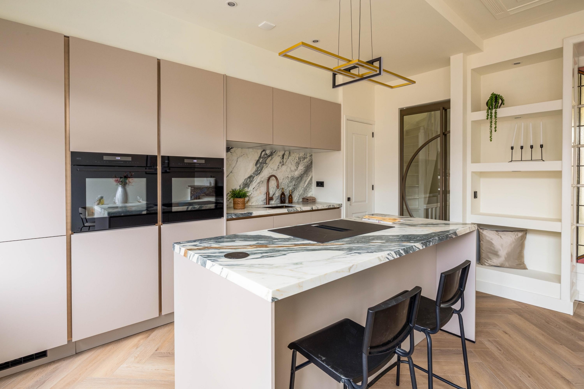 De open keuken vormt zonder twijfel het hart van de woning. Het kookeiland nodigt uit tot samen koken, borrelen en tafelen. Het marmeren werkblad geeft de keuken een luxe uitstraling en is tegelijk praktisch in gebruik. Uiteraard is de keuken uitgerust met hoogwaardige inbouwapparatuur en een Quooker, waardoor comfort en gebruiksgemak hier vanzelfsprekend zijn. Dit is een keuken waar koken geen verplichting is, maar een beleving.