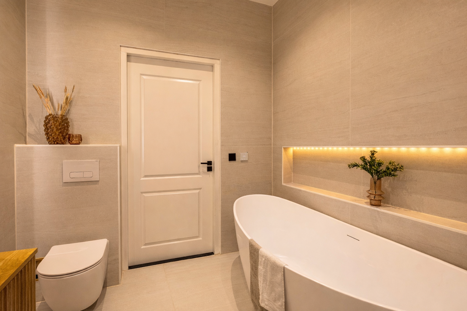 De badkamer is modern, stijlvol en tot in detail afgewerkt. Een plek om echt tot rust te komen. Voorzien van een ligbad, een ruime inloopdouche met strak glaswerk en een dubbele wastafel met elegante kranen. De gebruikte materialen zijn warm en tijdloos, wat zorgt voor een serene en verzorgde uitstraling. Daarnaast is er een separaat toilet in dezelfde hoogwaardige stijl.