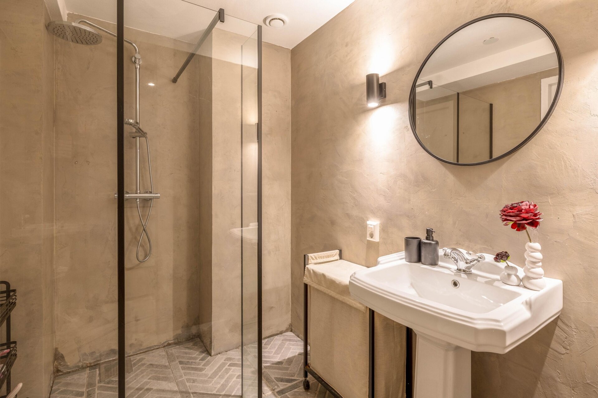 - Luxe badkamer met visgraatmotief vloer en beton ciré wandafwerking