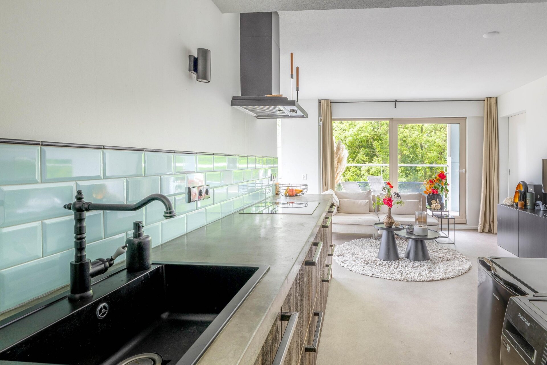 De keuken springt in het oog met massief houten barnwood fronten en een betonnen werkblad, voorzien van moderne inbouwapparatuur. De badkamer is afgewerkt met visgraatmotief vloertegels en beton ciré wanden, wat een luxe en eigentijdse sfeer creëert.