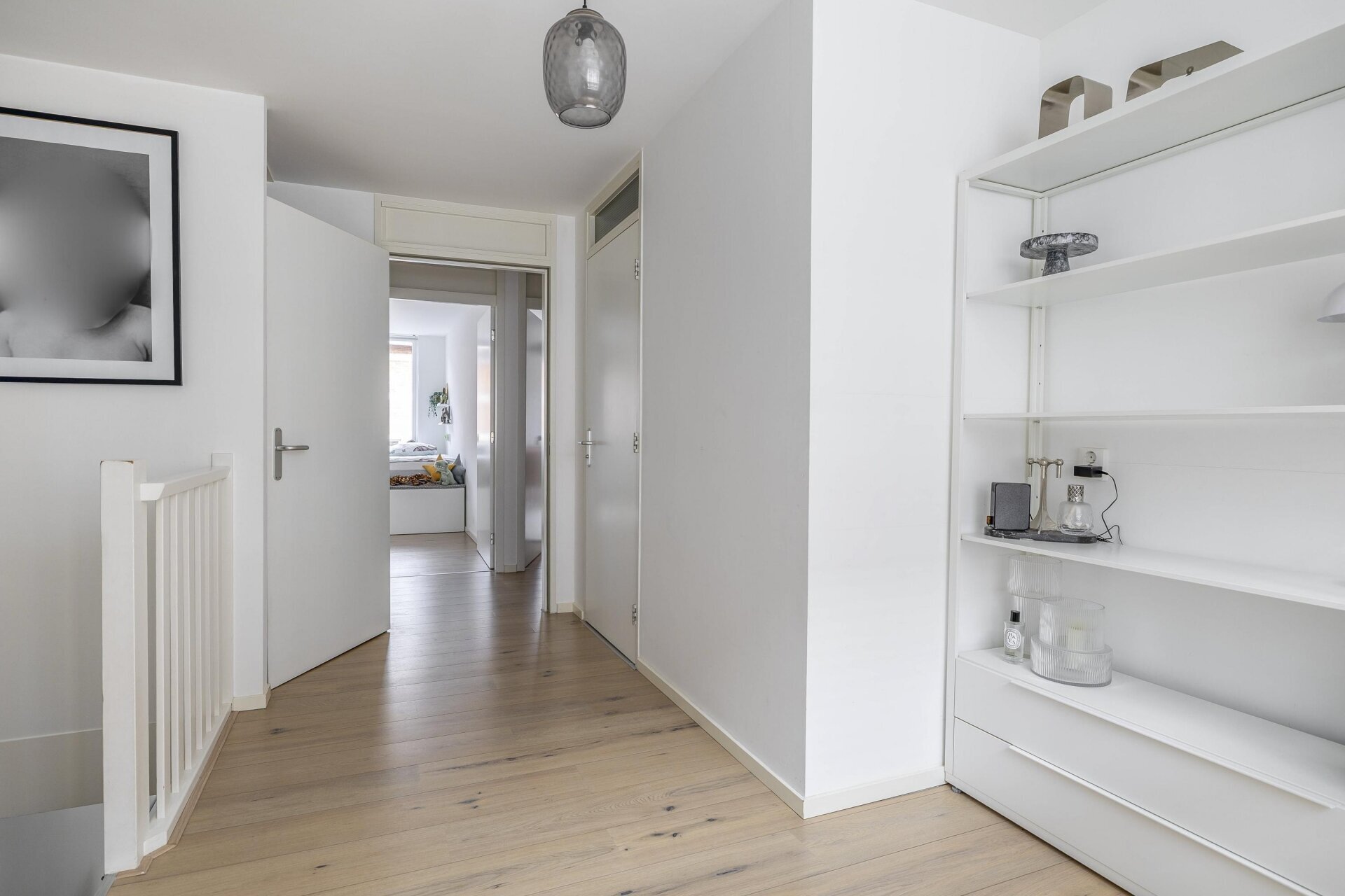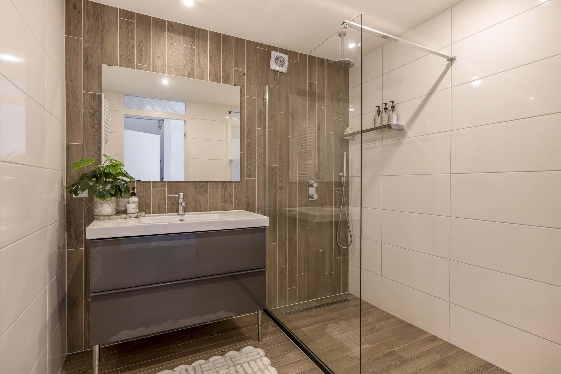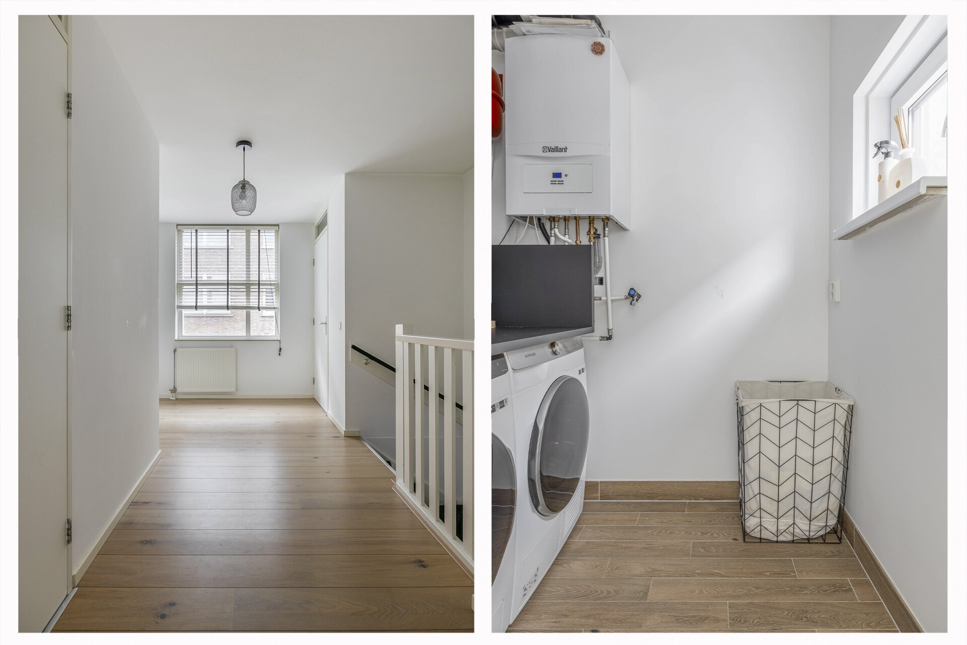 De eerste verdieping telt twee goed bemeten slaapkamers met laminaatvloeren en veel lichtinval. De badkamer is modern en uitgerust met een inloopdouche, wastafelmeubel, designradiator en luxe betegeling. Daarnaast is er een separaat tweede toilet en een aparte ruimte voor de wasmachine en cv-installatie.