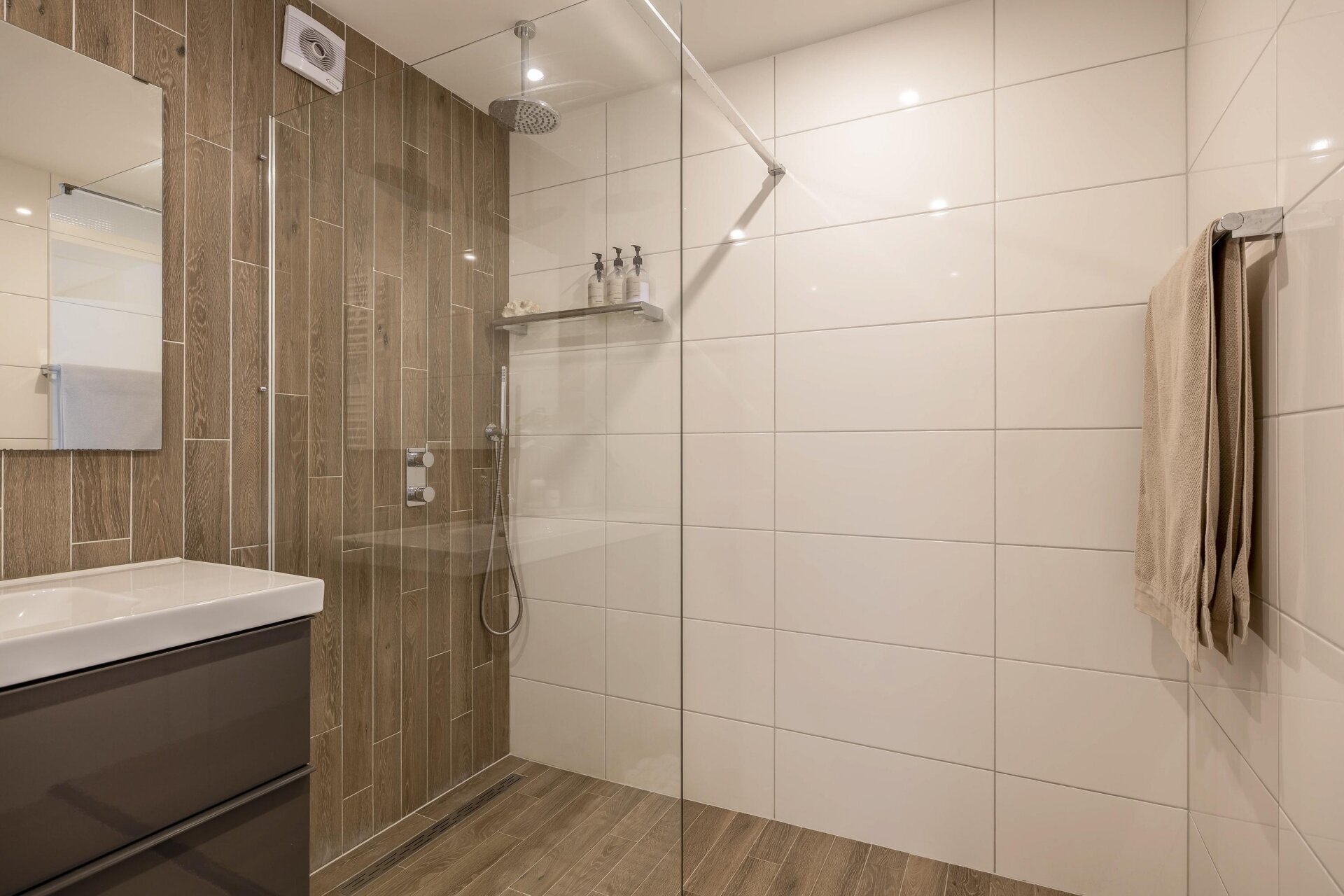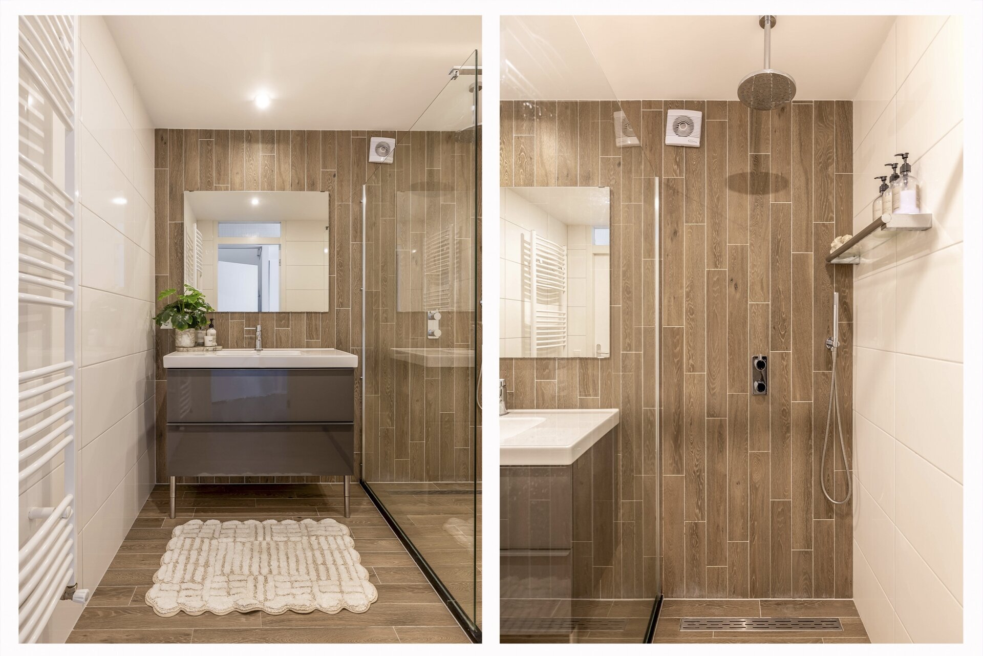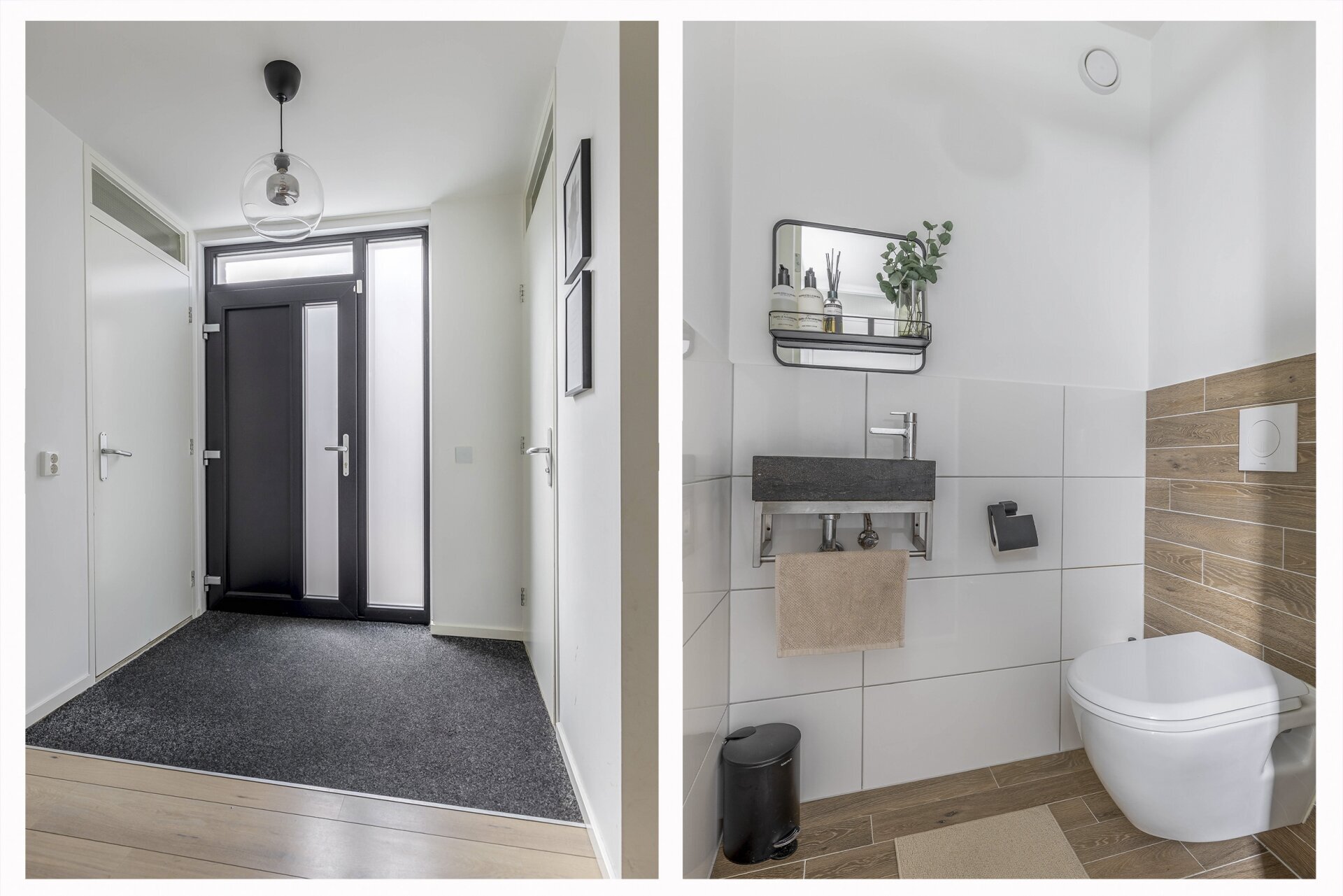 De eerste verdieping telt twee goed bemeten slaapkamers met laminaatvloeren en veel lichtinval. De badkamer is modern en uitgerust met een inloopdouche, wastafelmeubel, designradiator en luxe betegeling. Daarnaast is er een separaat tweede toilet en een aparte ruimte voor de wasmachine en cv-installatie.