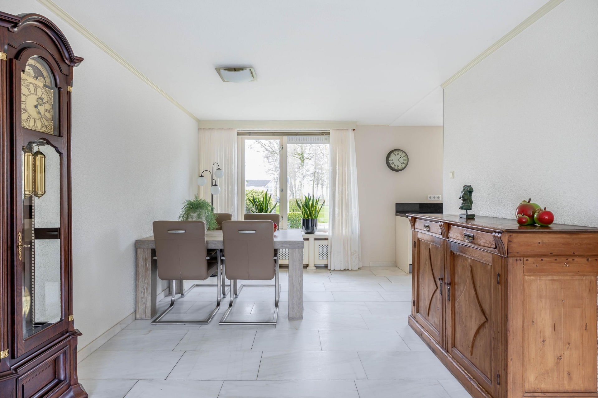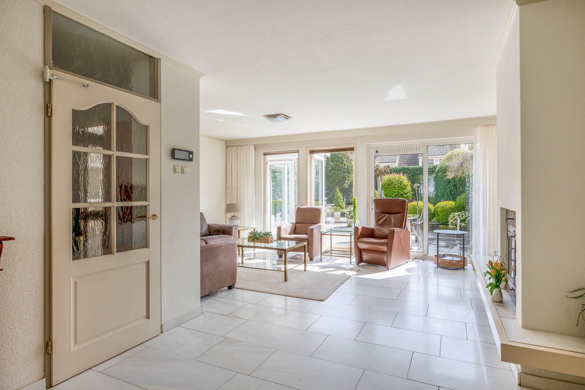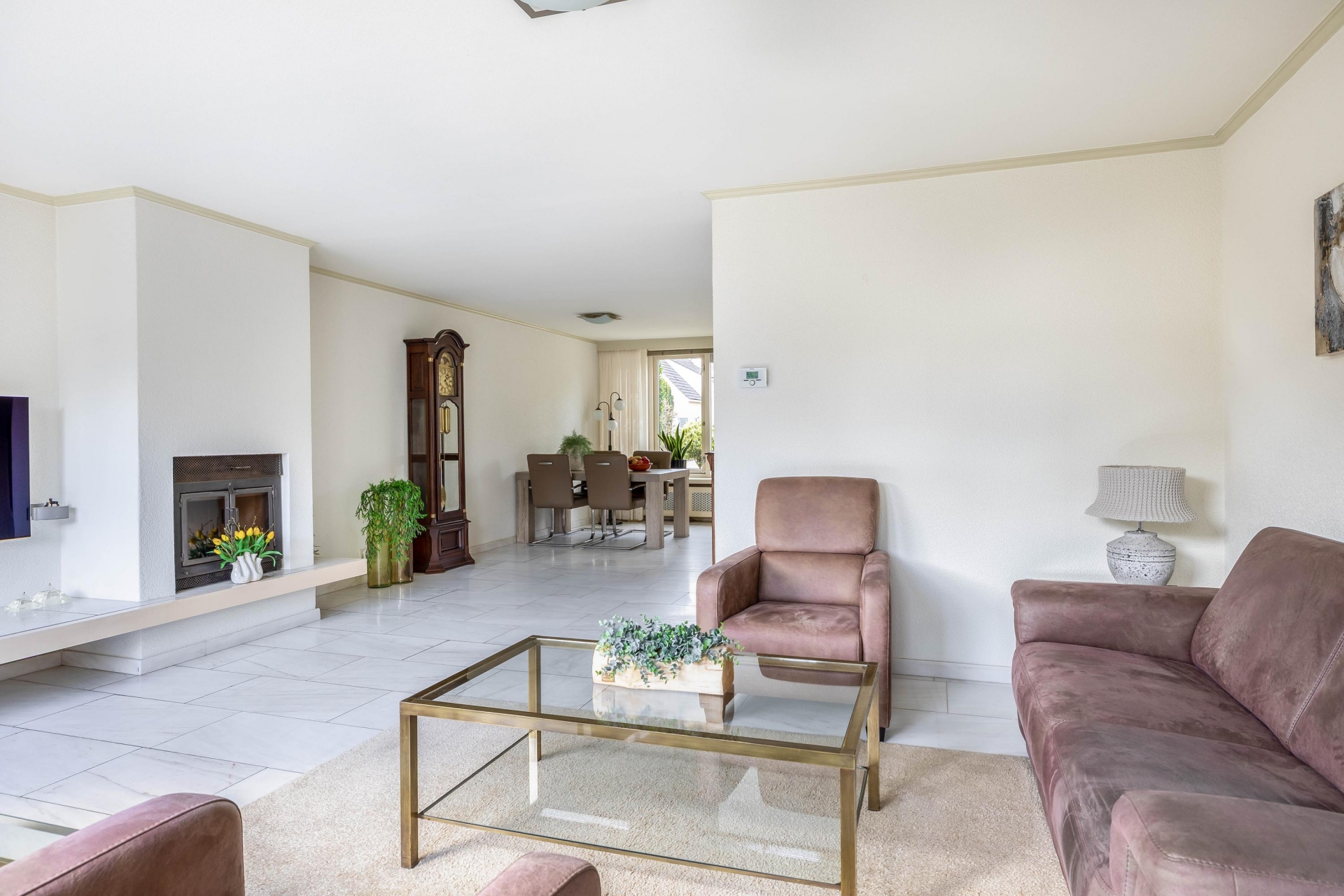Zodra je binnenkomt valt direct de lichte en ruime opzet van de woonkamer op. Dankzij de grote raampartijen aan de achterzijde en de schuifpui naar de tuin stroomt het daglicht rijkelijk naar binnen. De zithoek is tuingericht en biedt een fijn uitzicht op het groen. Er is ook meer dan genoeg ruimte voor een royale eettafel. De indeling is praktisch en prettig: er is een duidelijke scheiding tussen zit- en eetgedeelte, zonder dat het zijn open karakter verliest. De open haard zorgt voor extra sfeer op de koudere dagen, terwijl je in de zomer juist de tuin eenvoudig bij de leefruimte betrekt.