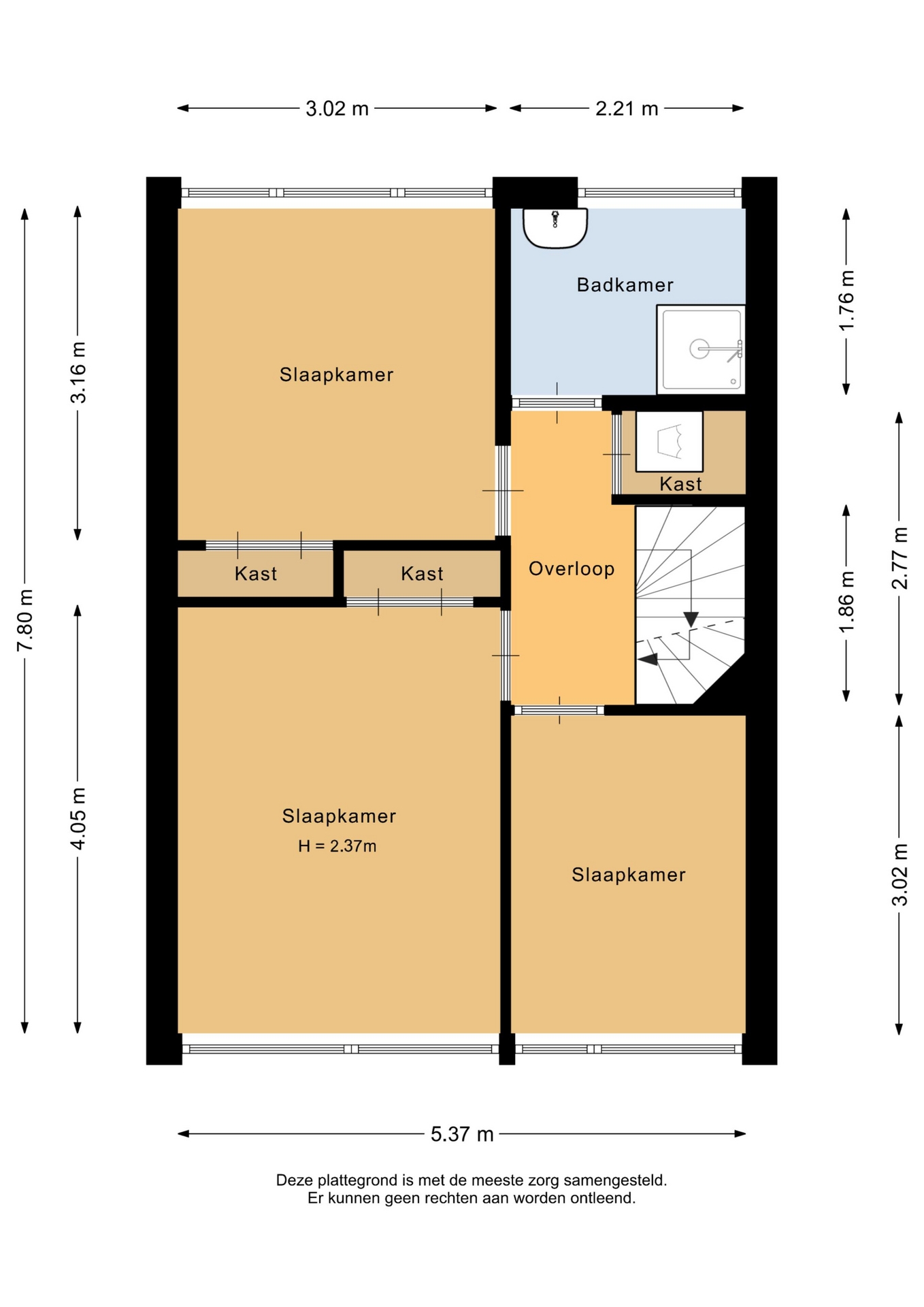 Het huis telt in totaal drie verdiepingen en vijf kamers. Op de eerste verdieping zijn drie slaapkamers en de badkamer te vinden. Deze kamers verschillen in formaat, maar zijn allemaal voorzien van daglicht en goed bruikbaar als slaap-, werk- of logeerkamer. De badkamer is eenvoudig maar functioneel. Via een vaste trap kom je op de tweede verdieping, waar je een vierde slaapkamer vindt, met dakraam en bergruimte achter knieschotten. Deze verdieping leent zich ook uitstekend als thuiskantoor of hobbyruimte.