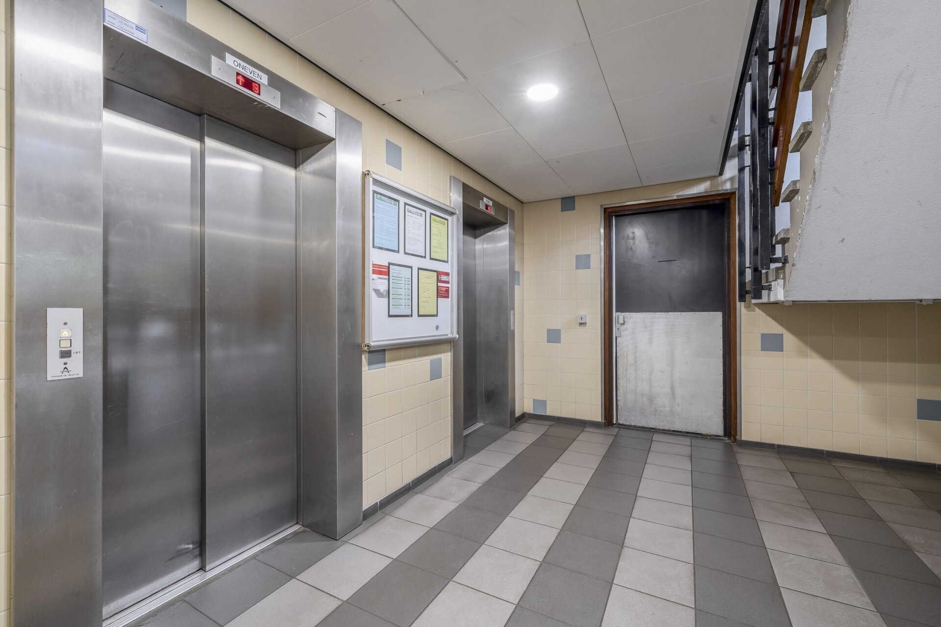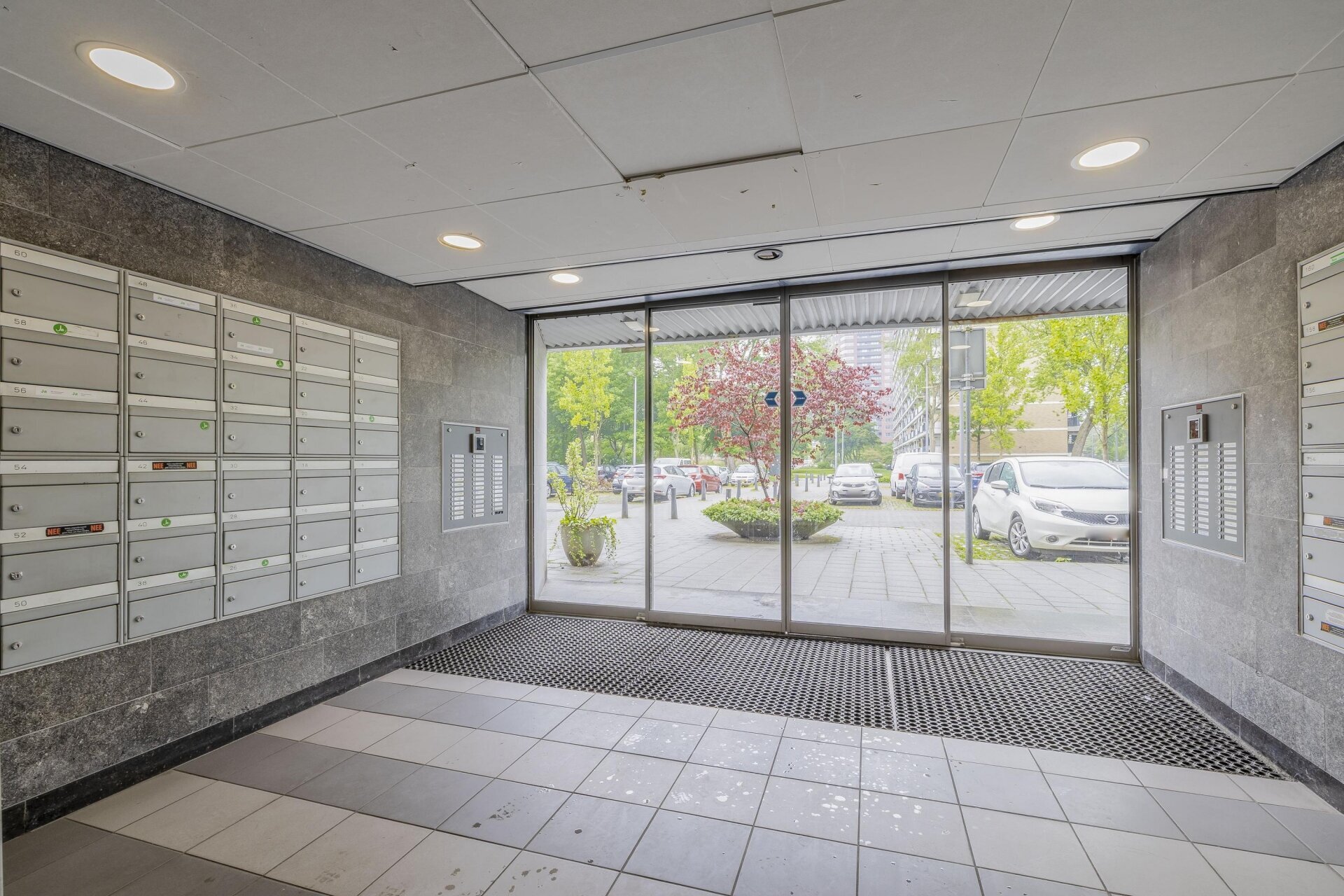 Beneden bij de ingang van het complex treffen we de liften, het bellentableau, de brievenbussen, bergingen en het trappenhuis.