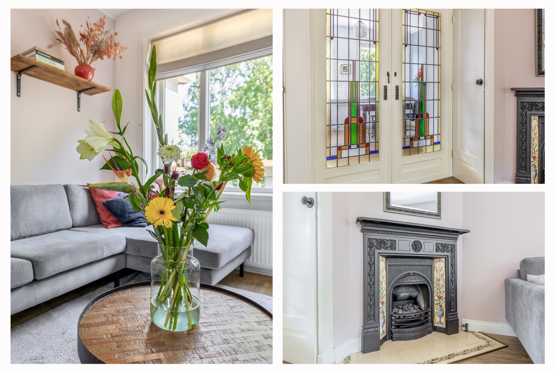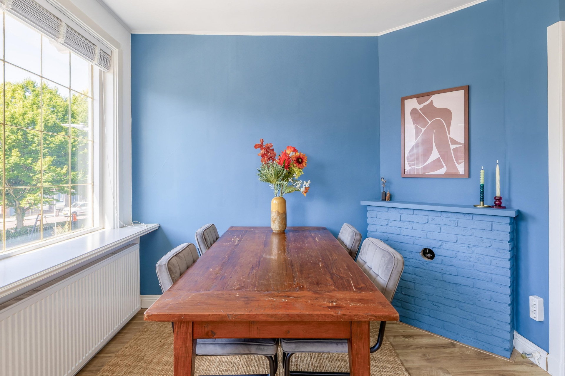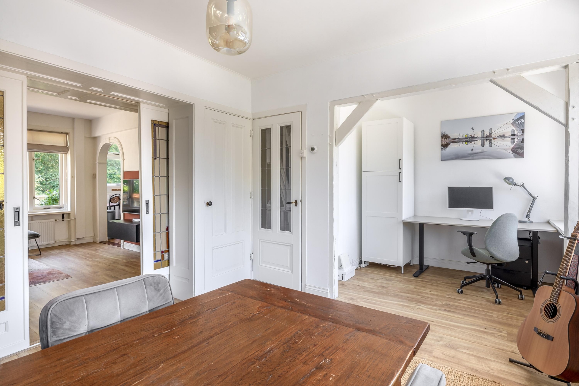 De woonkamer op de eerste verdieping is een sfeervolle en lichte leefruimte, met originele glas-in-lood en suite deuren die de zit- en eethoek op een karakteristieke manier van elkaar scheiden. De voormalige zijkamer is bij de woonkamer getrokken, waardoor er een fijne werkplek is ontstaan, ideaal voor wie regelmatig thuis werkt. De klassieke elementen worden moeiteloos gecombineerd met een moderne afwerking: begin 2025 is vrijwel het hele appartement onder handen genomen. Alleen de keuken en het toilet op deze verdieping zijn niet onder handen genomen, maar dat geeft je meteen de kans om daar je eigen draai aan te geven.