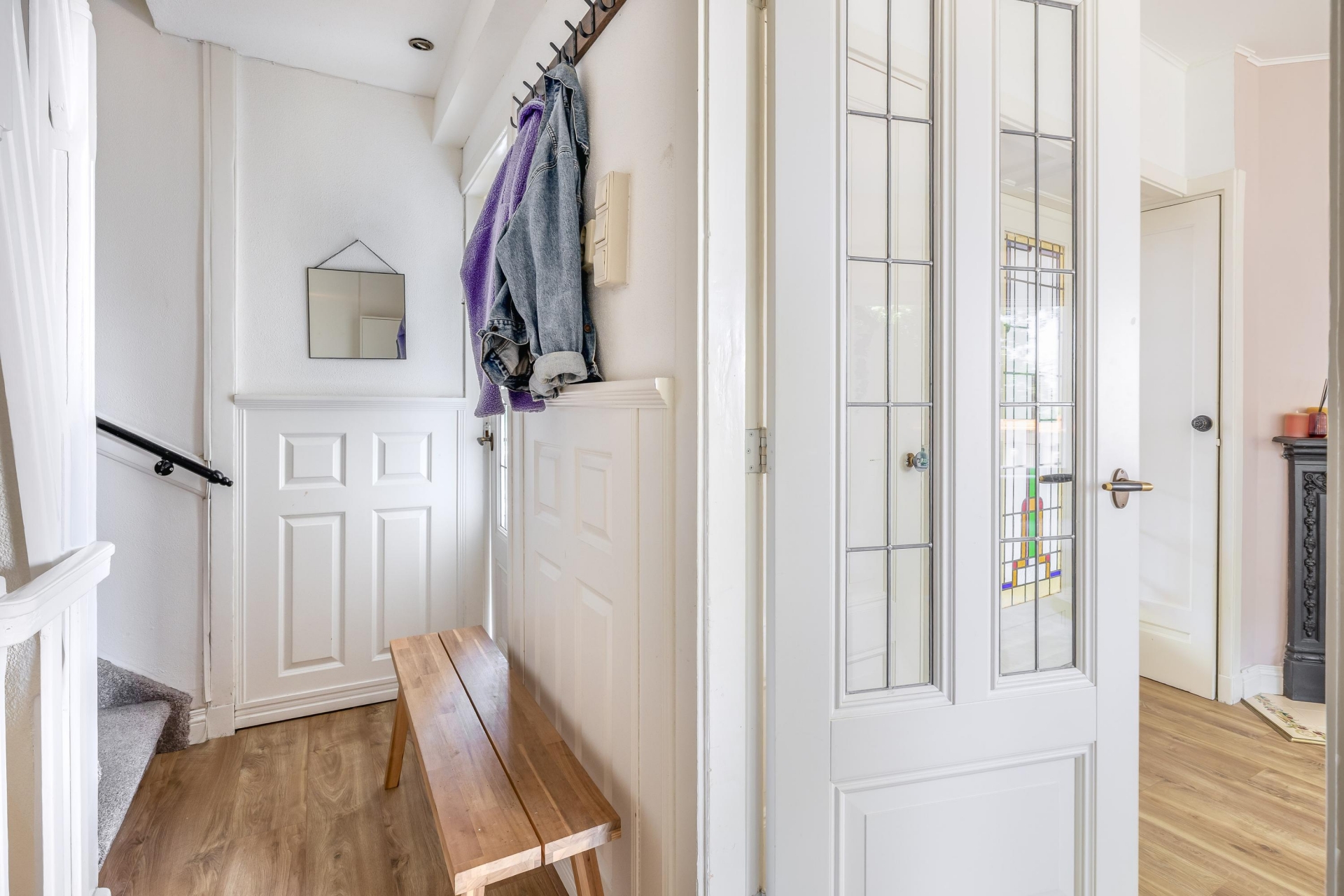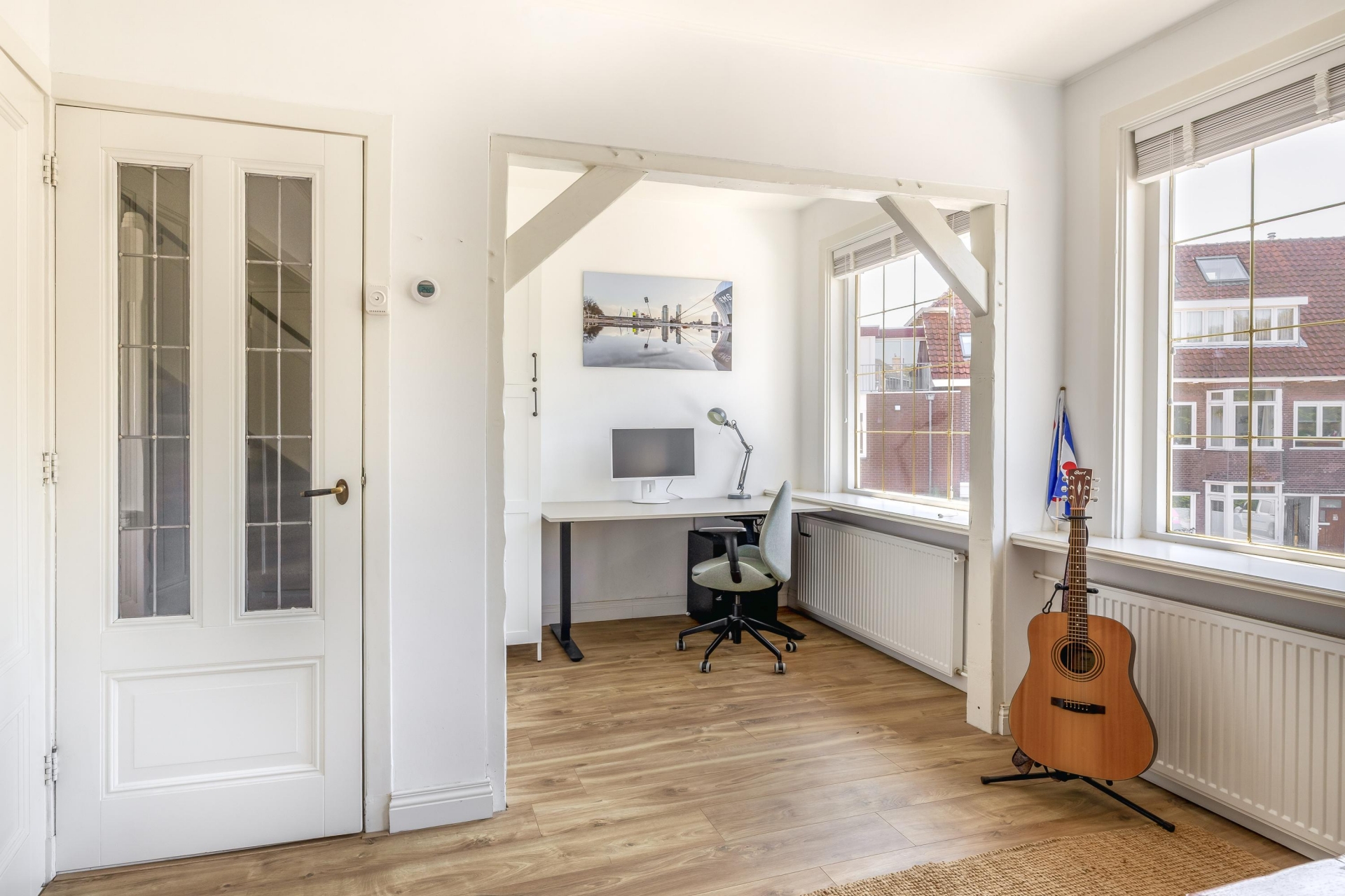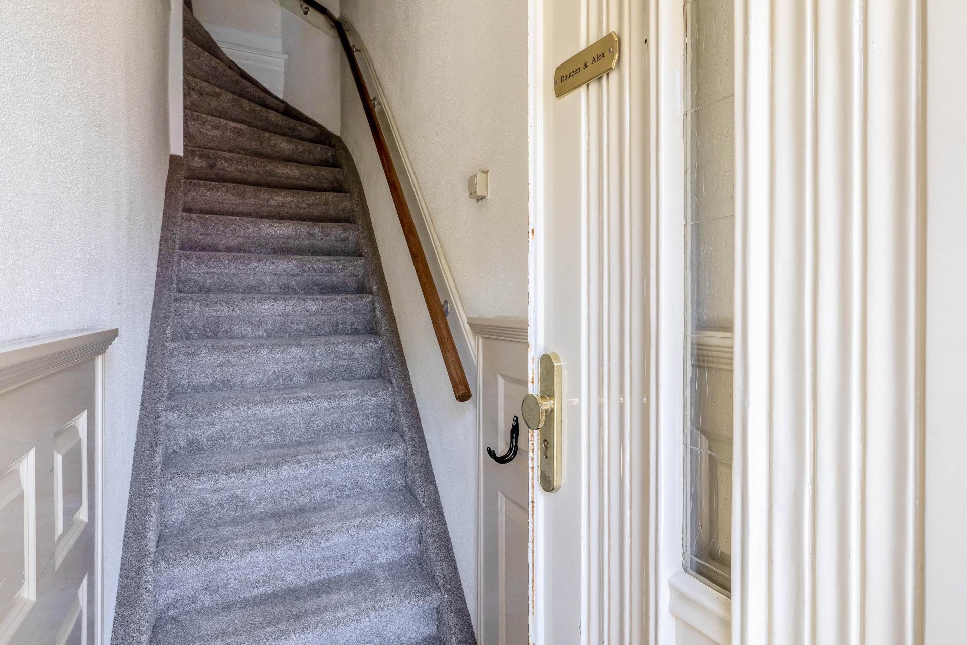 De woonkamer op de eerste verdieping is een sfeervolle en lichte leefruimte, met originele glas-in-lood en suite deuren die de zit- en eethoek op een karakteristieke manier van elkaar scheiden. De voormalige zijkamer is bij de woonkamer getrokken, waardoor er een fijne werkplek is ontstaan, ideaal voor wie regelmatig thuis werkt. De klassieke elementen worden moeiteloos gecombineerd met een moderne afwerking: begin 2025 is vrijwel het hele appartement onder handen genomen. Alleen de keuken en het toilet op deze verdieping zijn niet onder handen genomen, maar dat geeft je meteen de kans om daar je eigen draai aan te geven.