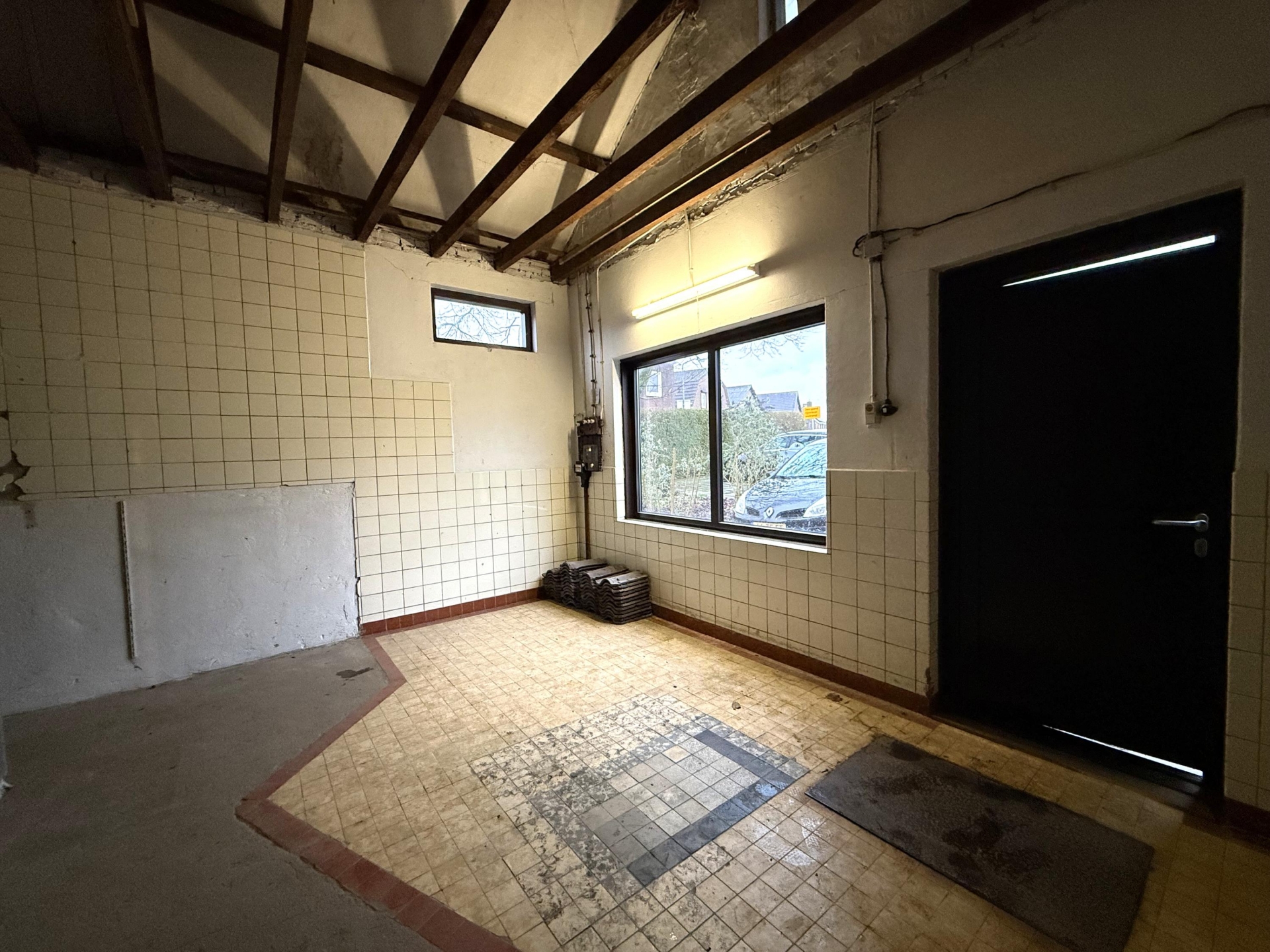 Het dak heeft in het verleden een lekkage gehad. De dakpannen zijn hersteld en het dak is op dit moment waterdicht, maar toekomstig onderhoud moet worden meegenomen in de plannen. Voor een handige koper of investeerder biedt dat ruimte om het gebouw verder te optimaliseren.