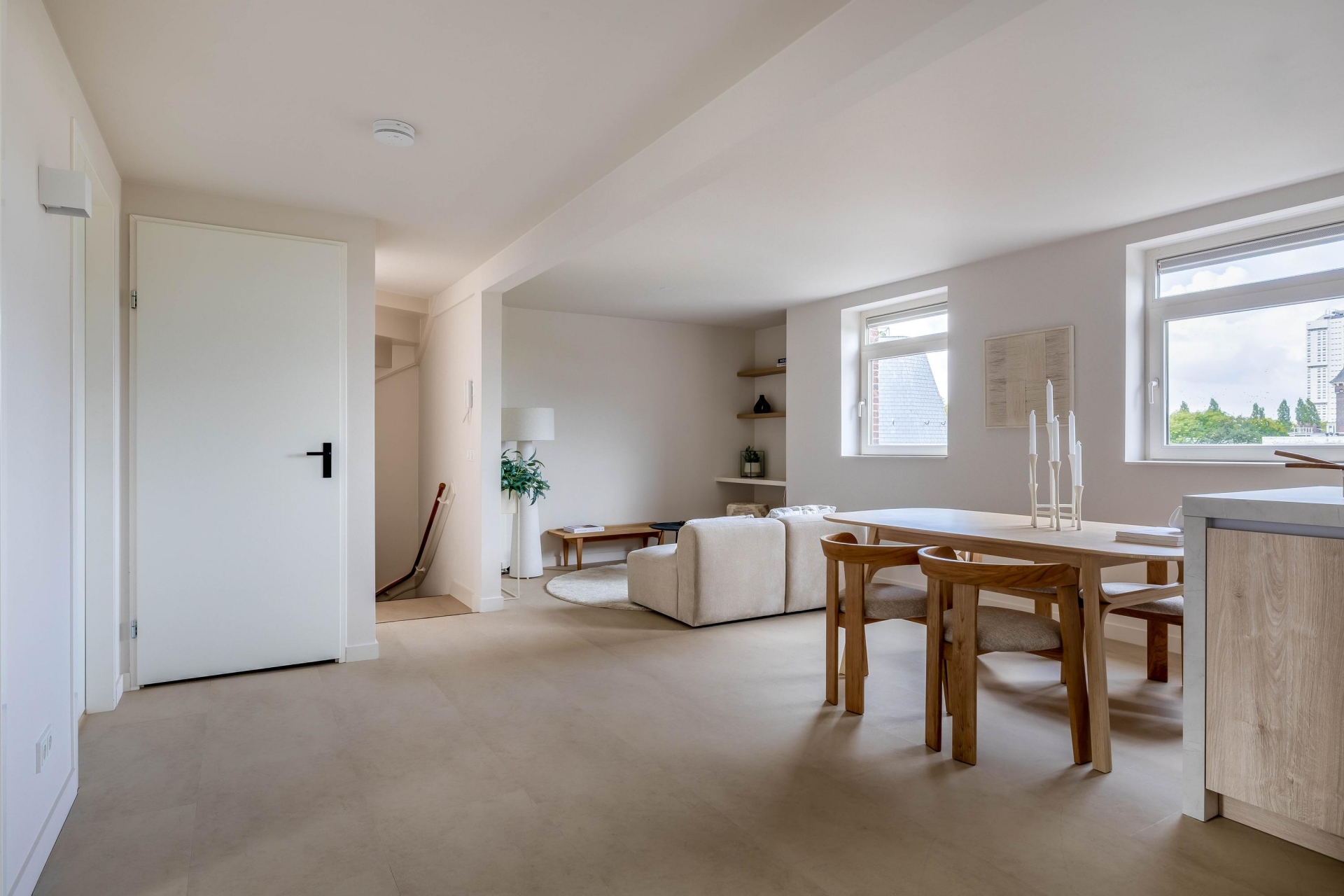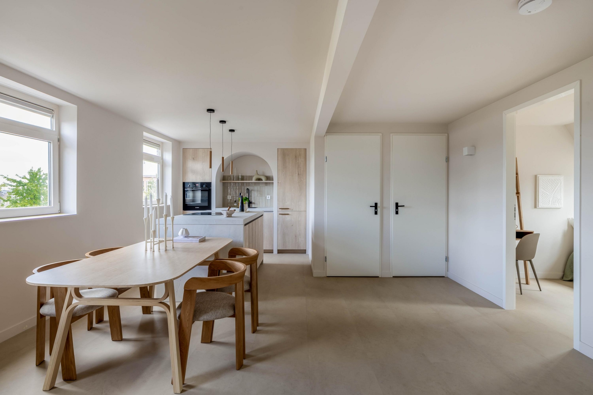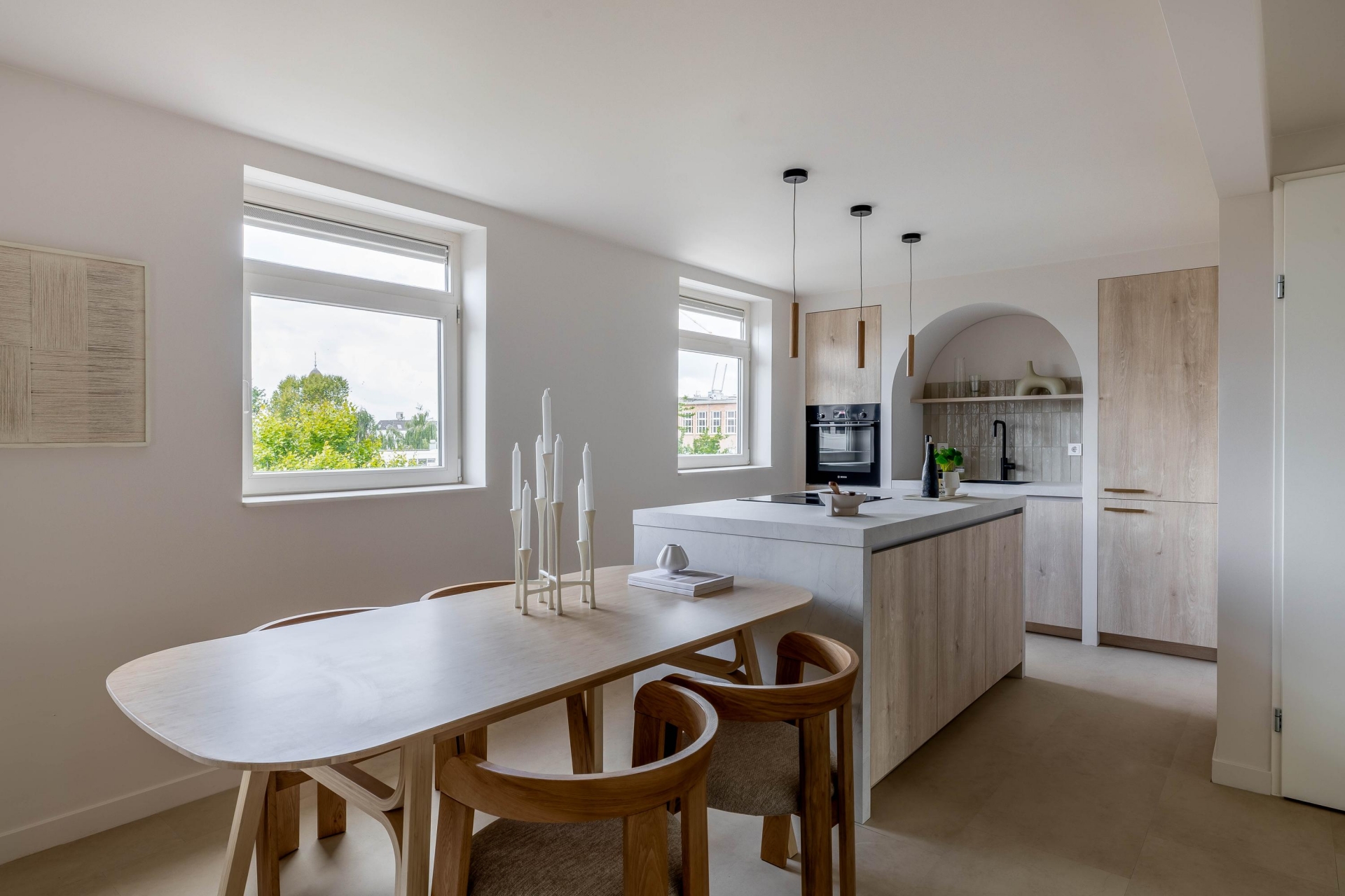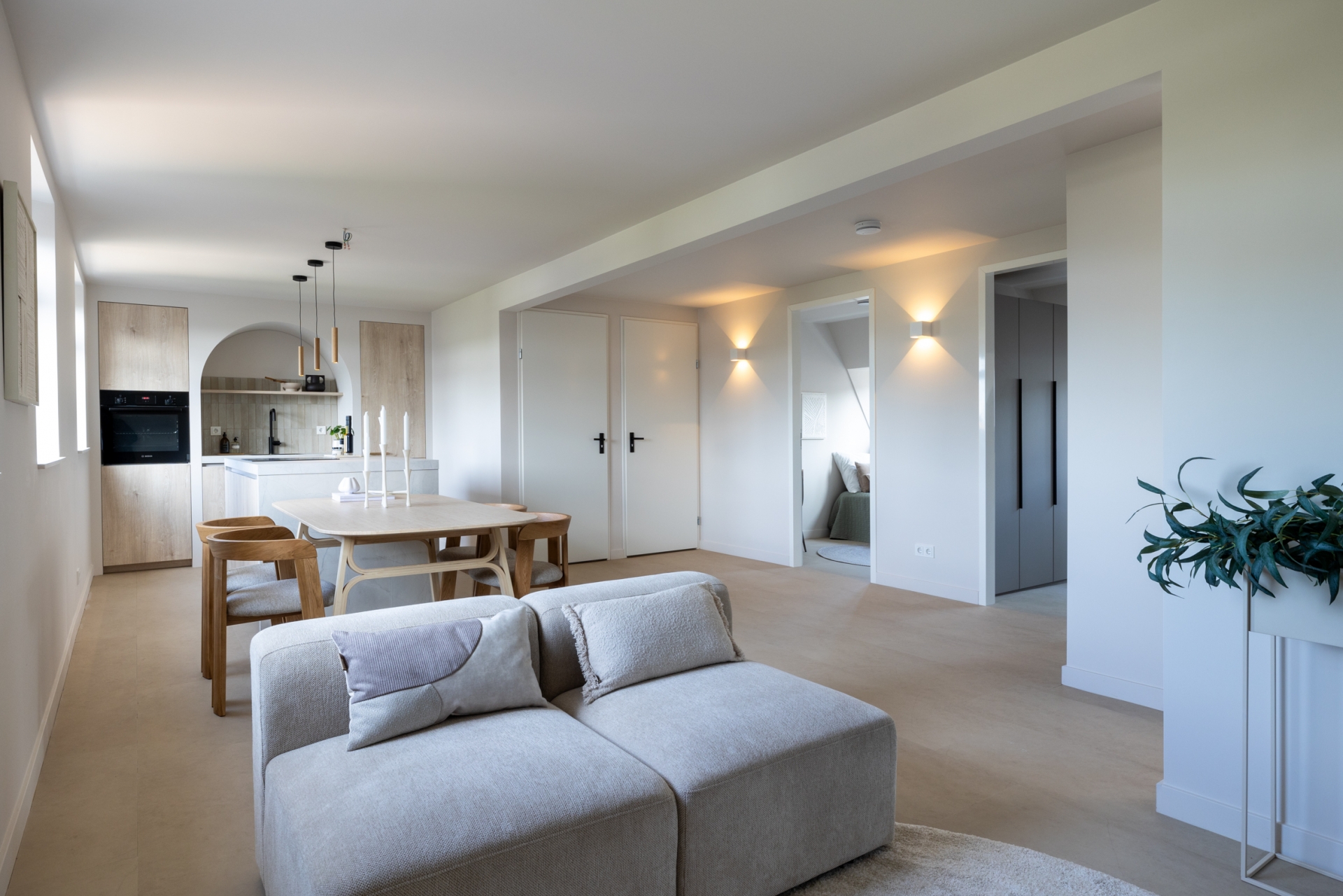 De woonkamer ligt aan de voorzijde en wordt gekenmerkt door veel lichtinval en een moderne uitstraling. Dankzij de strakke afwerking in lichte tinten en de pvc-vloer oogt de ruimte warm en eigentijds. Het kookeiland met geïntegreerde afzuigkap vormt het hart van de ruimte: hier kook je gezellig terwijl je in contact blijft met je gasten of het gezin. De keuken is natuurlijk van alle gemakken voorzien met moderne Bosch inbouwapparatuur en hoogwaardige afwerking en ingebouwde ledverlichting. Voorzien van een nieuw home smart licht systeem. Daarnaast is er een aparte werkruimte/zitje gecreëerd in de nis van de woonkamer.