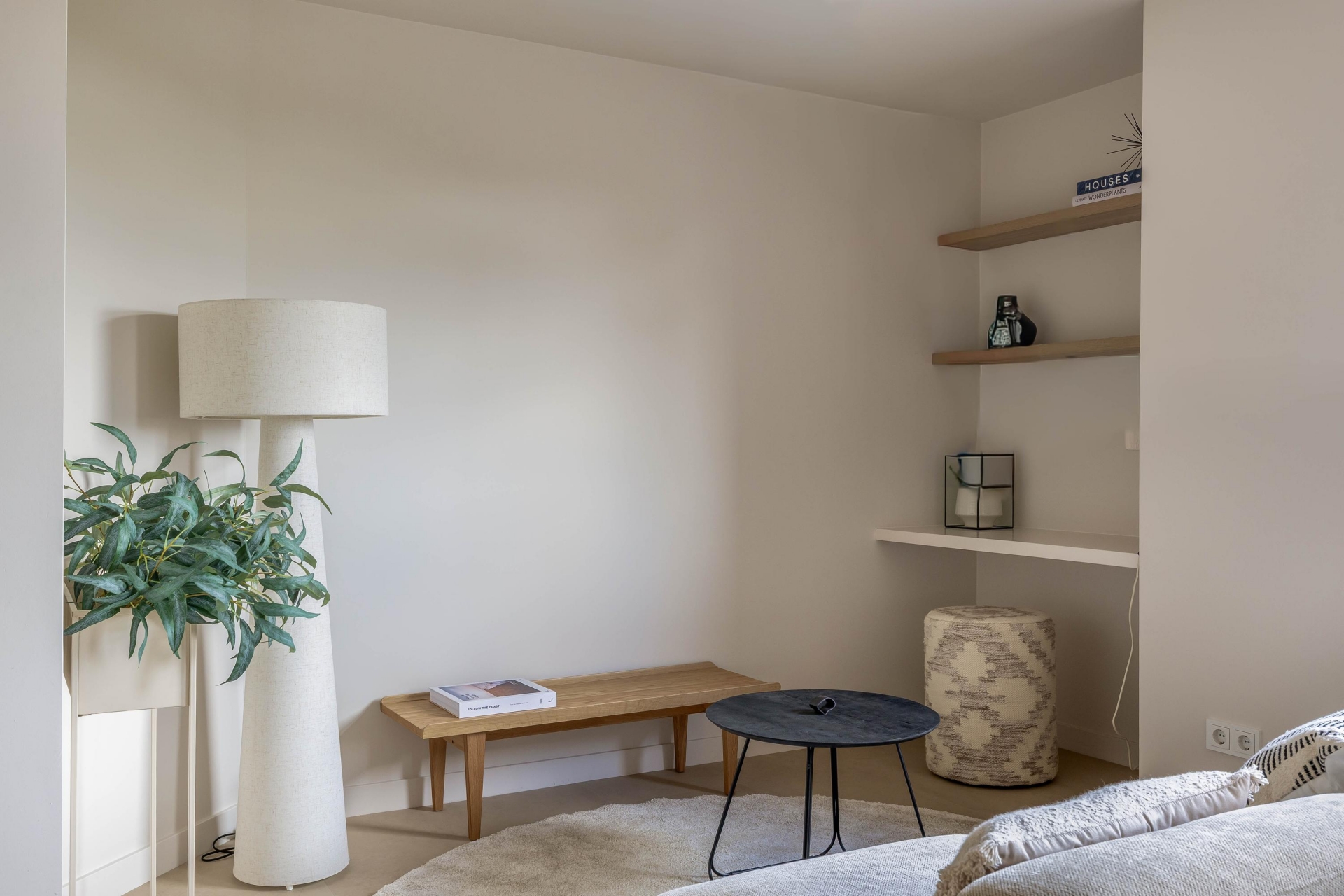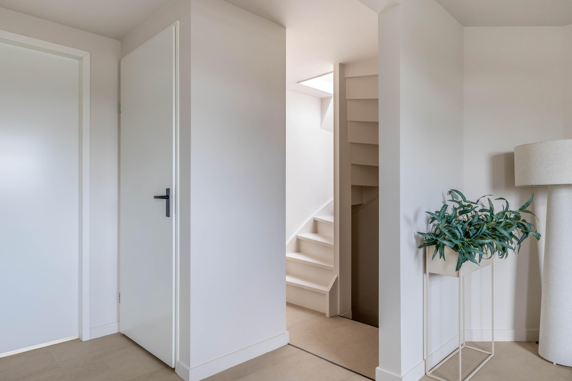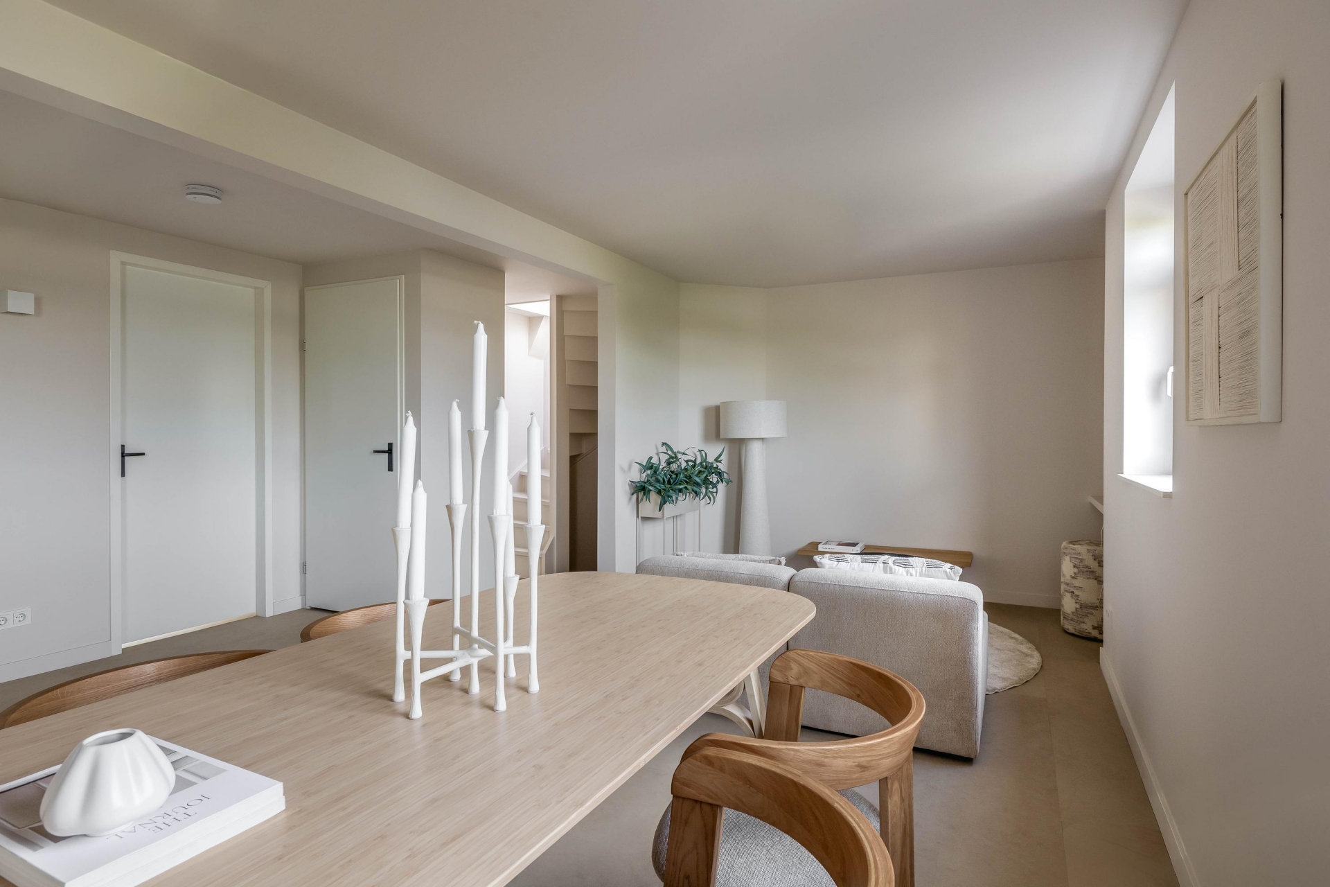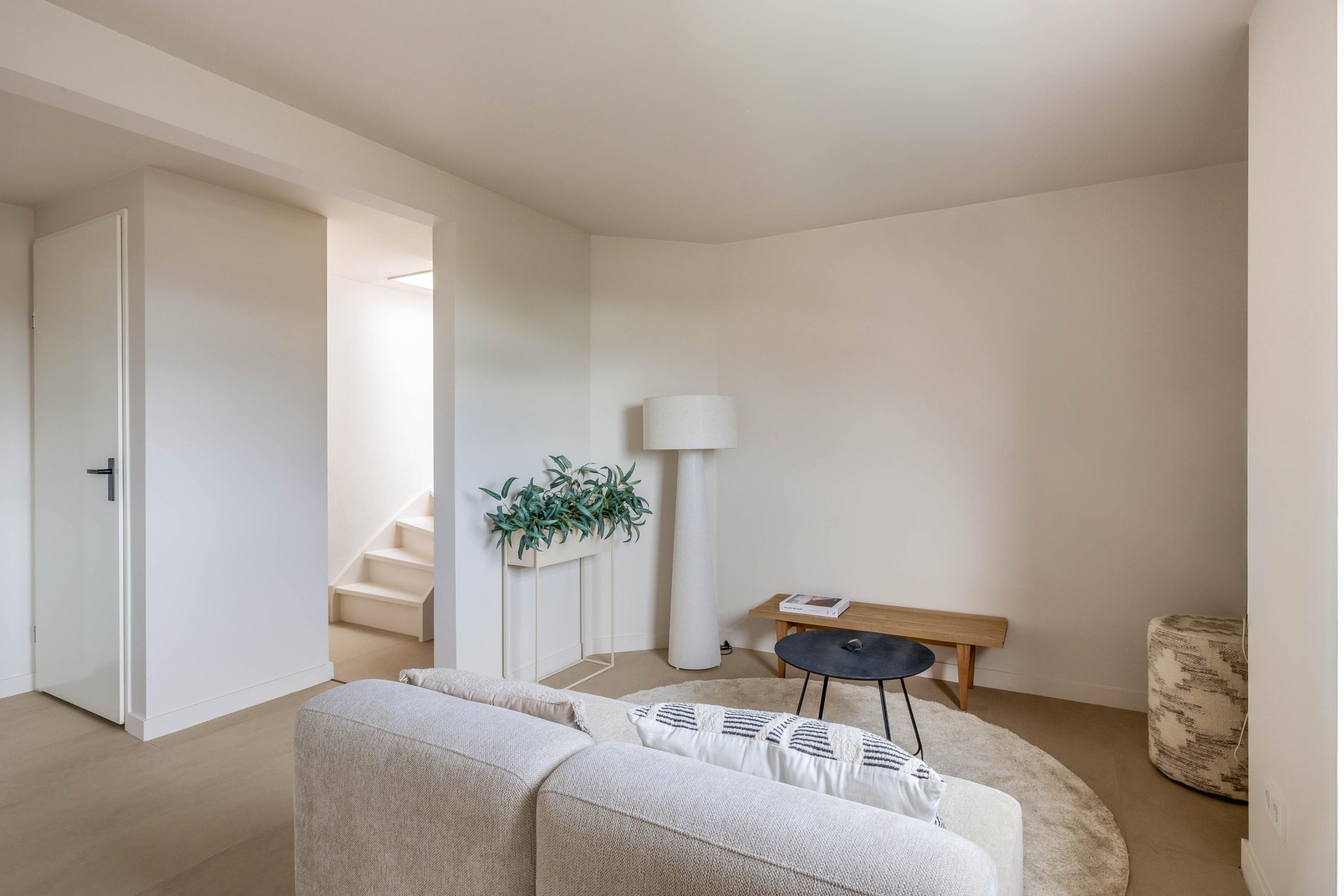 De woonkamer ligt aan de voorzijde en wordt gekenmerkt door veel lichtinval en een moderne uitstraling. Dankzij de strakke afwerking in lichte tinten en de pvc-vloer oogt de ruimte warm en eigentijds. Het kookeiland met geïntegreerde afzuigkap vormt het hart van de ruimte: hier kook je gezellig terwijl je in contact blijft met je gasten of het gezin. De keuken is natuurlijk van alle gemakken voorzien met moderne Bosch inbouwapparatuur en hoogwaardige afwerking en ingebouwde ledverlichting. Voorzien van een nieuw home smart licht systeem. Daarnaast is er een aparte werkruimte/zitje gecreëerd in de nis van de woonkamer.