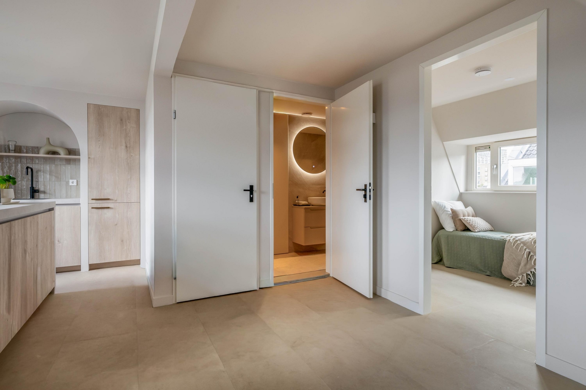 De badkamer is strak en modern ingericht in lichte tinten en voorzien van een ruime inloopdouche en stijlvol wastafelmeubel. Hier begint en eindigt je dag in comfort.