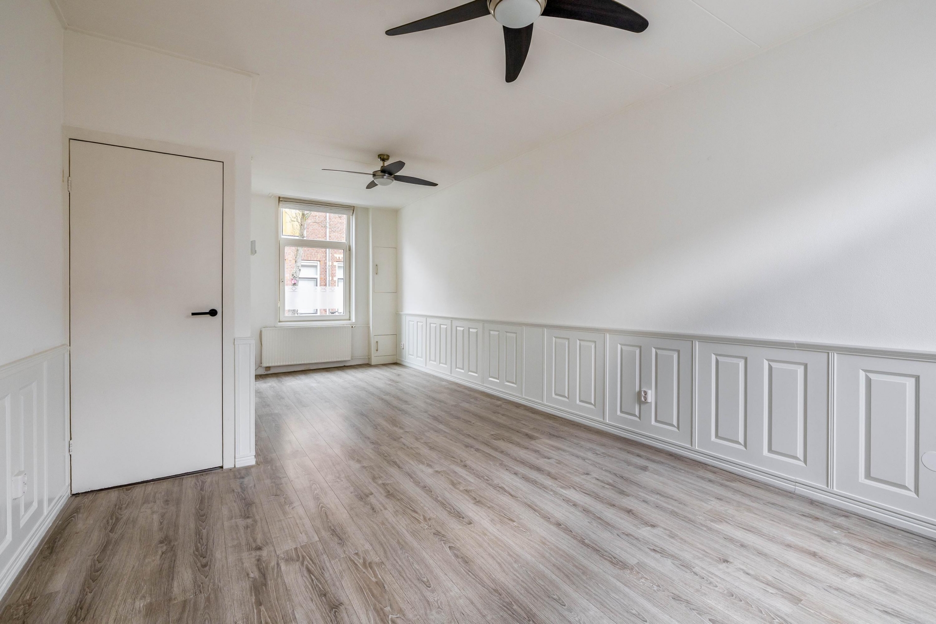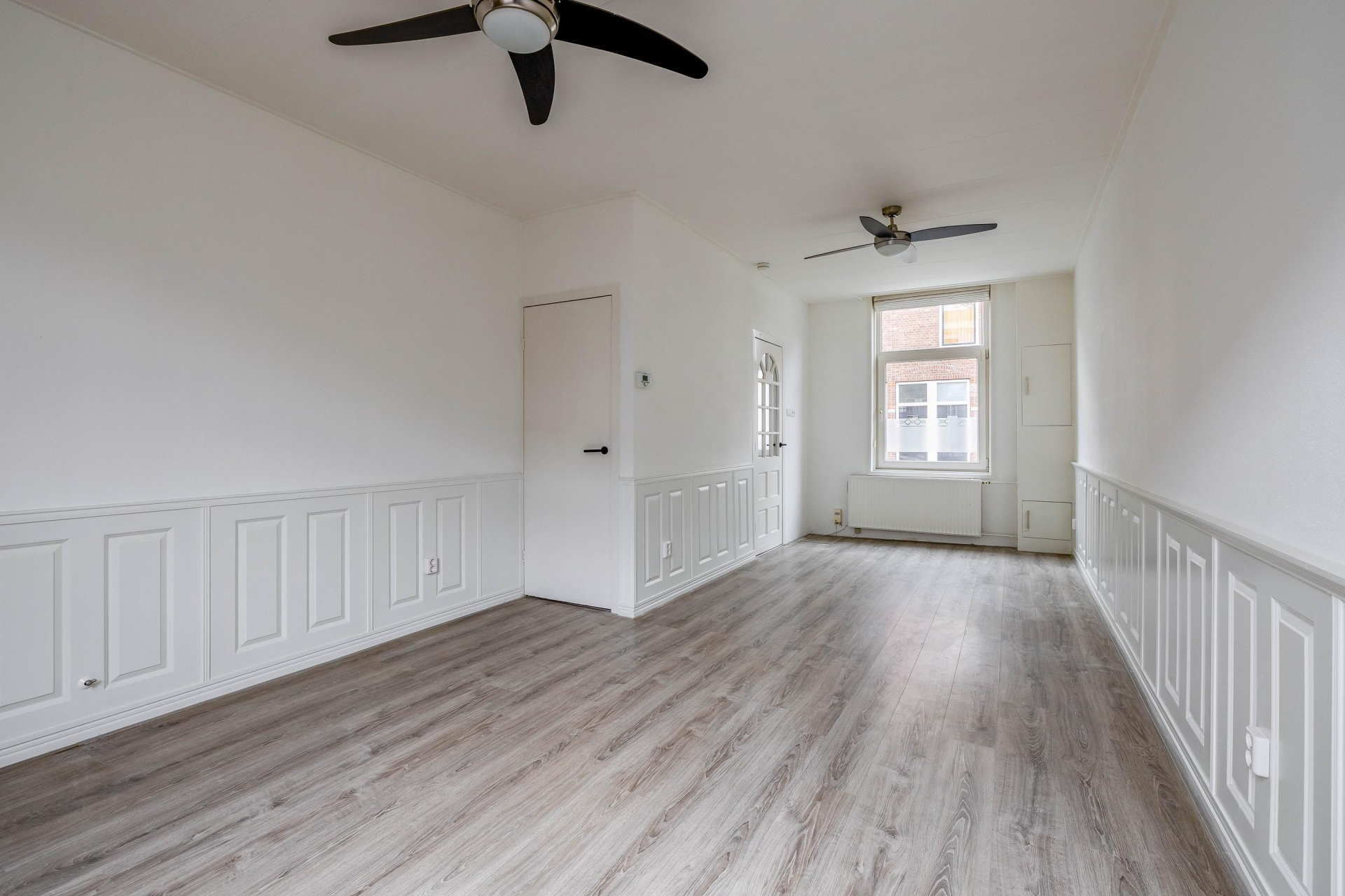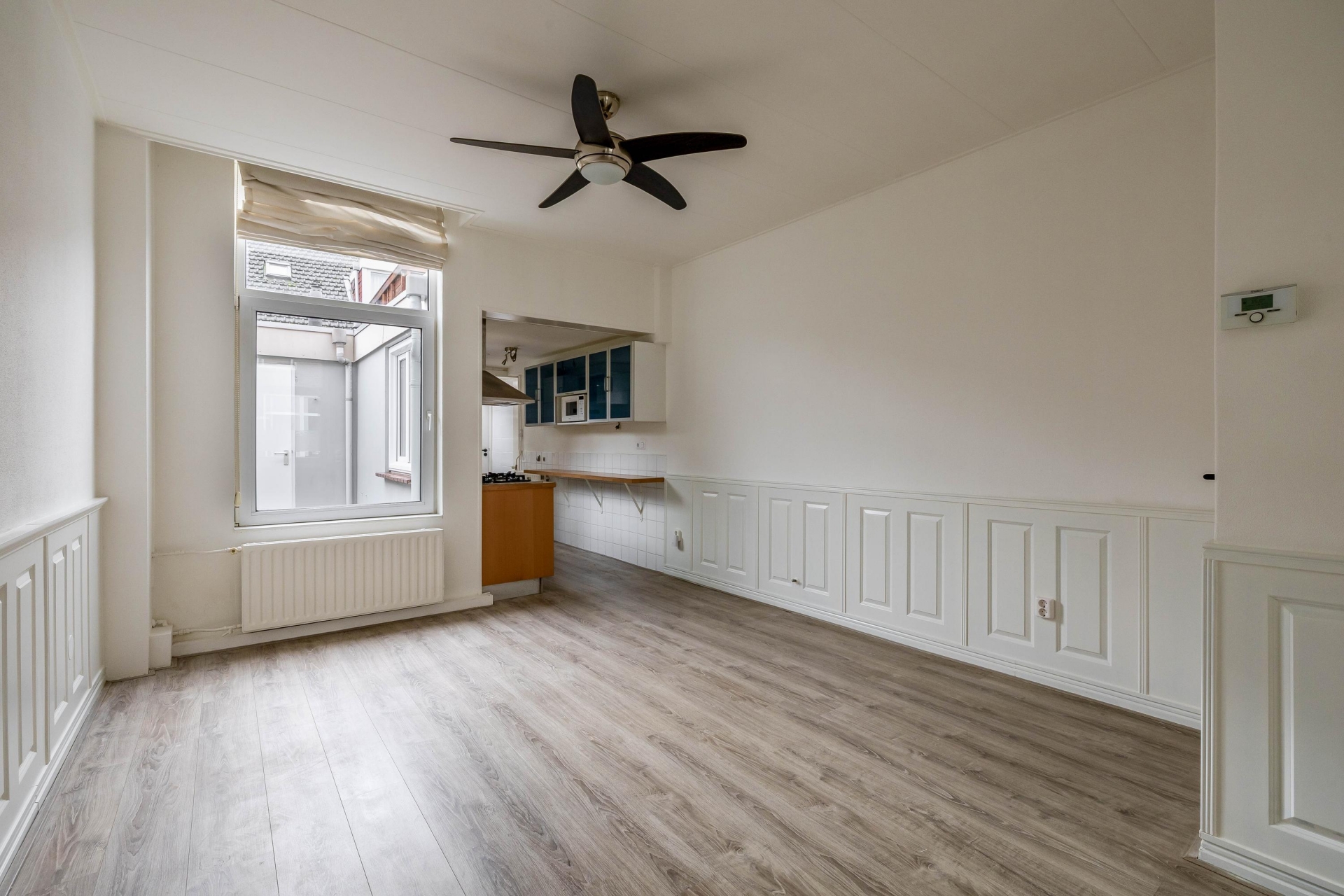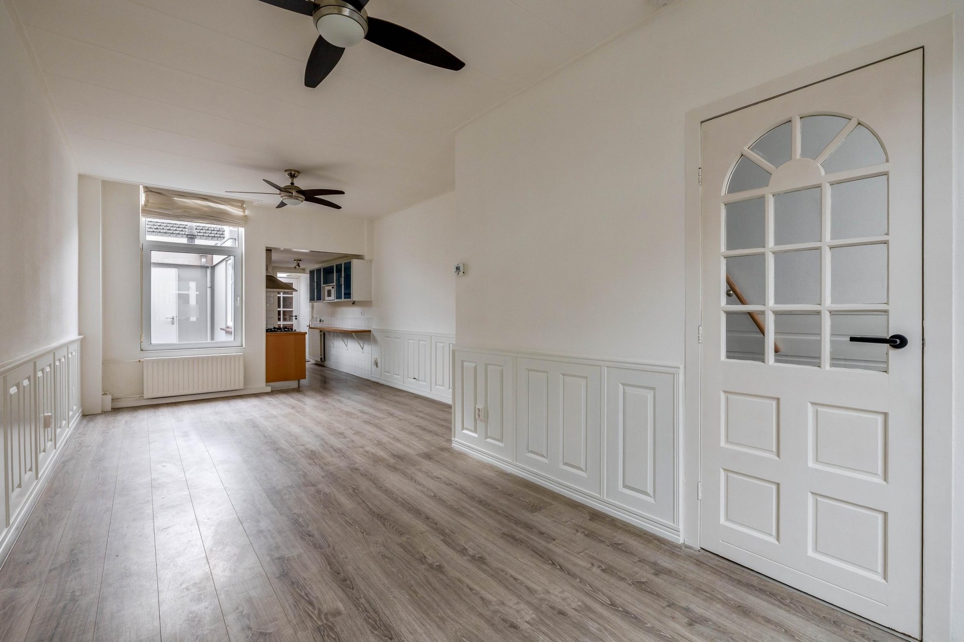 Via de entree kom je in de hal met trapopgang naar de eerste verdieping. De woonkamer is praktisch ingedeeld en biedt voldoende ruimte voor zowel een gezellige zithoek als een eethoek. De nette laminaatvloer en het glasvezelbehang zorgen voor een verzorgde uitstraling. Dankzij de raampartijen komt er prettig daglicht binnen. Extra handig is de trapkast, ideaal voor provisie of extra bergruimte. Hier woon je comfortabel, met een indeling die logisch en prettig aanvoelt.
