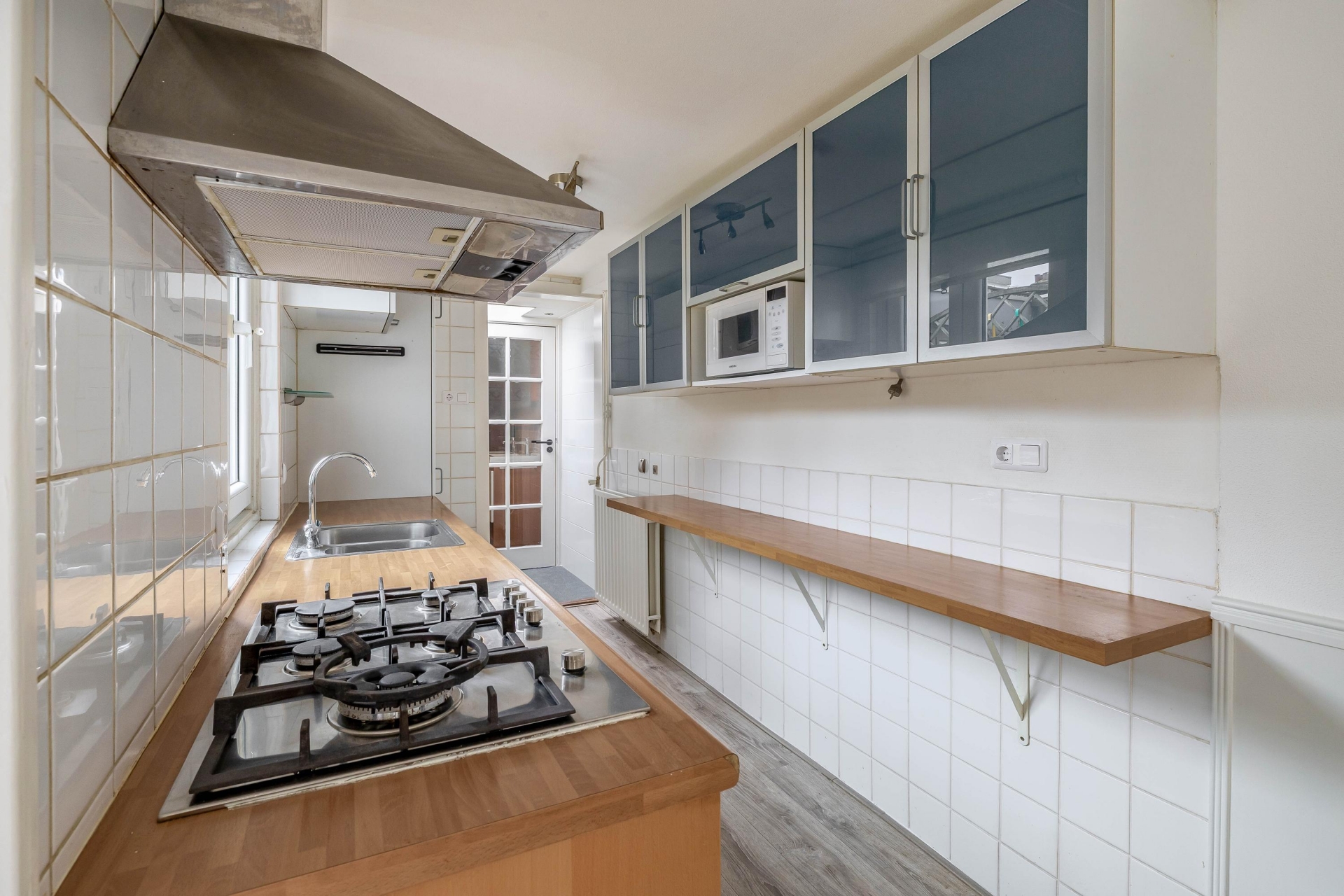 Aan de achterzijde van het huis bevindt zich de verzorgde keuken. Deze is uitgevoerd met een 5-pits gaskookplaat, RVS afzuigkap, combi-oven, koel-/vriescombinatie en diverse onder- en bovenkasten. Alles wat je nodig hebt om uitgebreid te koken of gewoon snel iets klaar te maken na een werkdag.