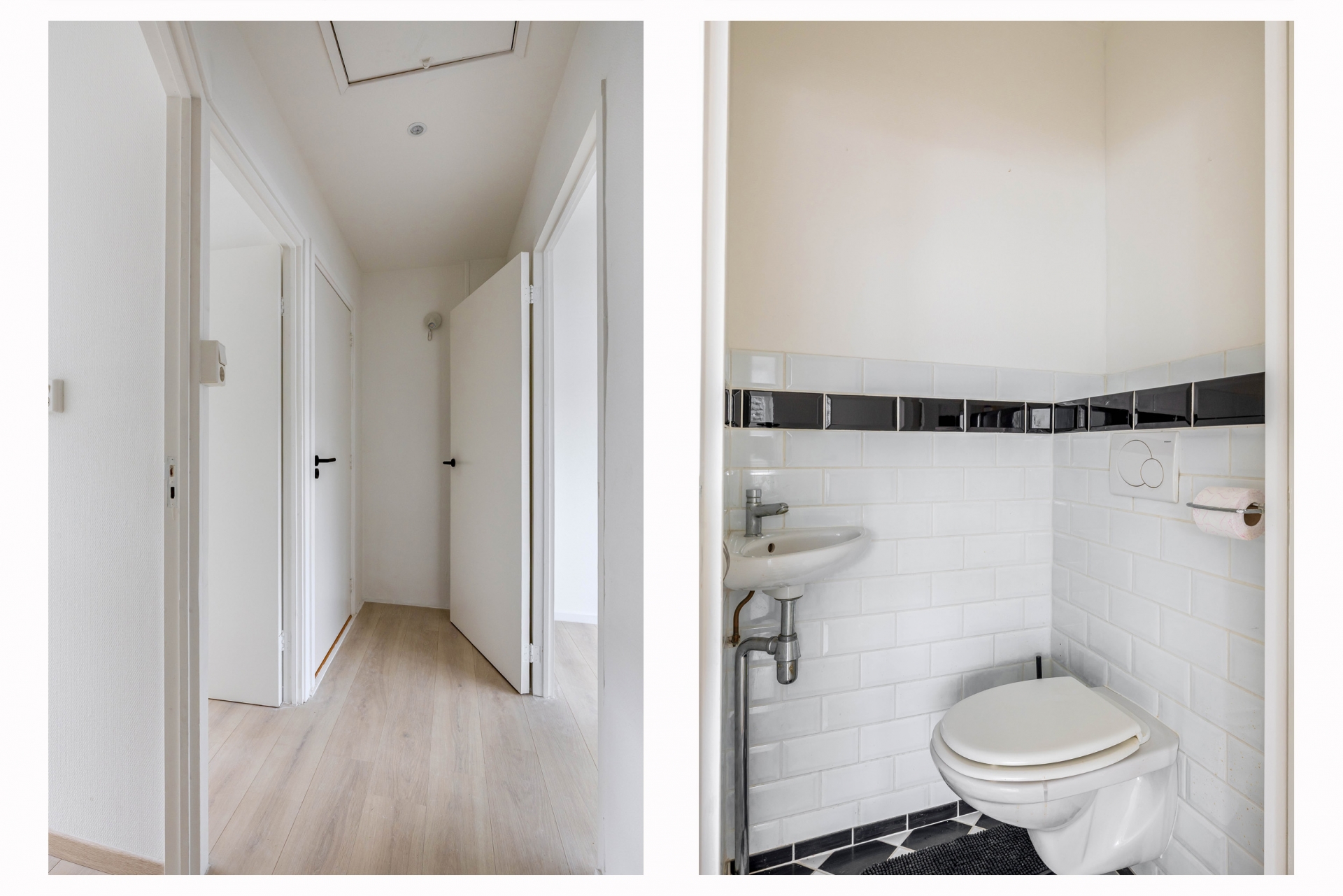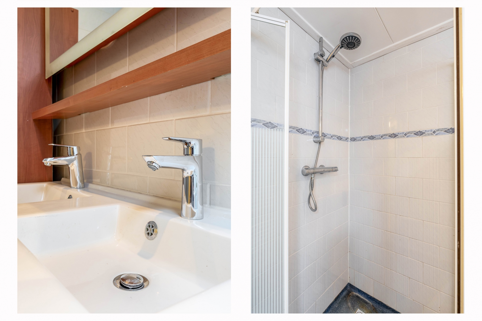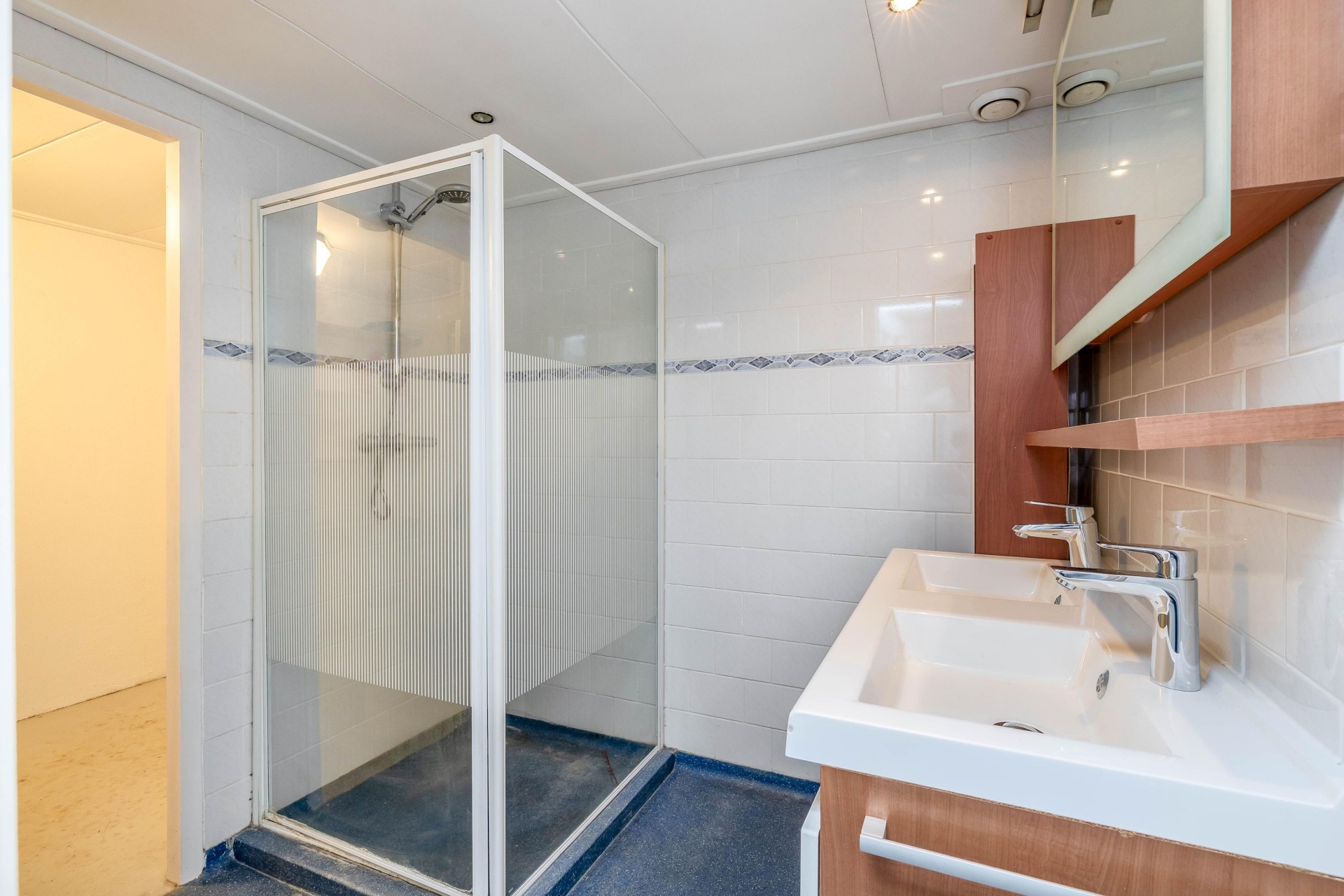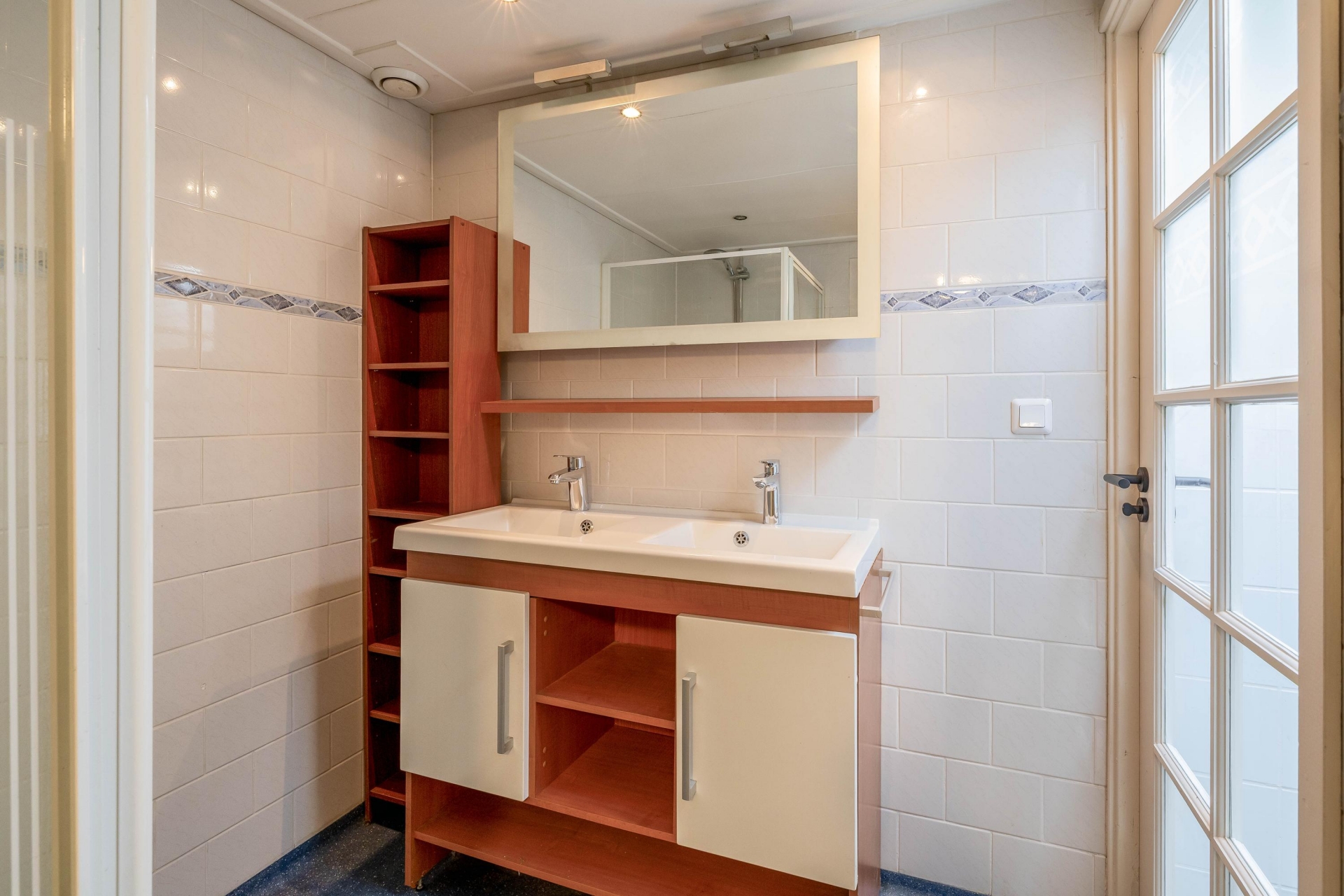 Via de tussenhal bereik je het gedeeltelijk betegelde toilet met hangend closet. De badkamer is volledig betegeld en netjes afgewerkt met een dubbele wastafel, douchecabine met thermostaatkraan, designradiator en een strakke epoxyvloer. Een moderne en praktische ruimte waar je iedere dag comfortabel start.